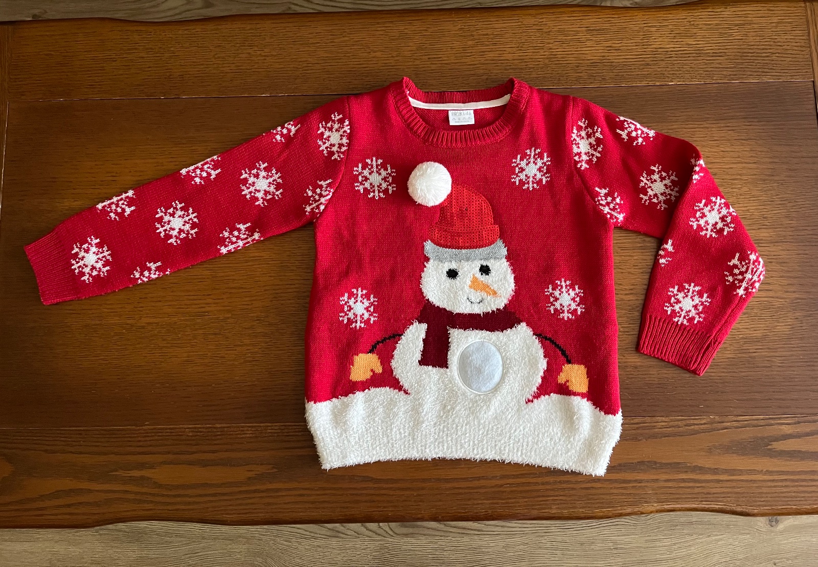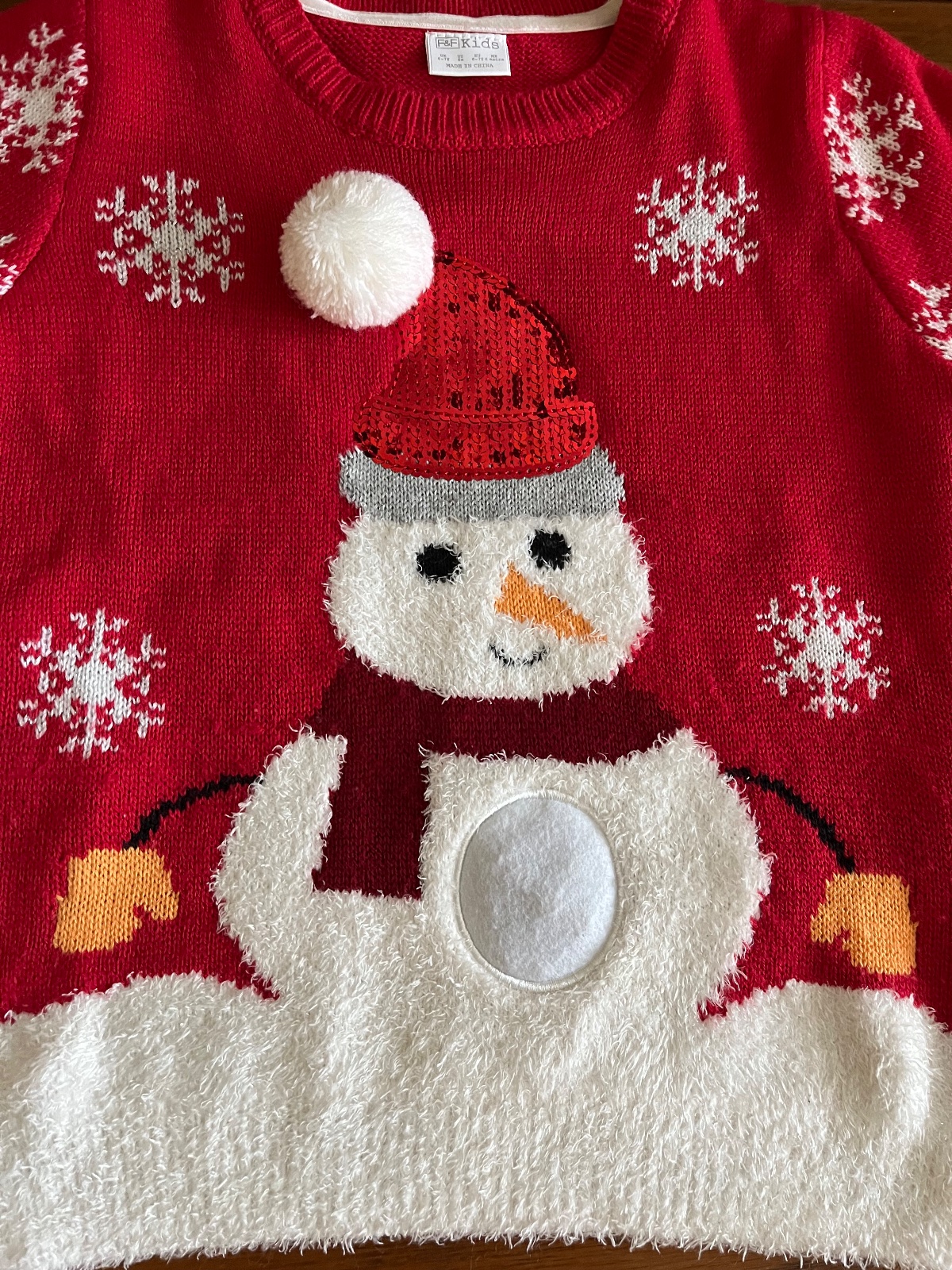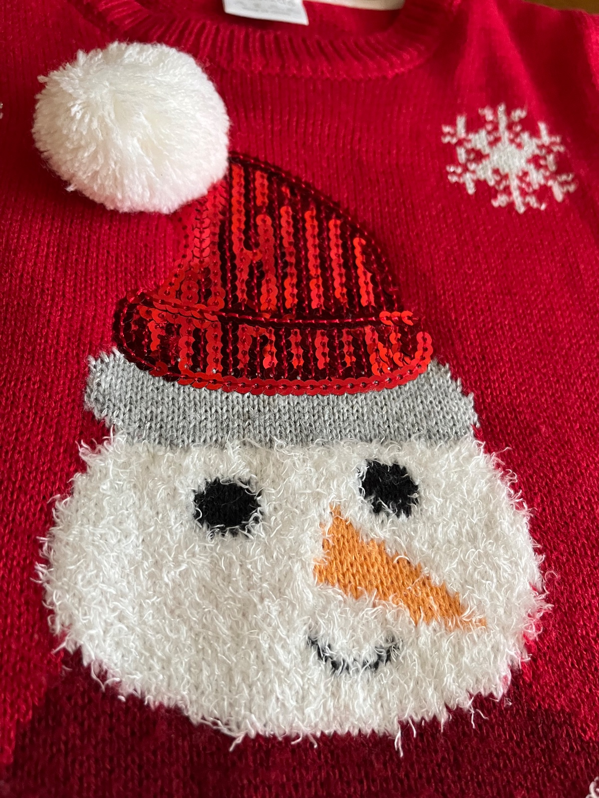 Super stav, párkrát oblečený pulóvrik so snehuliakom. Pekné 3D detaily brmbolcov, šálika, čiapky, kombinácia viacerých druhov pleteniny.