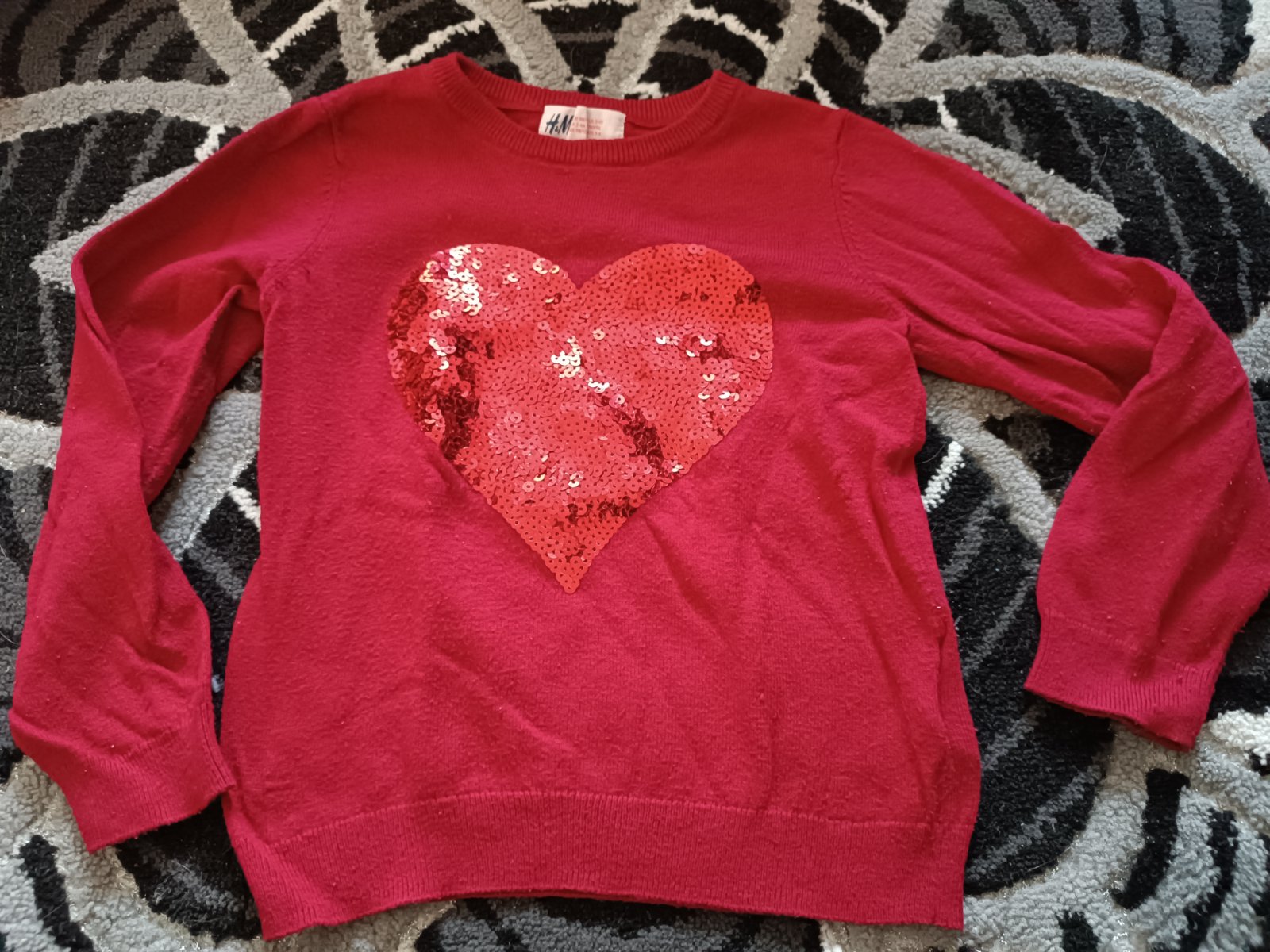 Jemný, tenký pulóver, zadná časť je dlhšia, nepoškodený, flitre neopadávajú. Veľkosť 98/104, no skor tá 104, nositelný dlhšie