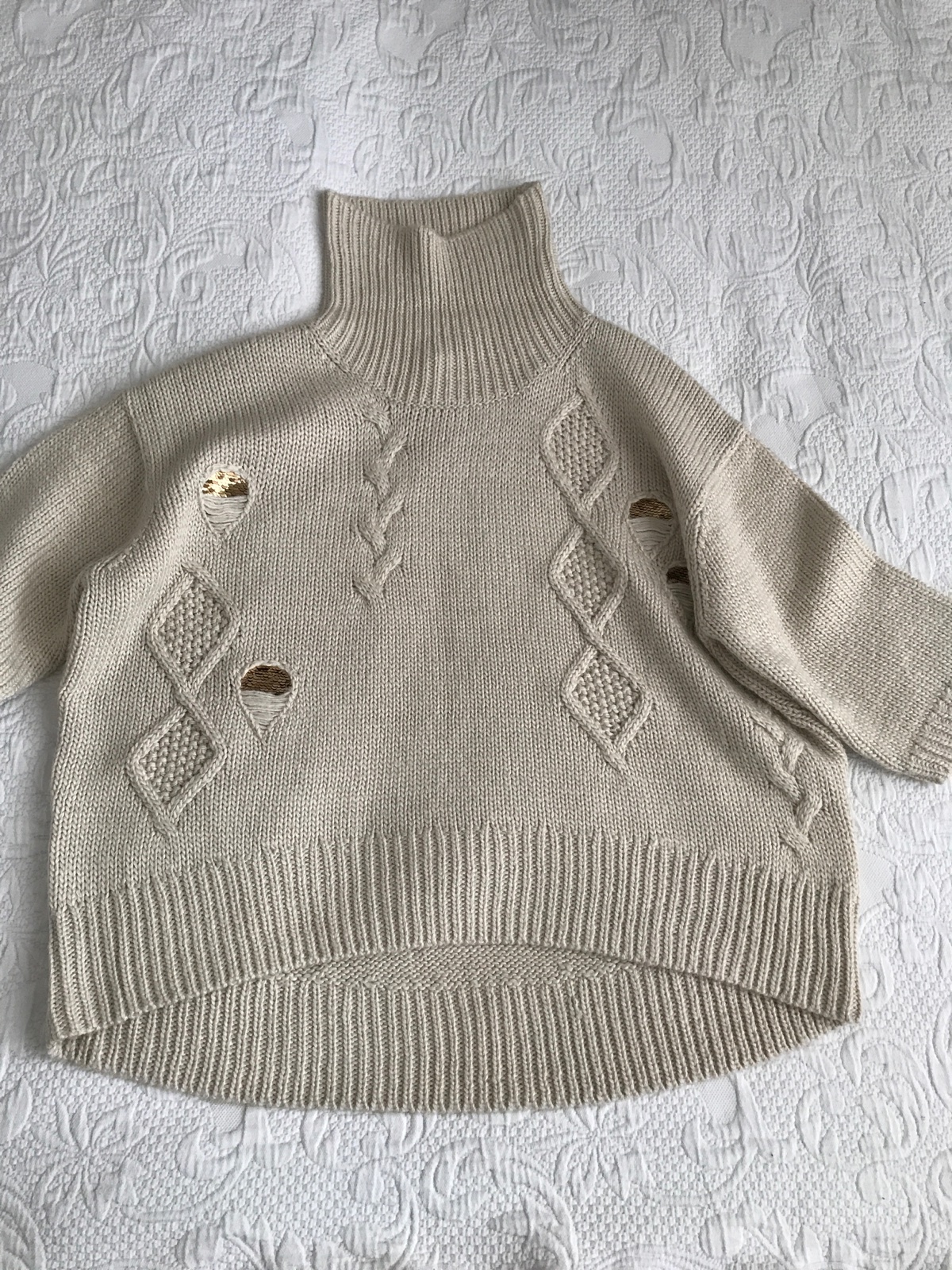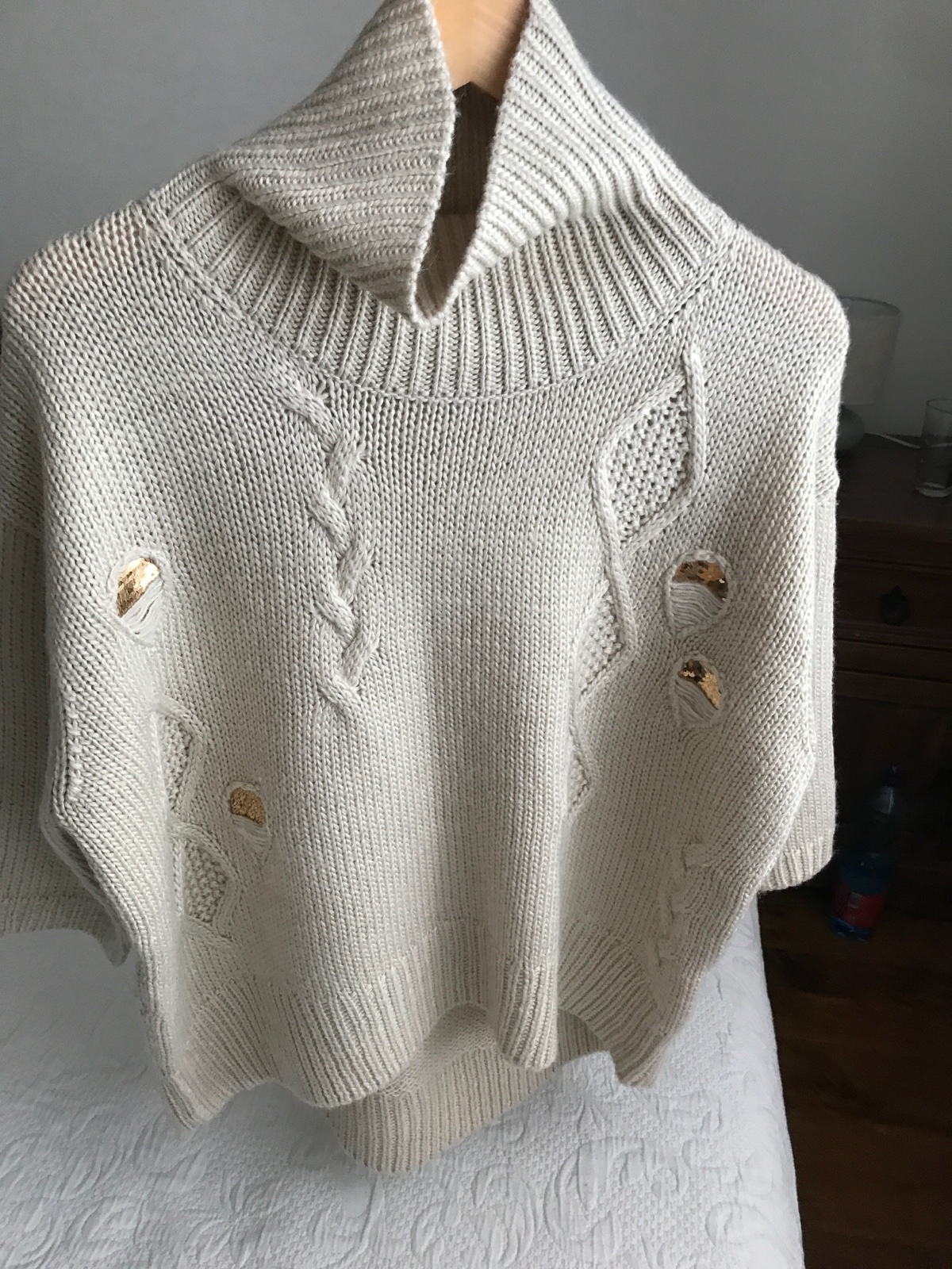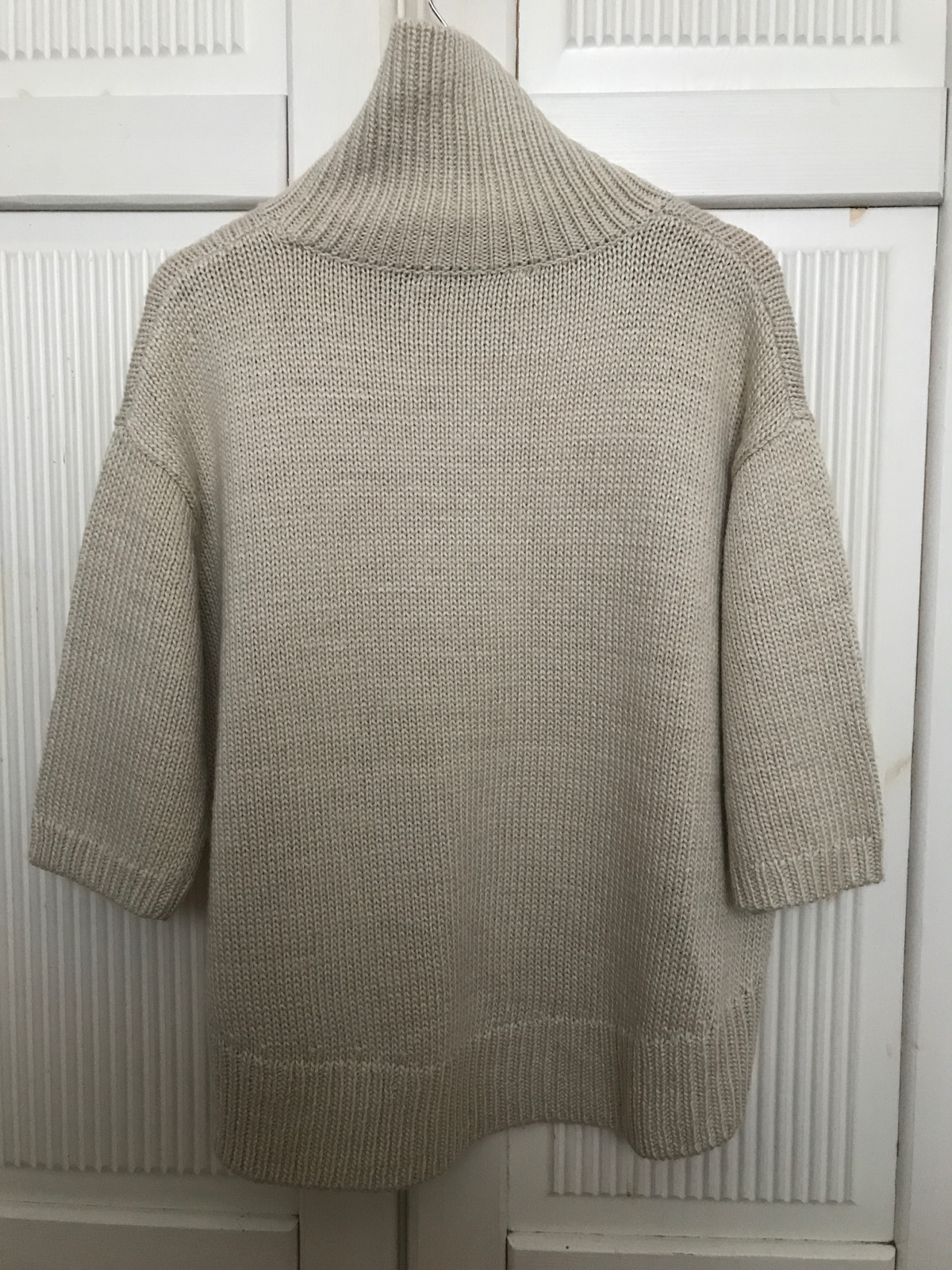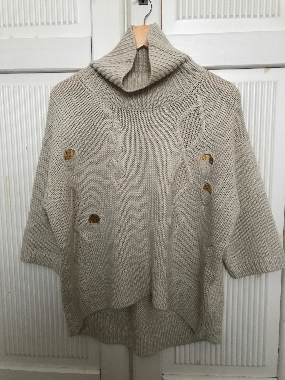 Bezchybny pulovrik netradicneho strihu, s tristvrtovymi rukavmi, krasne pleteny, sadne aj vacsim velkostiam nakolko je elasticky