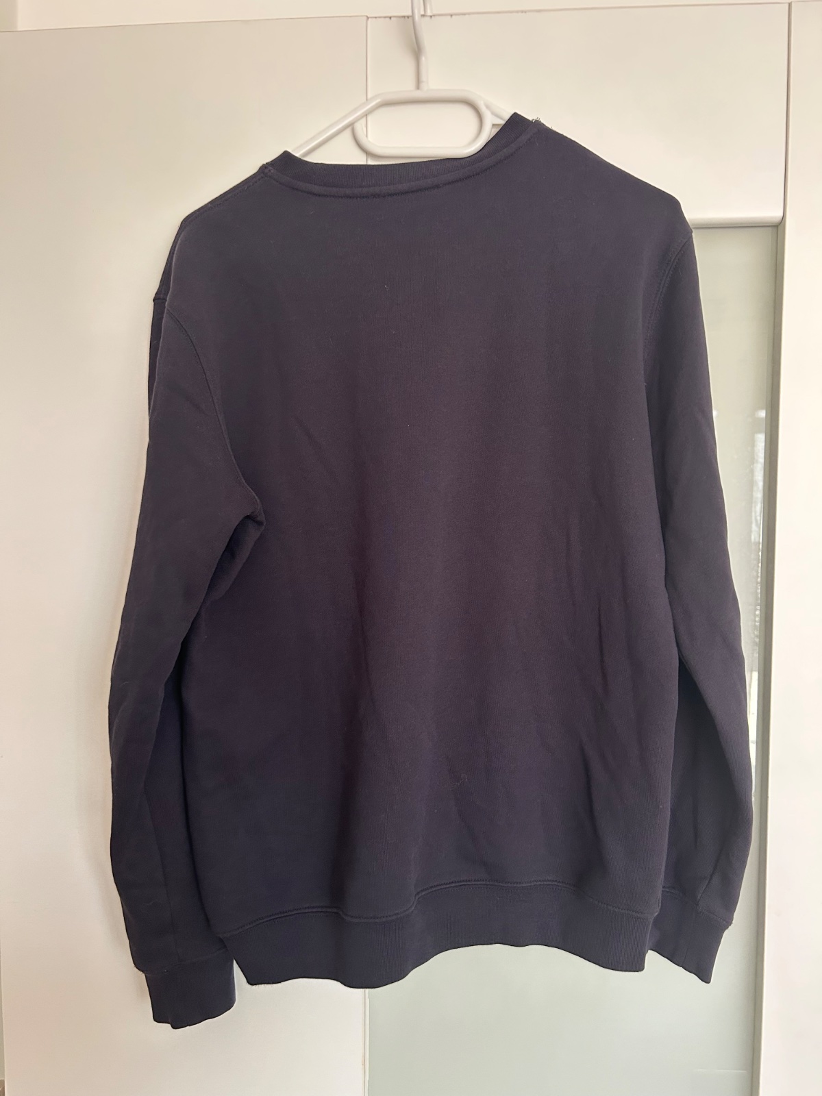 Pekný nosený stav, tmavomodrá farba presne ako na titulnej fotke (tak 9 z 10), modrý nápis, v písmenku O je svetlejšia farba, pri nosení nevidieť, PC: 99€, dl.62, š.54, rukáv 14+61