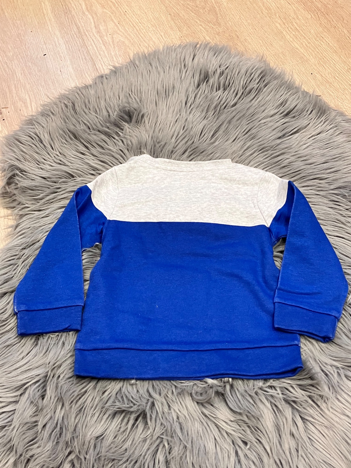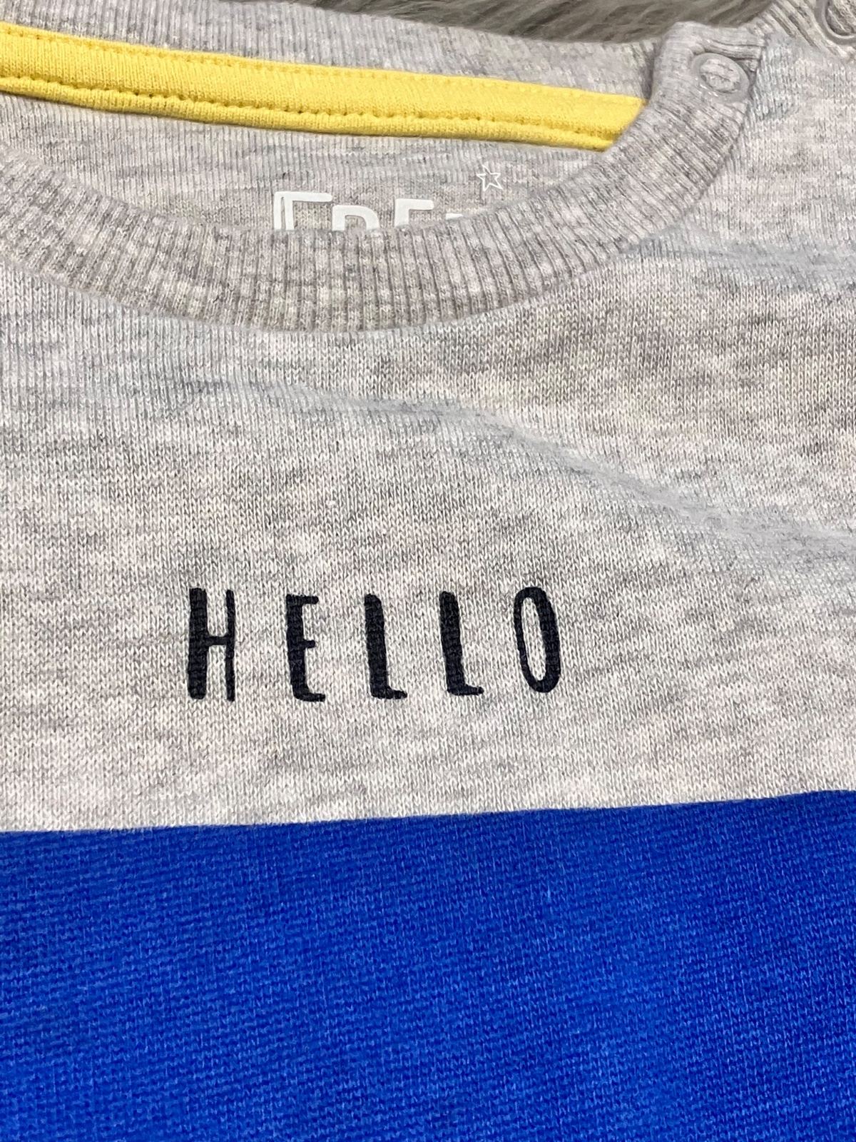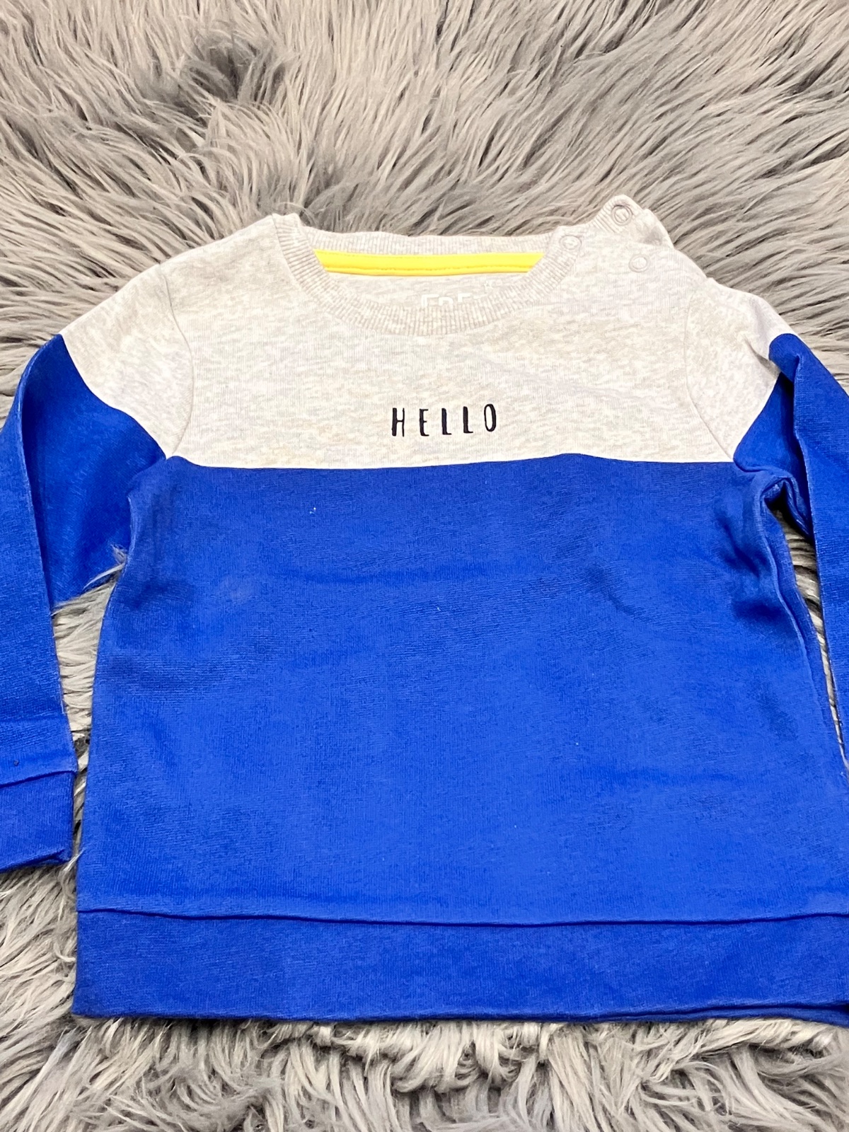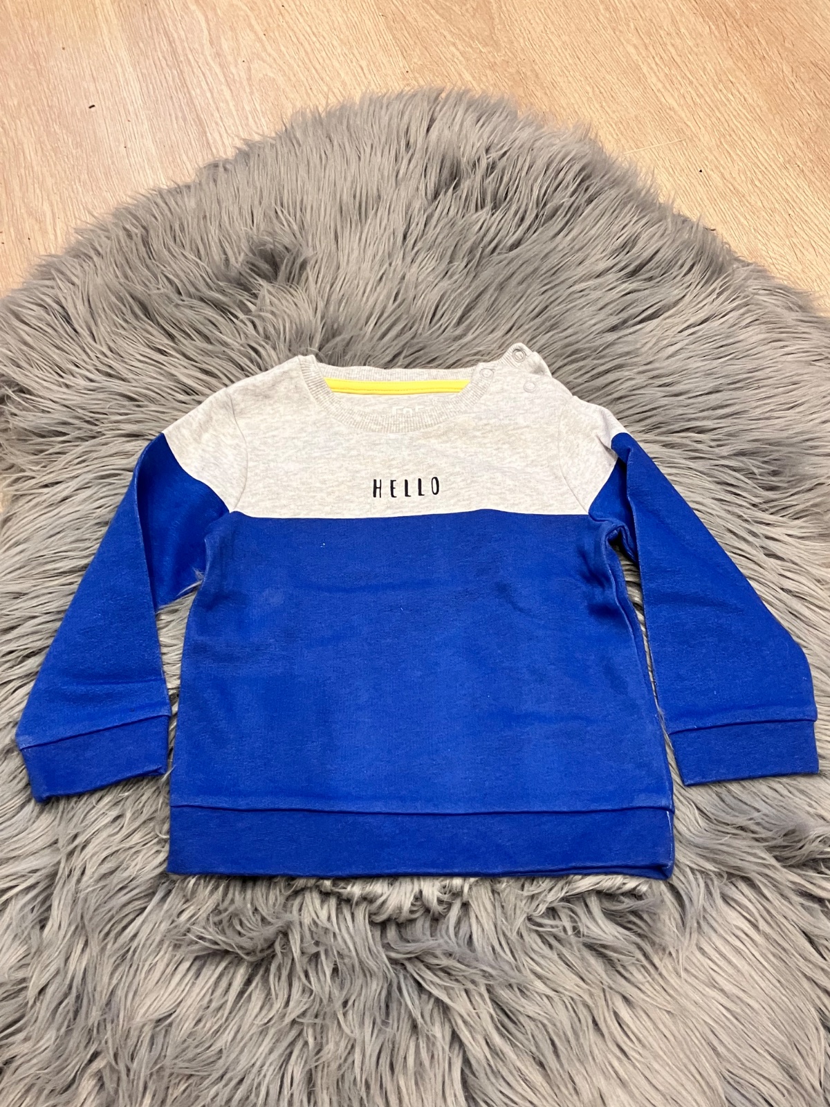 Chlapčenská mikina s nápisom Hello, zapínanie na ramene na dve cvoky, vo vnútri jemný flís, jemne elastická, farba modro-sivá, materiál 60%bavlna 40%polyester.