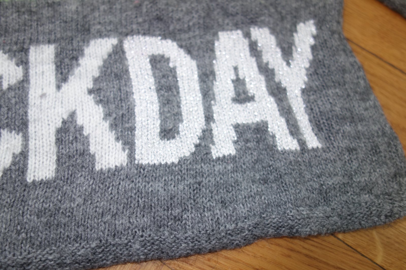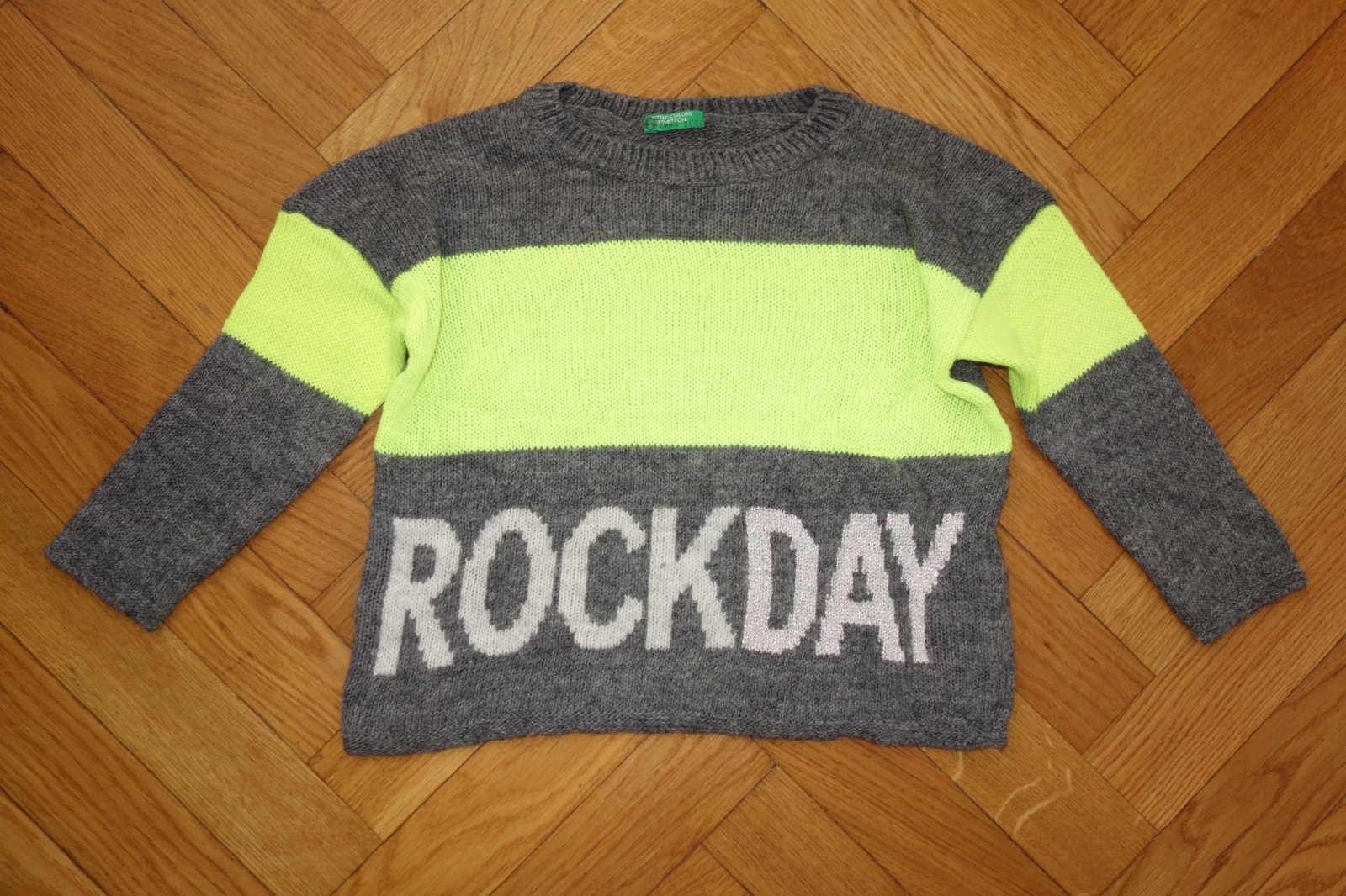 Výborný stav. Tmavošedá v kombinácii s krikľavožltou, nápis "day" obsahuje metalické vlákno. Dĺžka 37 cm, šírka pod pazuchami 2 x 38cm, rukáv od krku 40 cm.