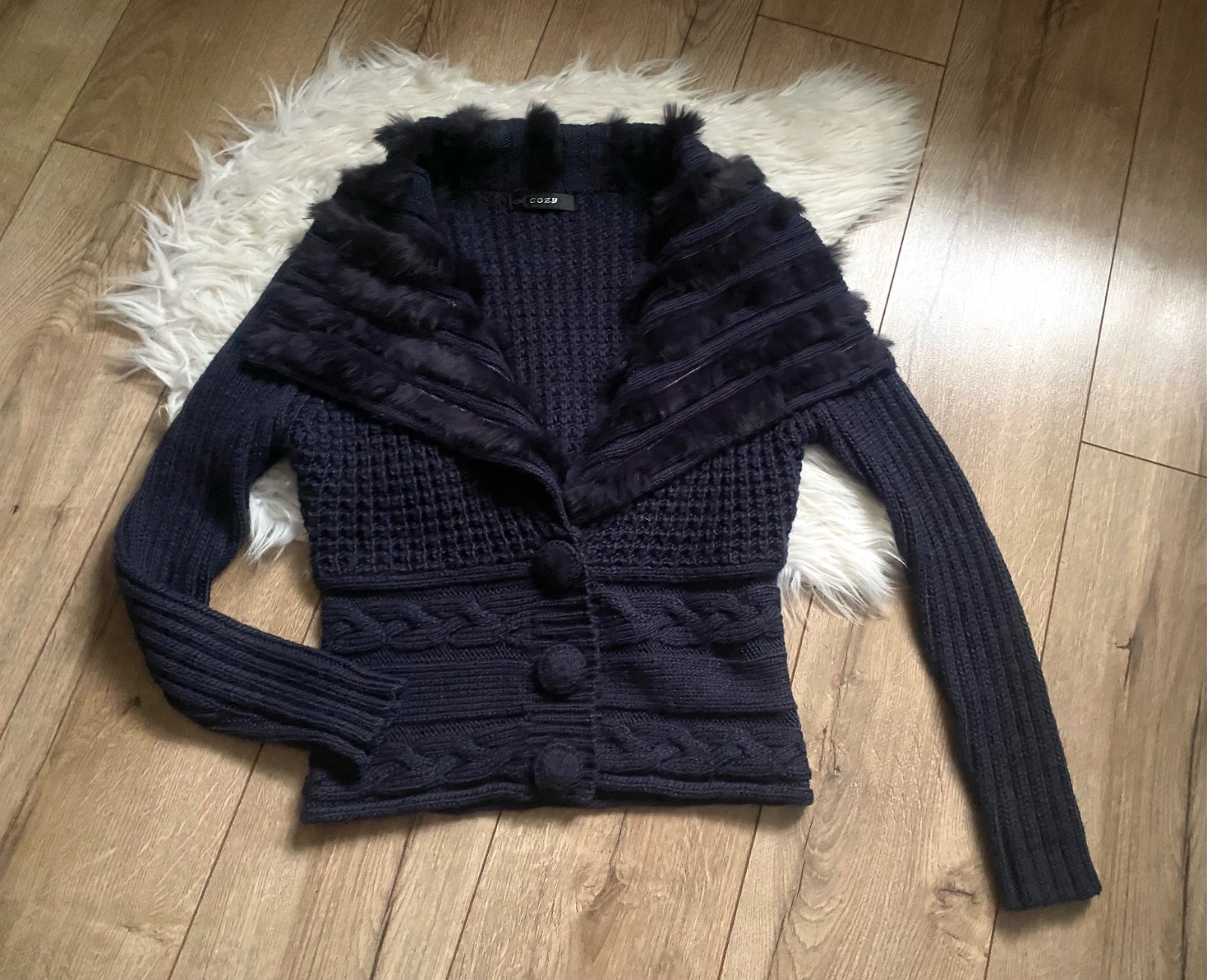 predam sveter tmavo orgovanovej farby v golierovej patentovej časti a na patentoch taka leskla priadza