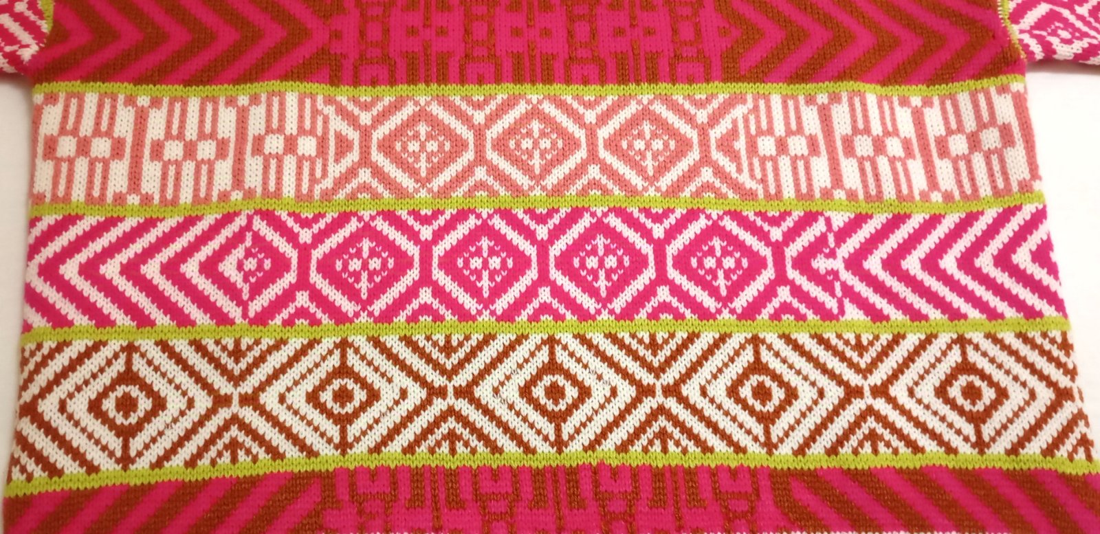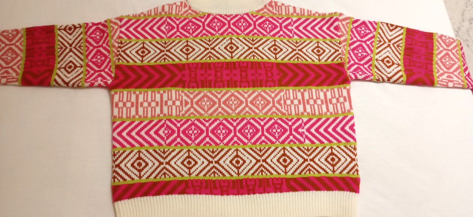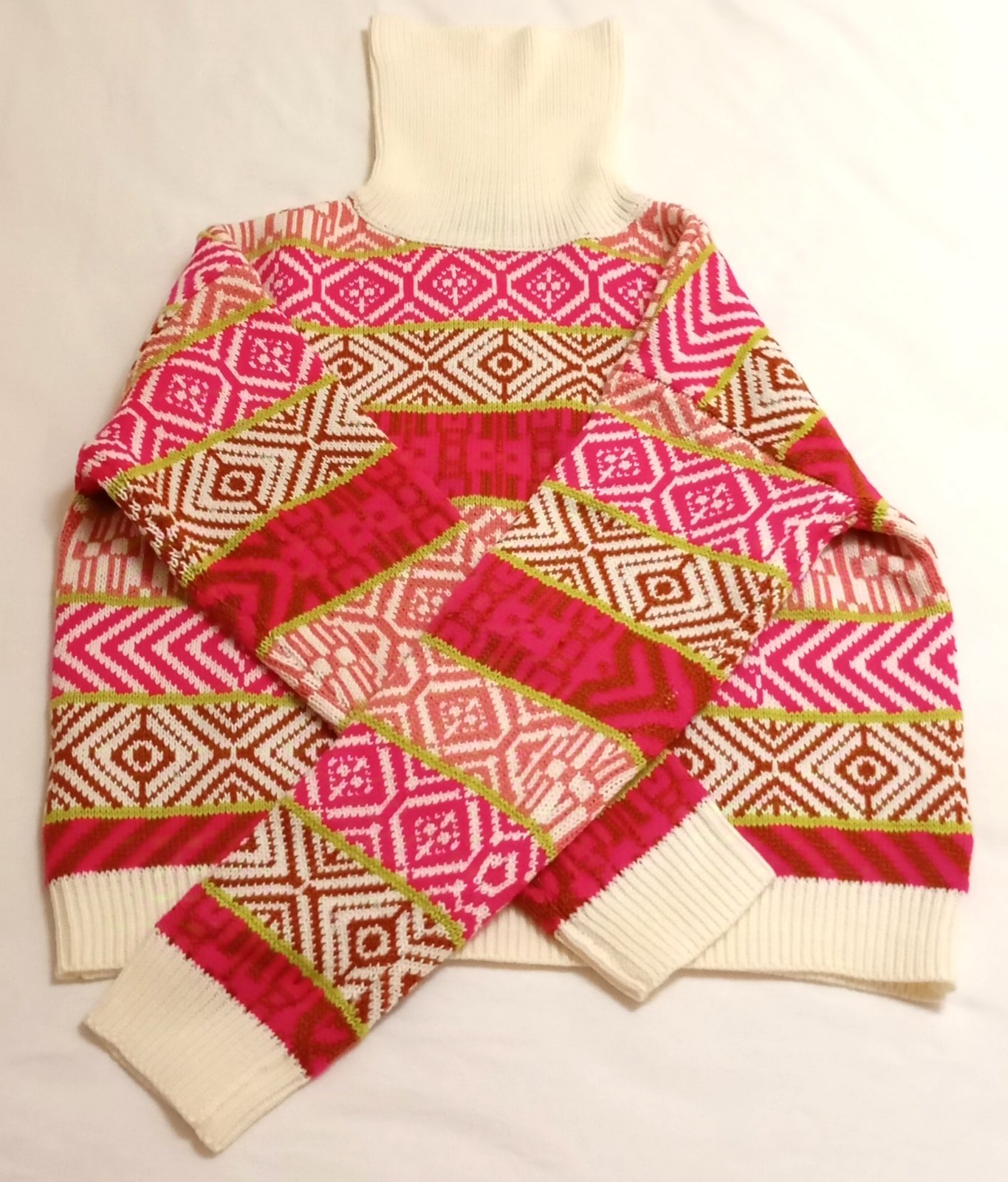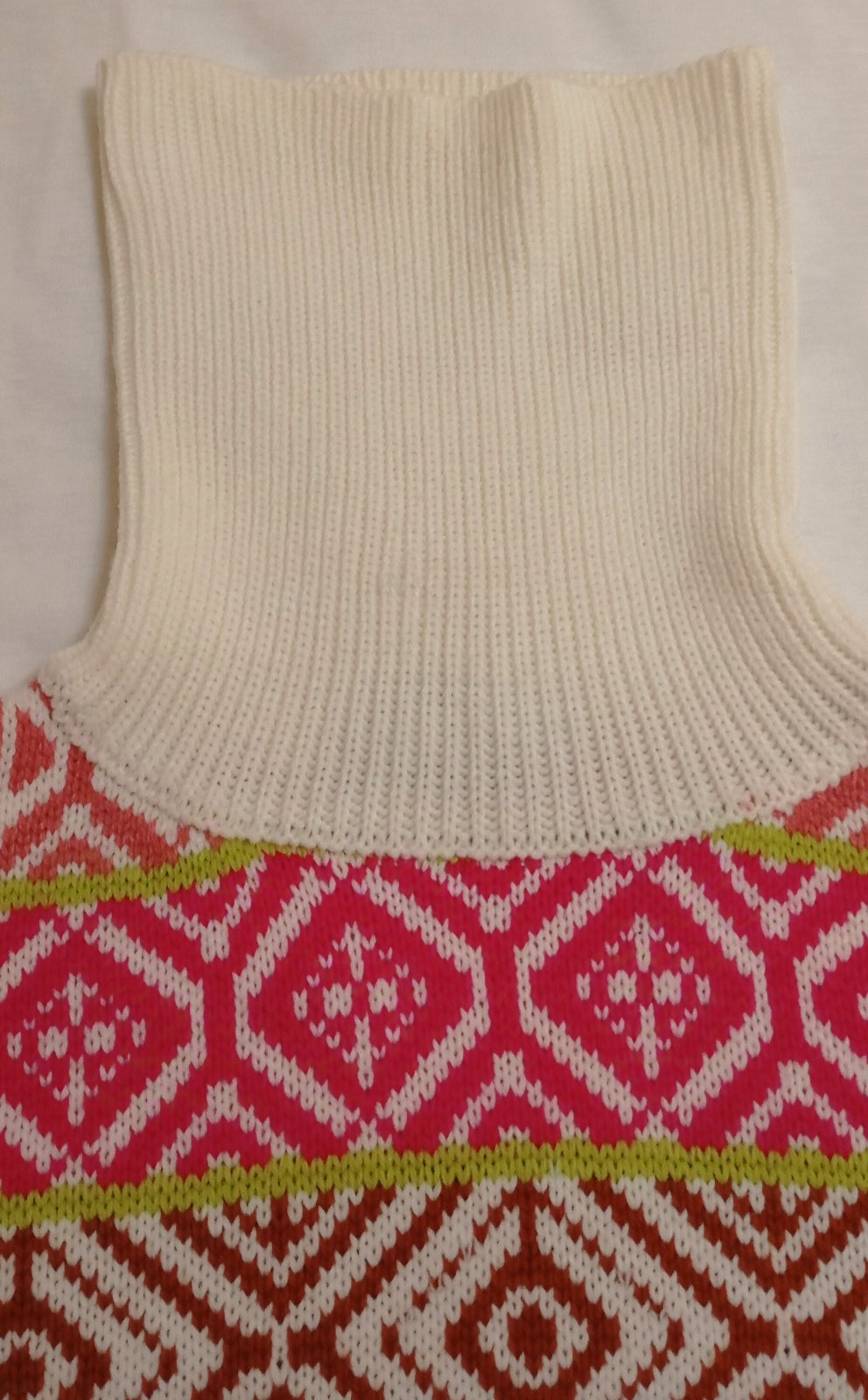 SkladomHrubý pletený pulóver so stojačikom, vhodný na zimu. Základ v krémovej farbe dopĺňajú výrazné vzory v ostro ružovej, hnedočervenej a limetkovej farbe.