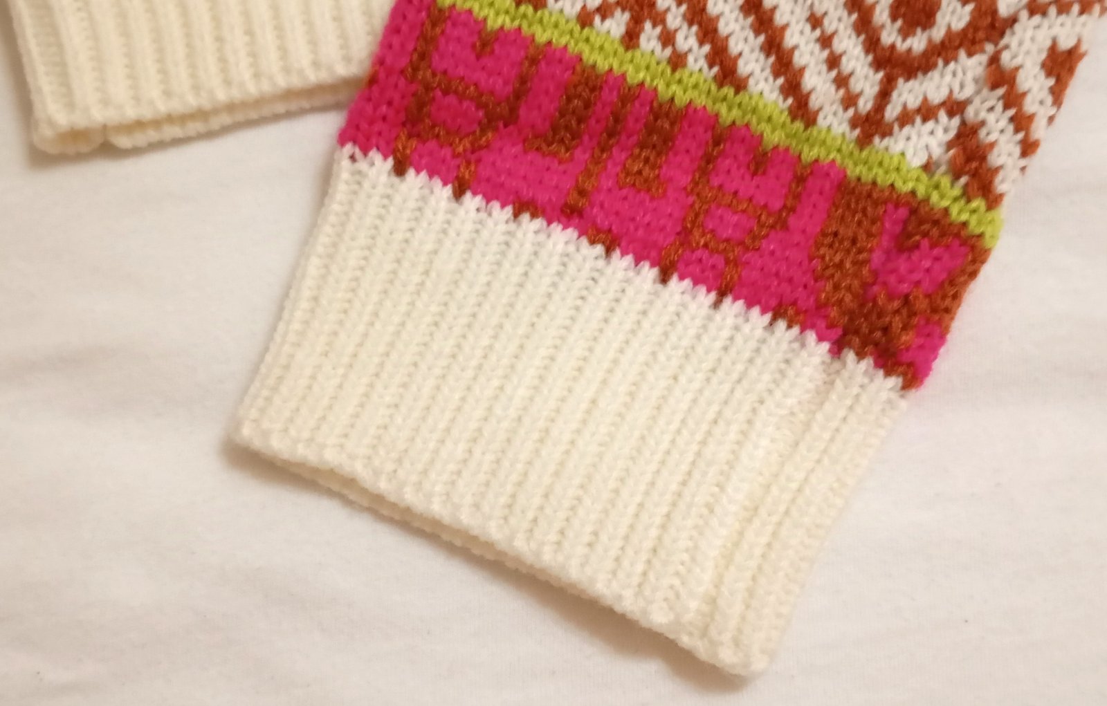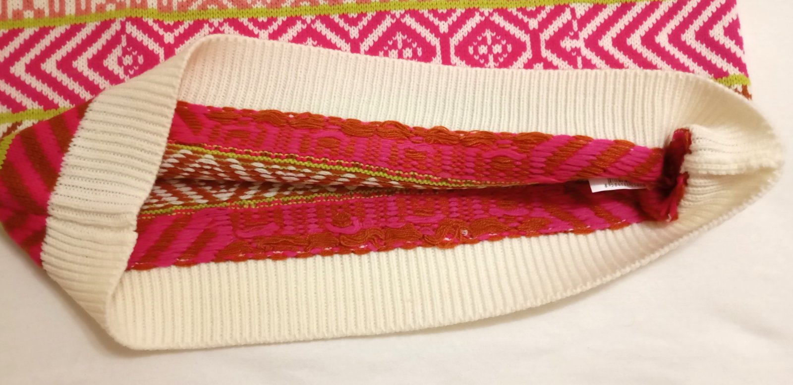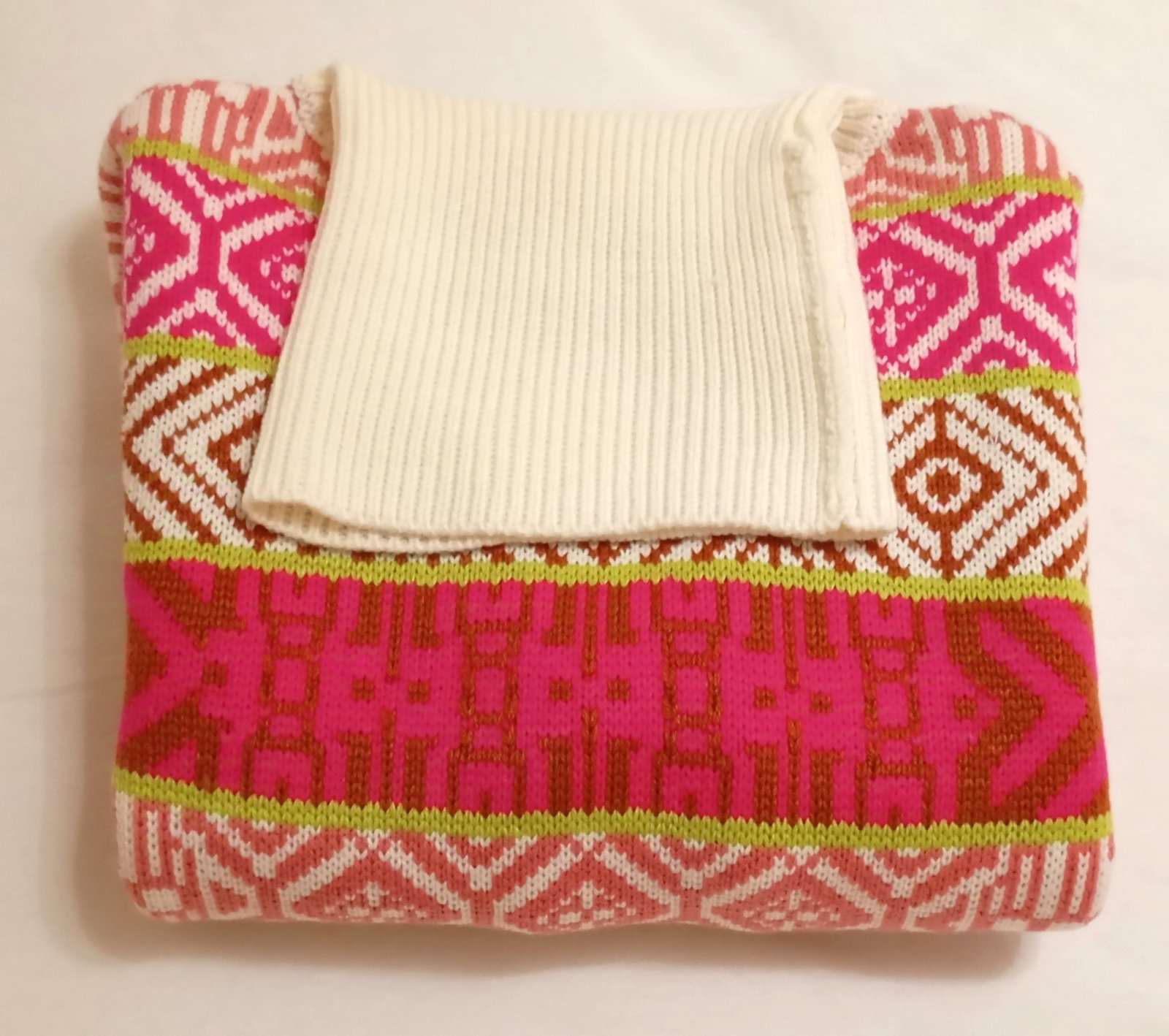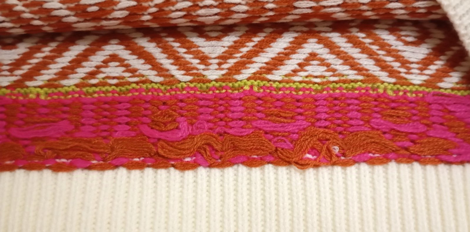 SkladomHrubý pletený pulóver so stojačikom, vhodný na zimu. Základ v krémovej farbe dopĺňajú výrazné vzory v ostro ružovej, hnedočervenej a limetkovej farbe.
