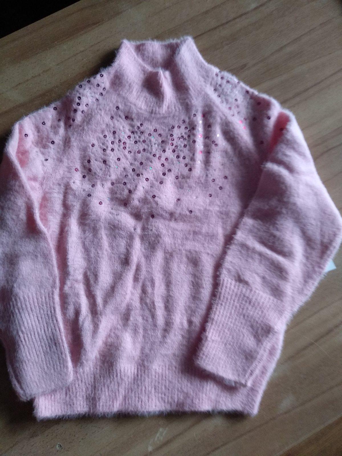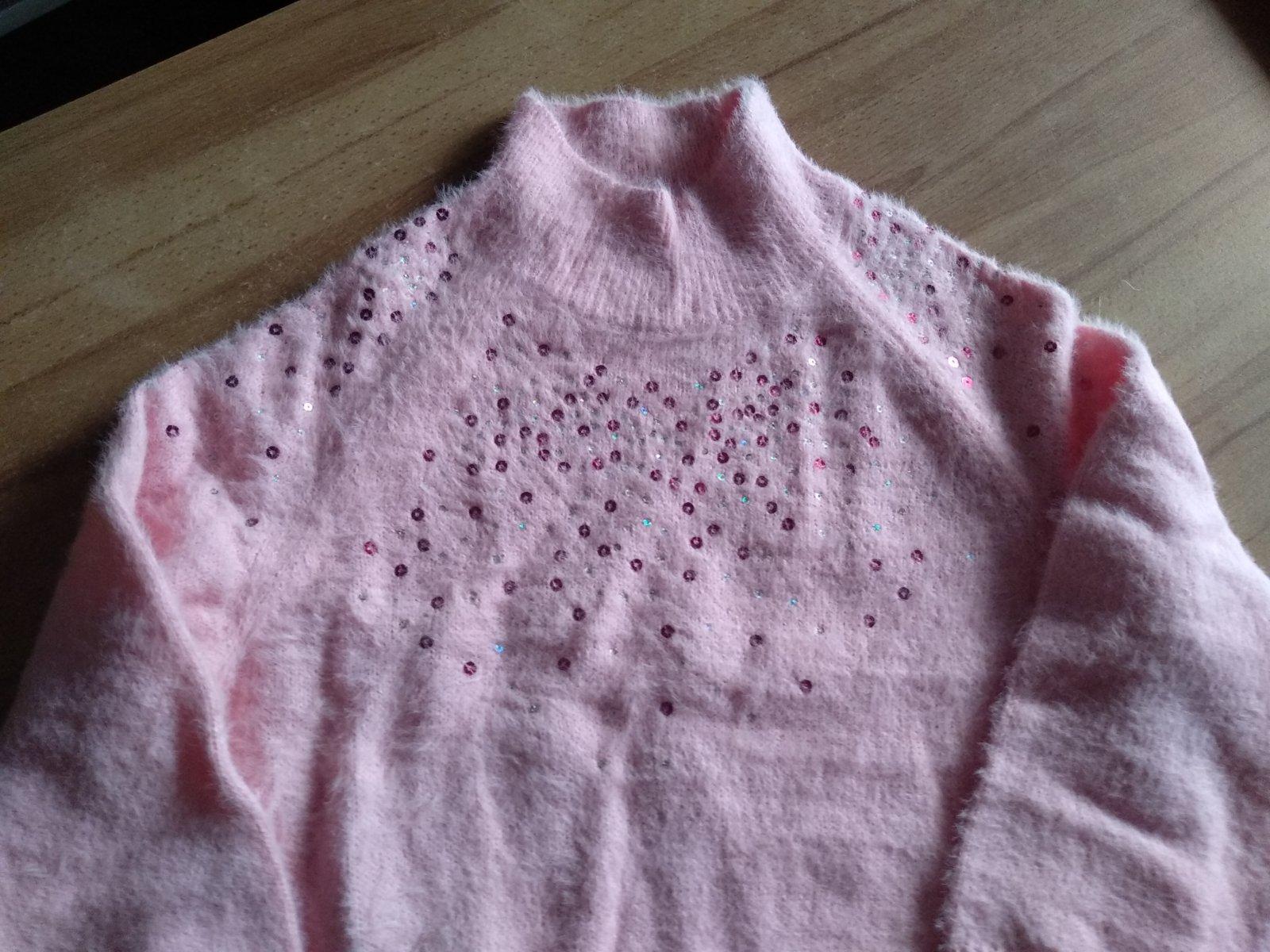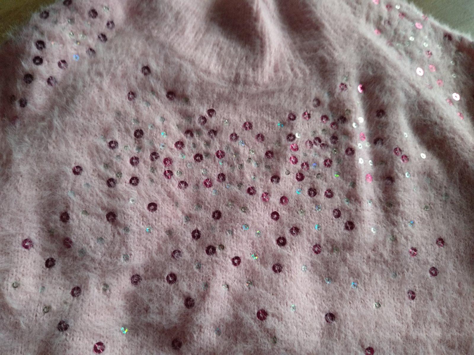 krásna, taká slávnostná mikina, alebo pulóvrik, aplikácia z flitrov s ružovým odleskom, veľmi príjemný mäkkučký materiál, roláčik je volnejší, neťahá pri krku, super stav veľkosť 122/128 dĺžka 46cm...