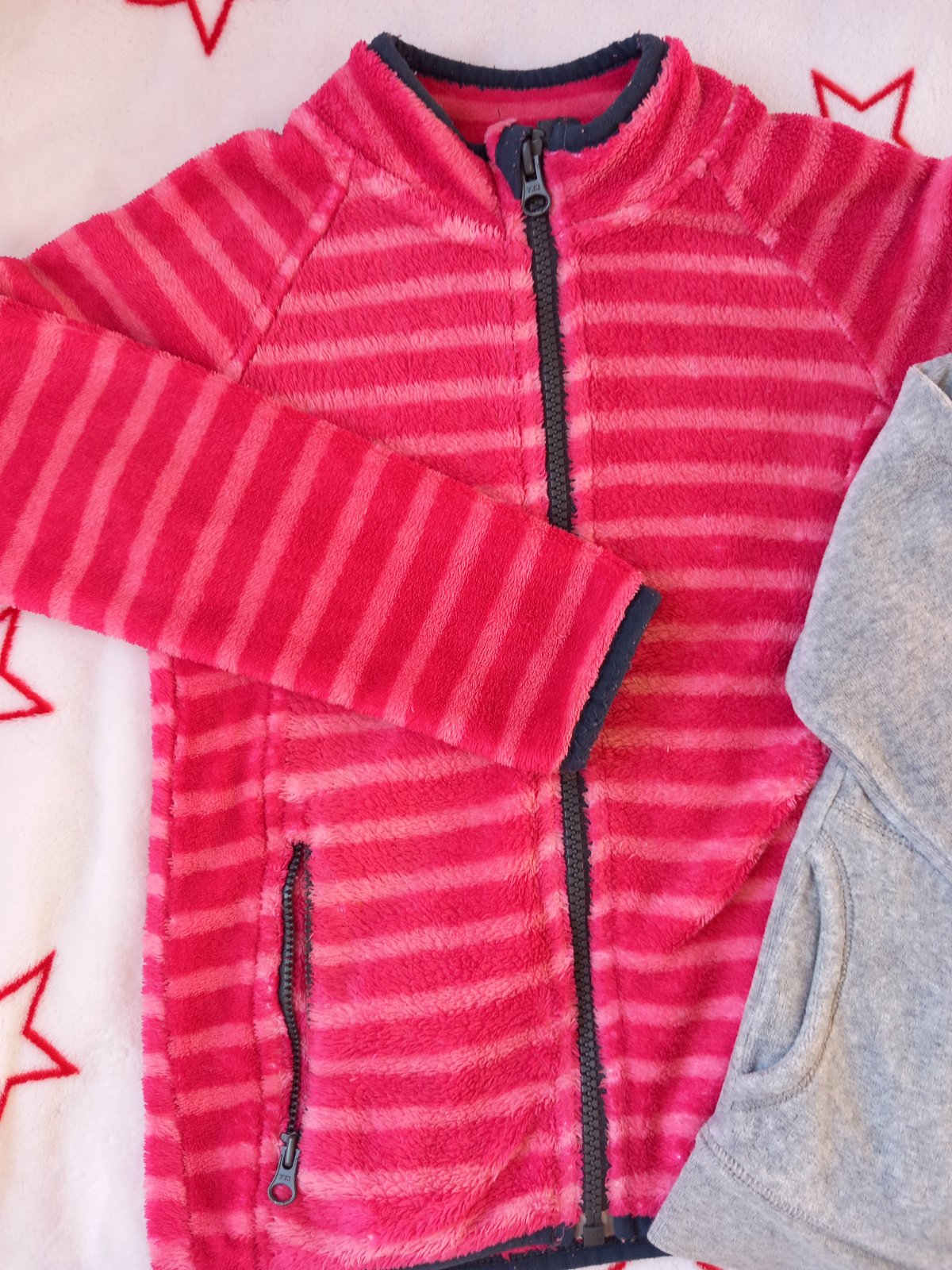 Makkučká flísová mikinka v dobrom stave. Má malý zaschnutý tmavomodrý fliačik (akoby od pera) na pravom-prednom dieli, vid vyznačené na foto. Je to tak 1-2cm, pri bežnom nosení nie je poznateľné. ...