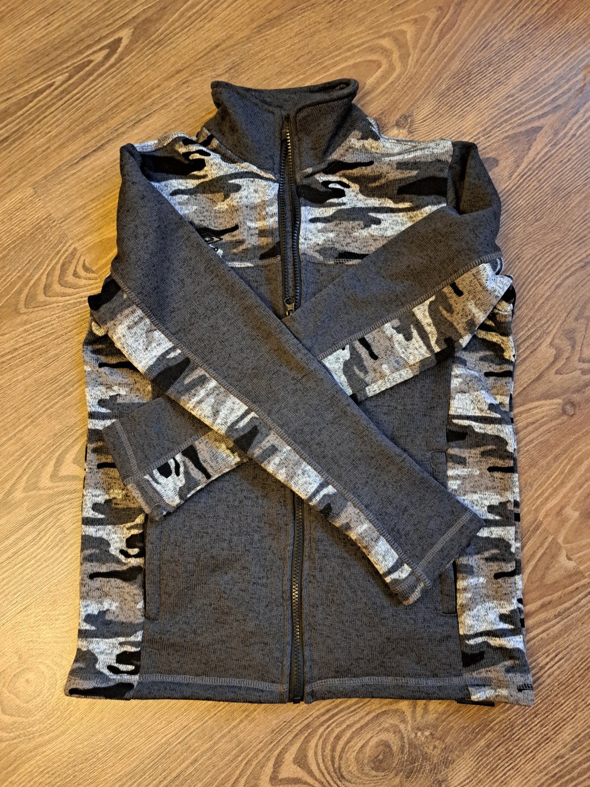 Teplá mikina z fleesu vo veľmi dobrom nosenom stave bez fľakov a dier, rozmery: zadná dĺžka 66 cm, šírka 48 cm, rukáv od ramena: 61 cm.
