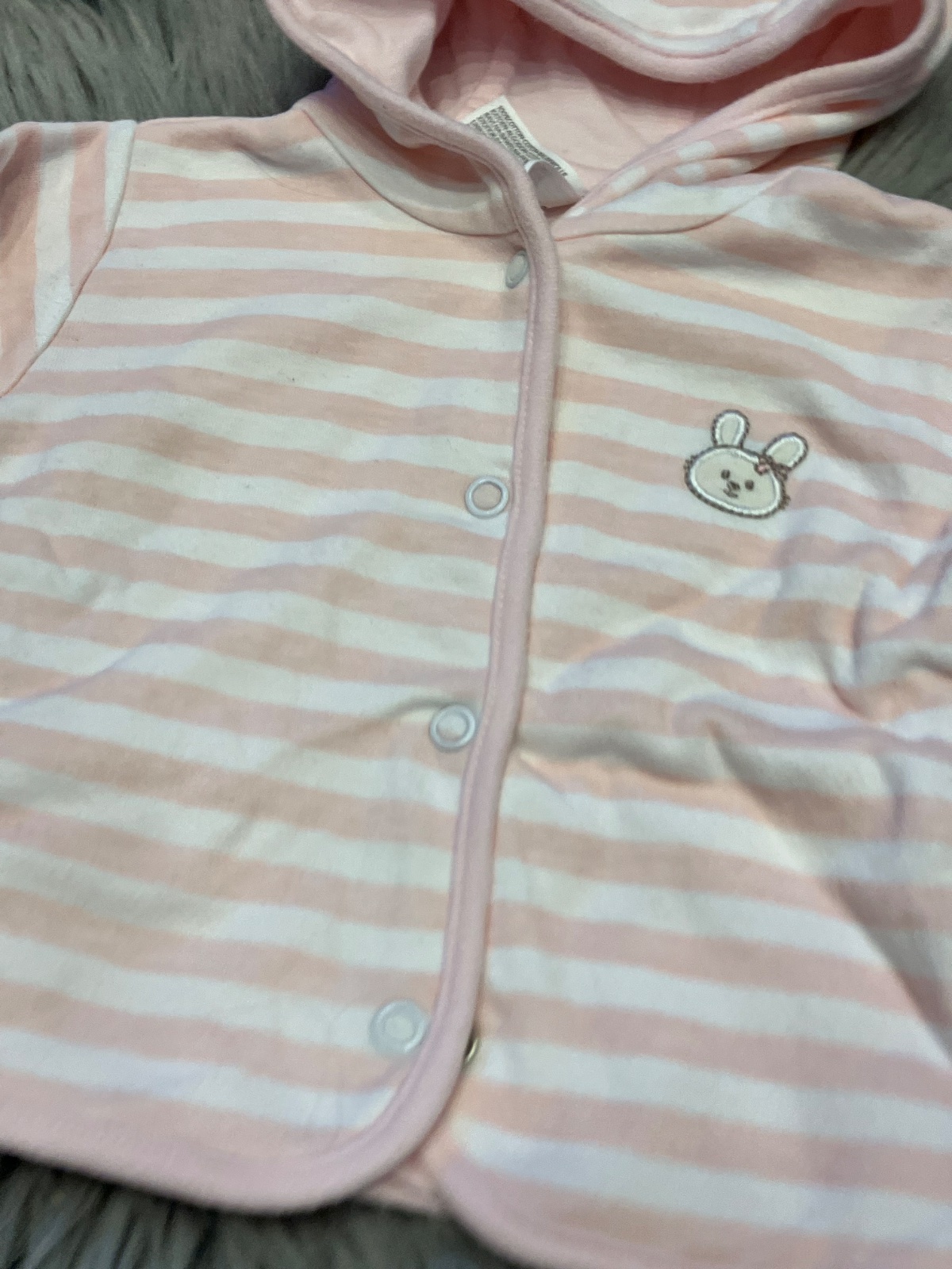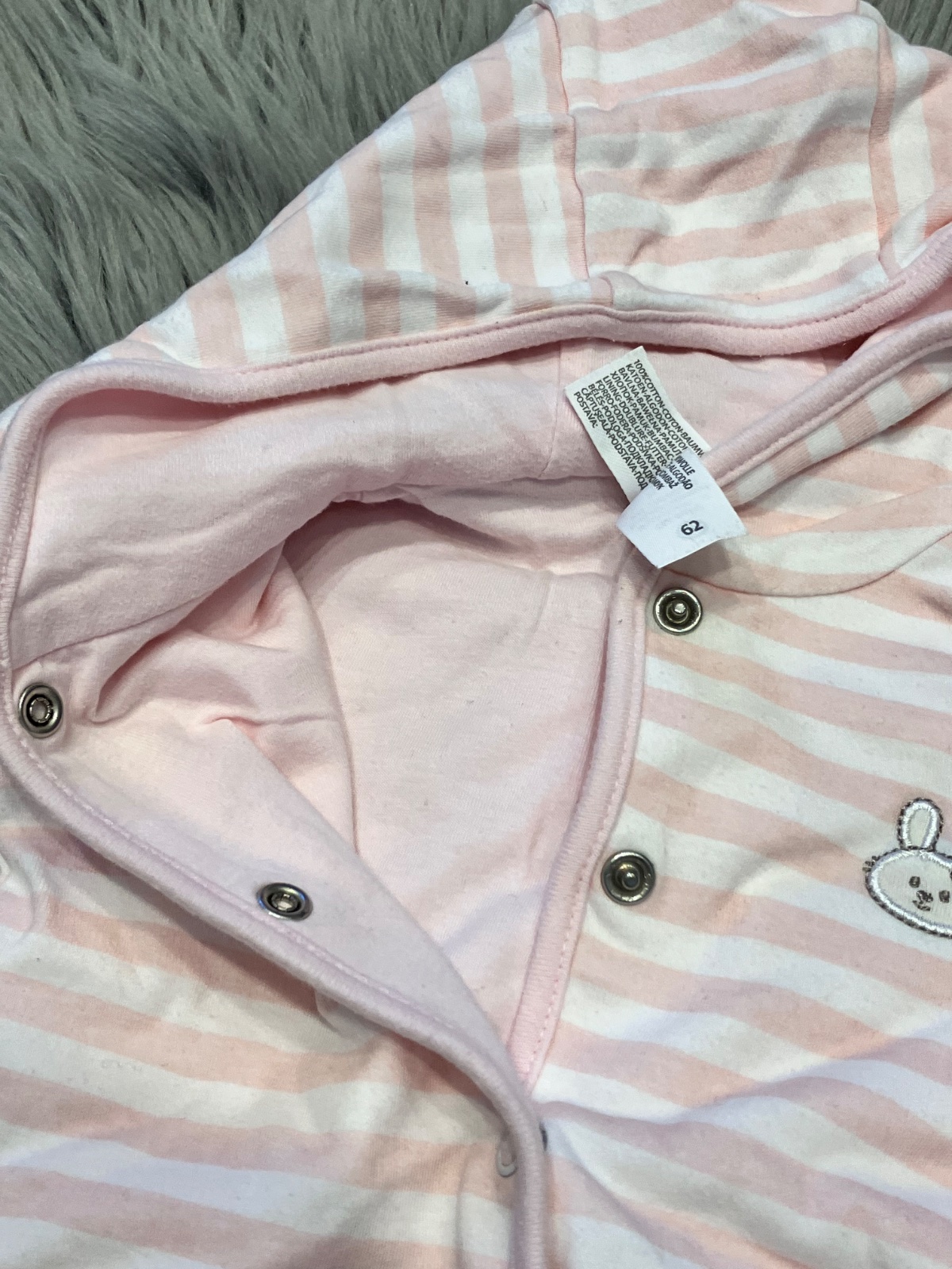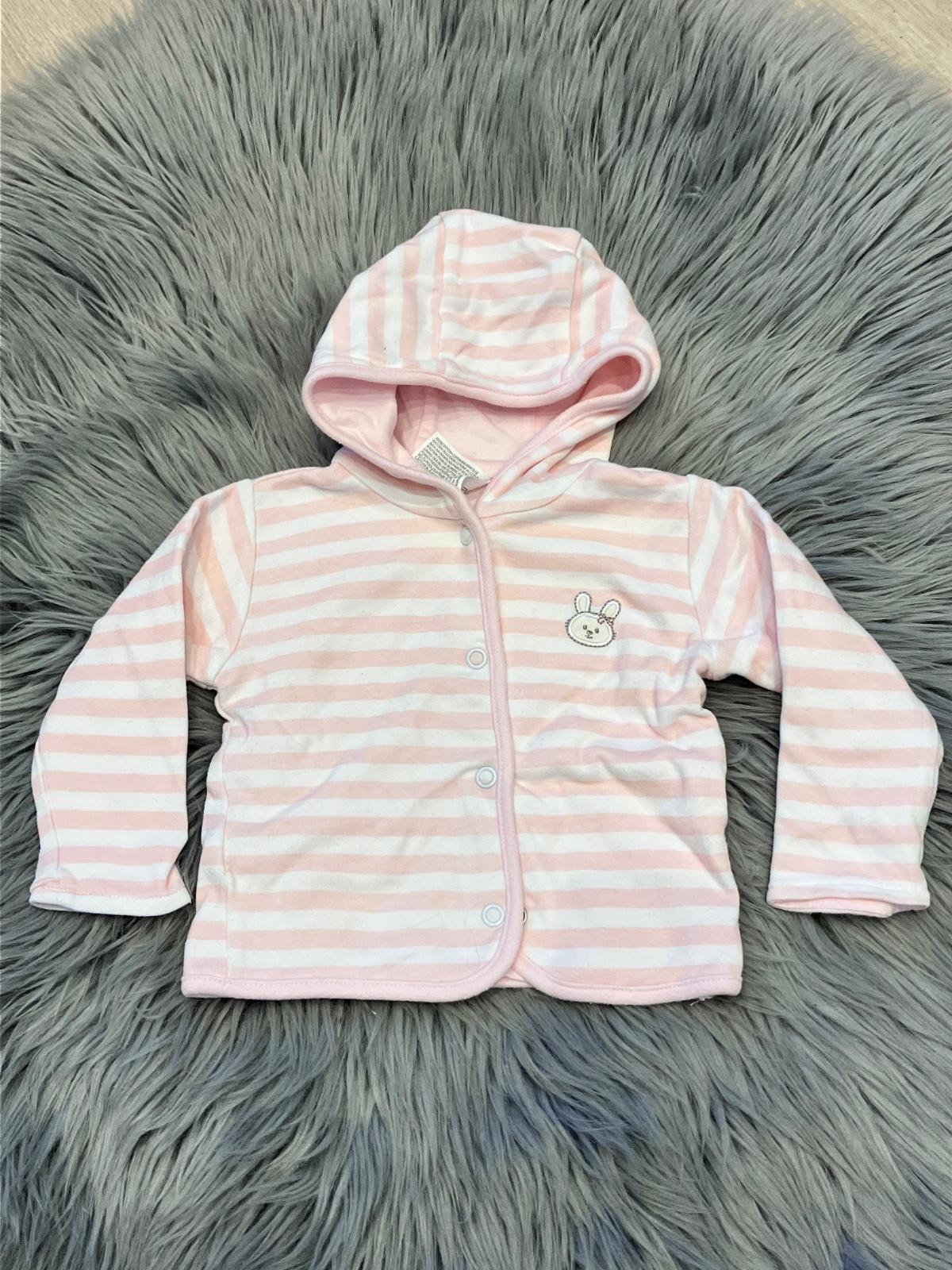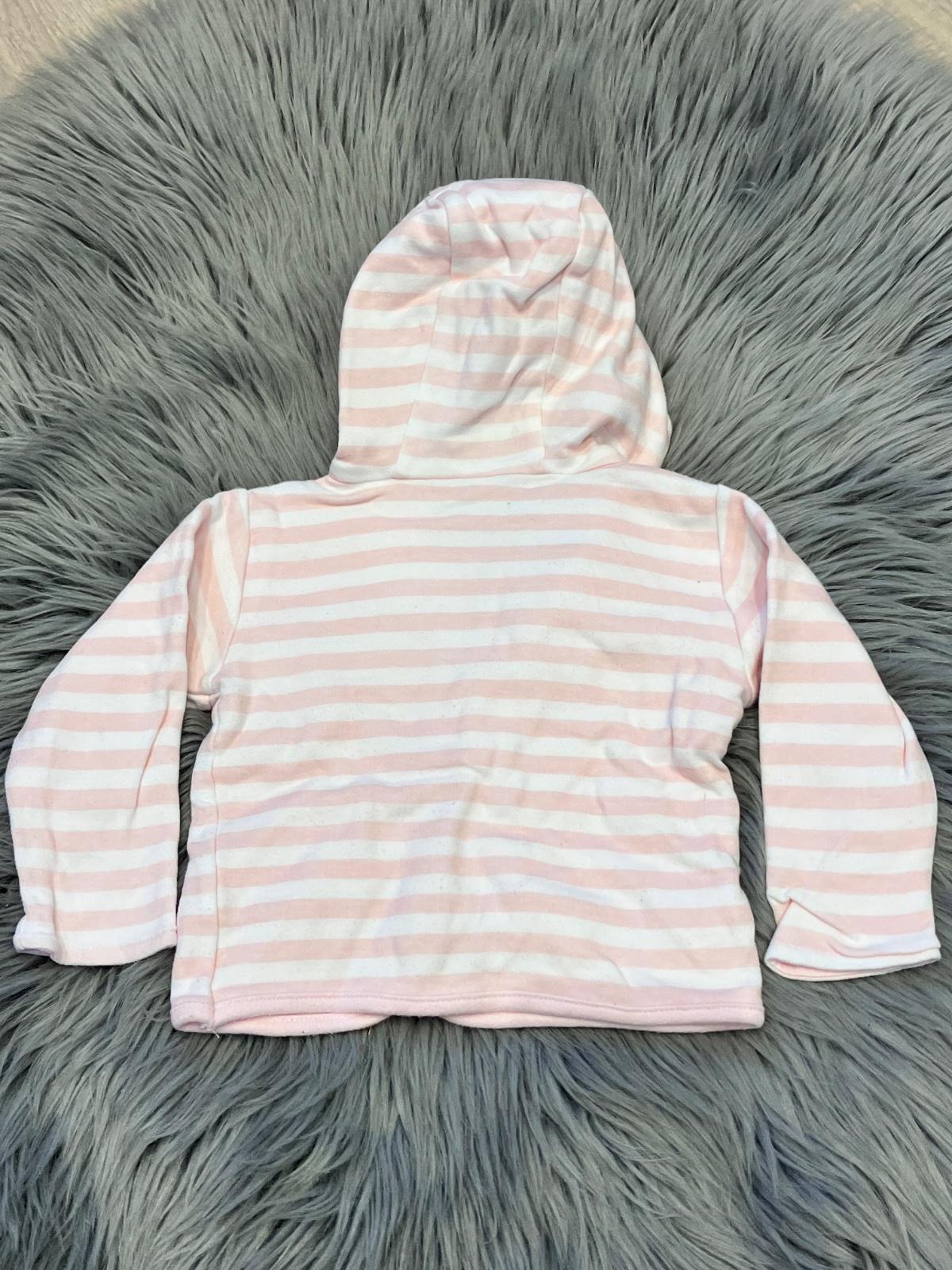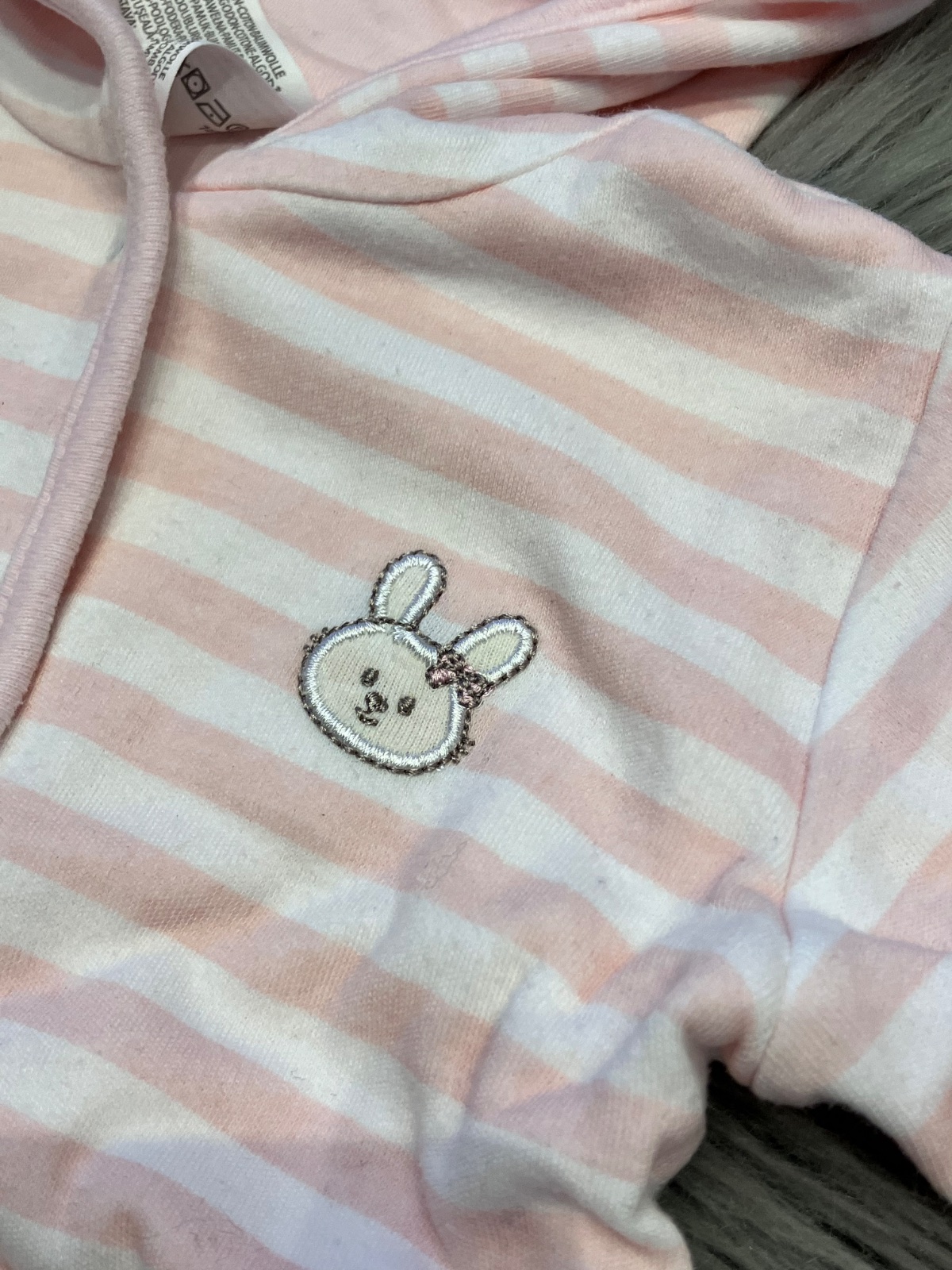 Dievčenská pásikavá mikina s kapucňou a malým vyšívaným vzorom zajačika, zapínanie na cvoky, elastická, materiál 100%bavlna.
