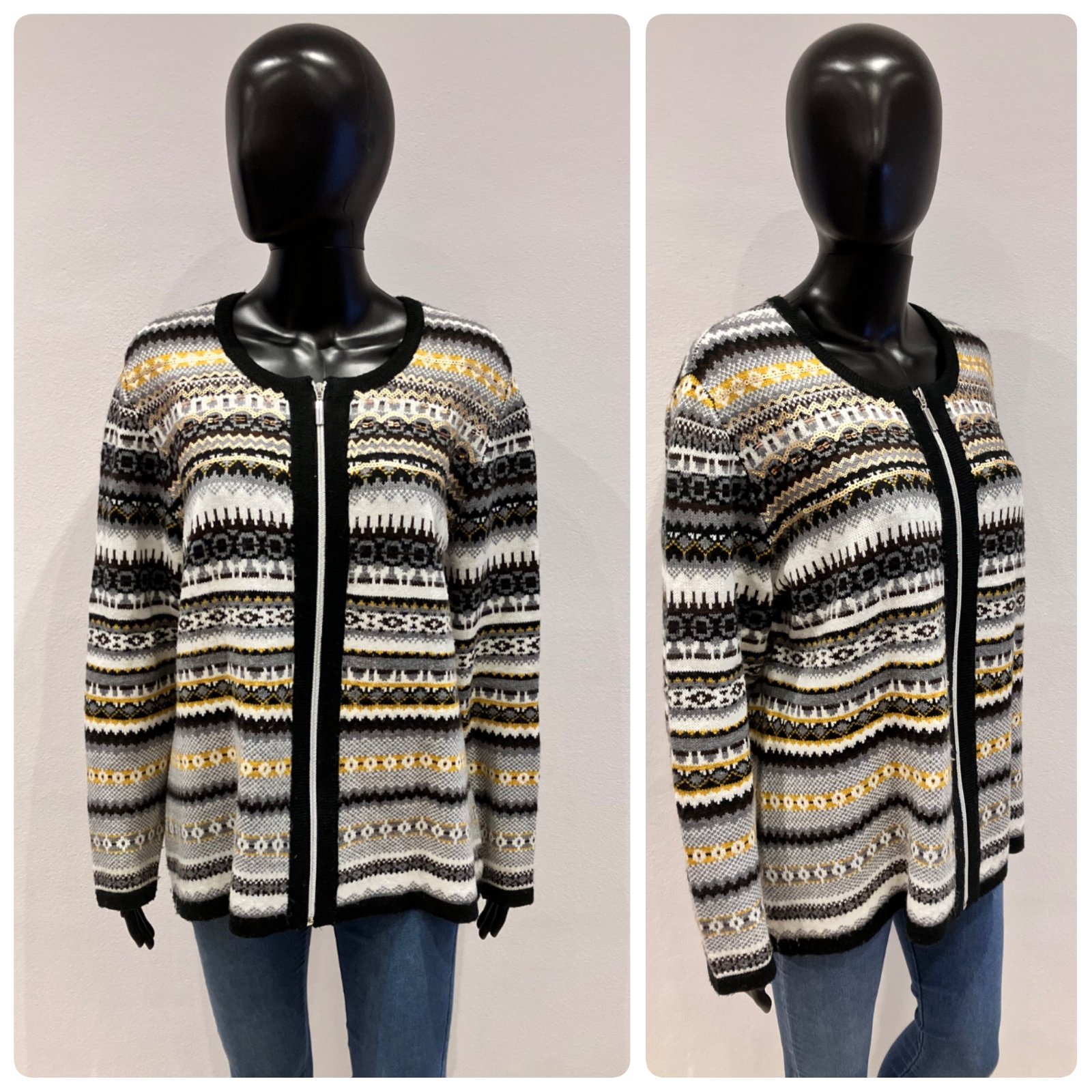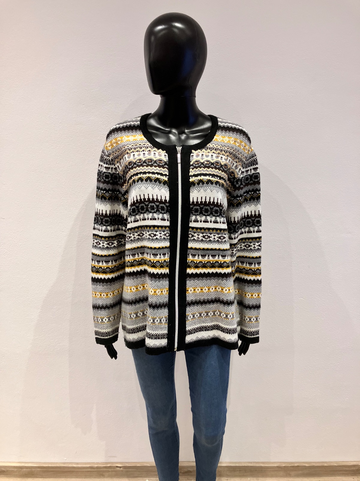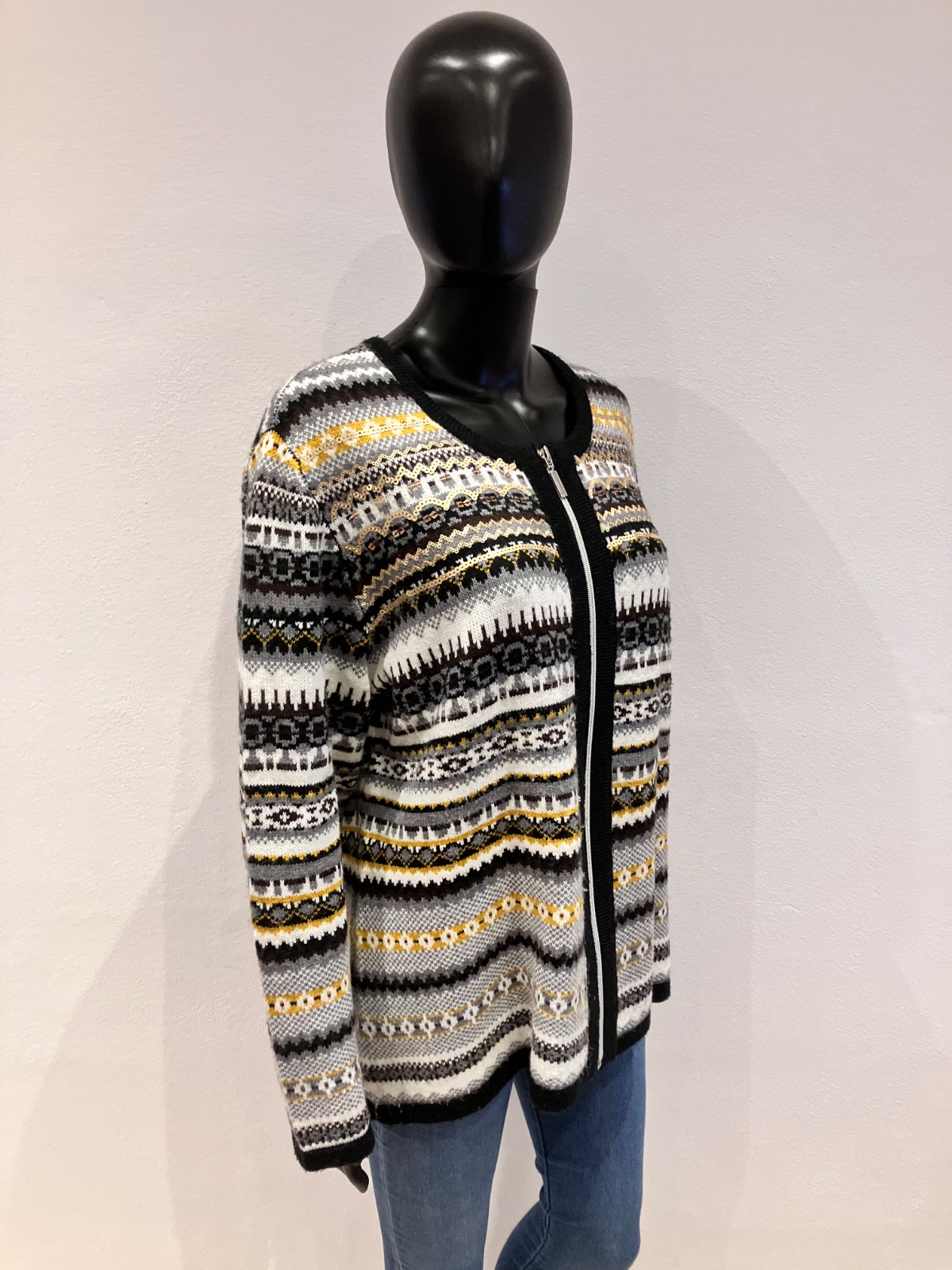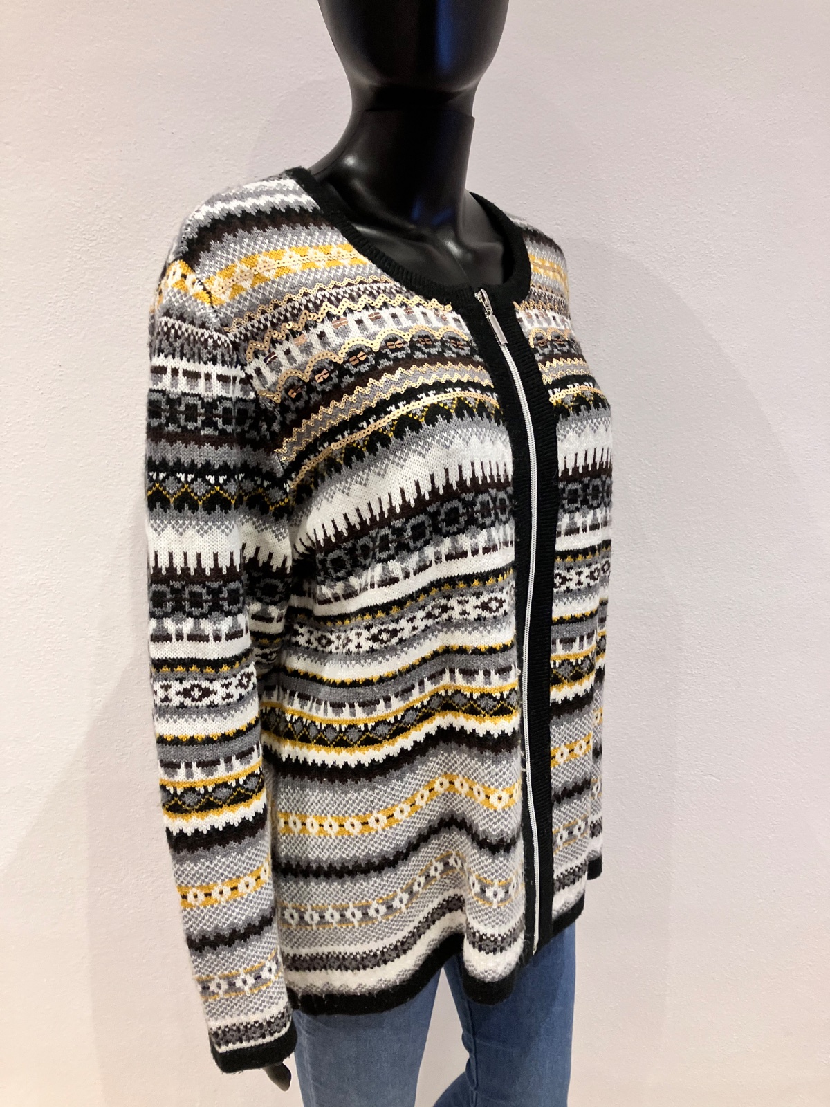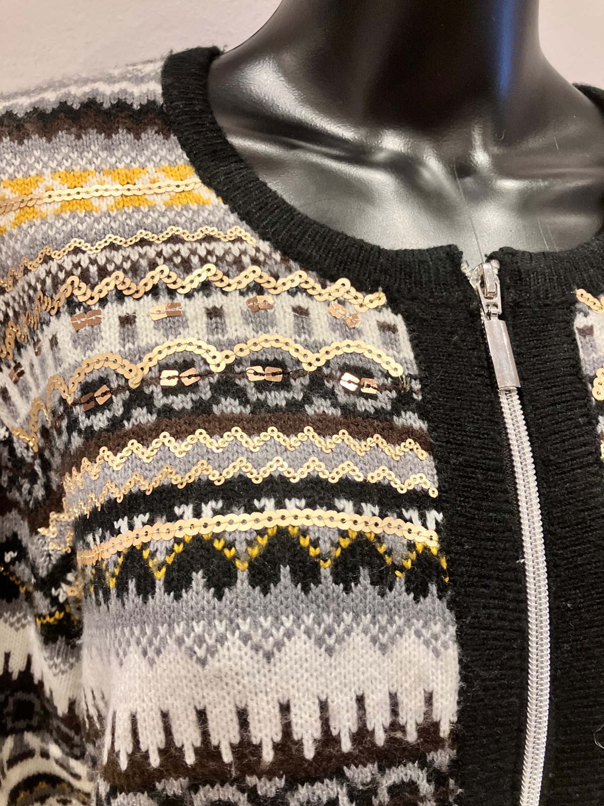 Dámsky sveter vzorovaný a flitrami, zapínanie na zips, elastický, materiál 98%akril 1%metalizované vlákno 1%polyester. Farba: čierno-bielo-sivo-horčicovo-hnedá.