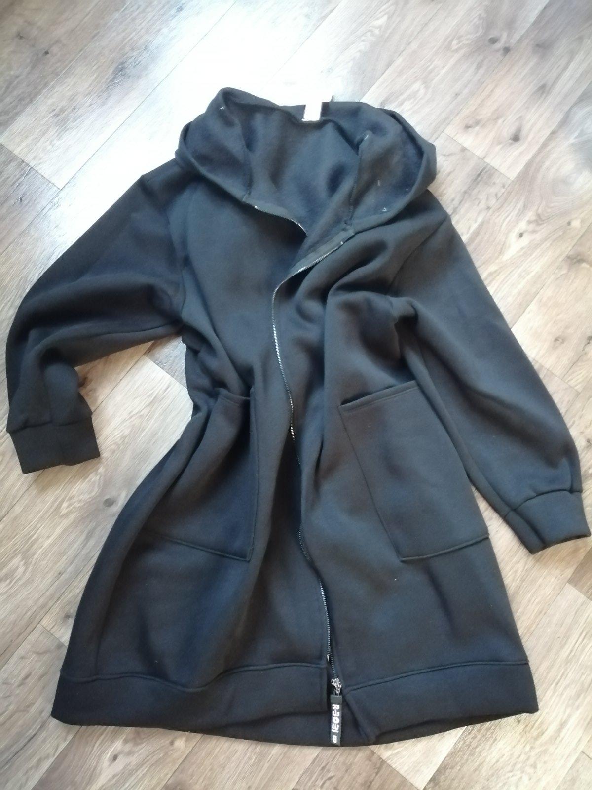 Oversize mikina alebo kabátik, neviem ako to nazvať, je to UNI, ja nosím M a cítim sa v tom moc utopena, ale ono to tak ma byt, nová s vysackou, made in italy, kupované v butiku, doma som si kúpu rozmyslela, cítim sa v tom ako vo vreci, jemne chĺpky zvnútra, nie je to môj štýl, farba pekná čierna, k cene treba prirátať poštovné