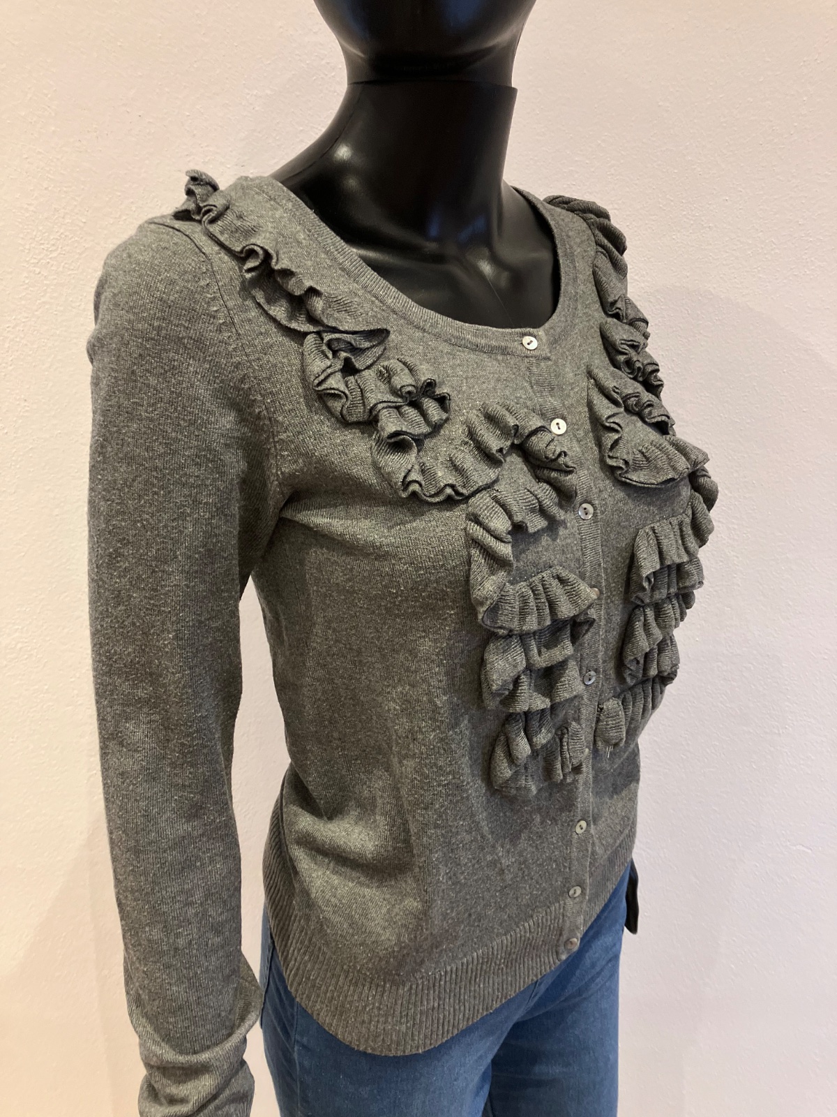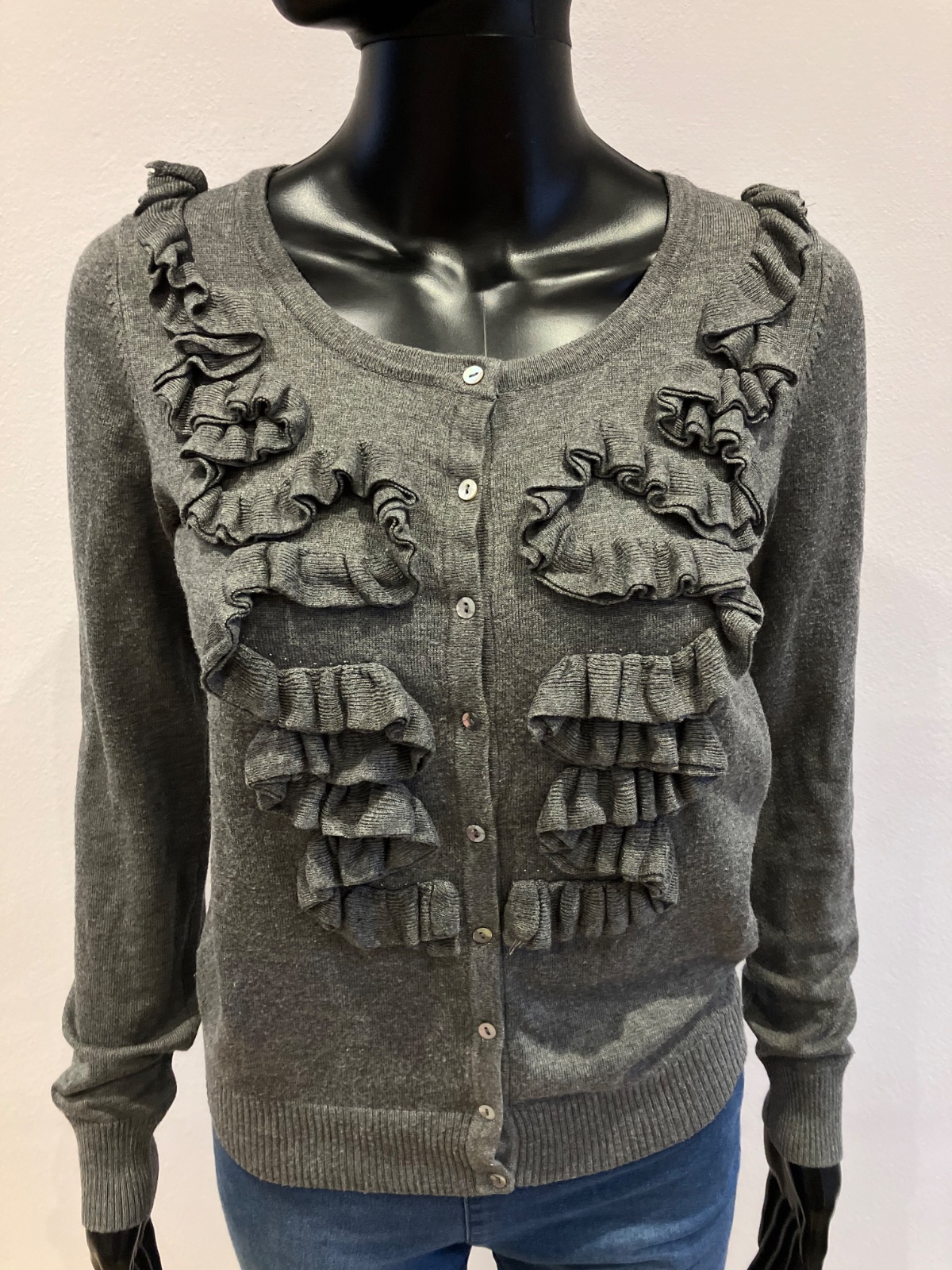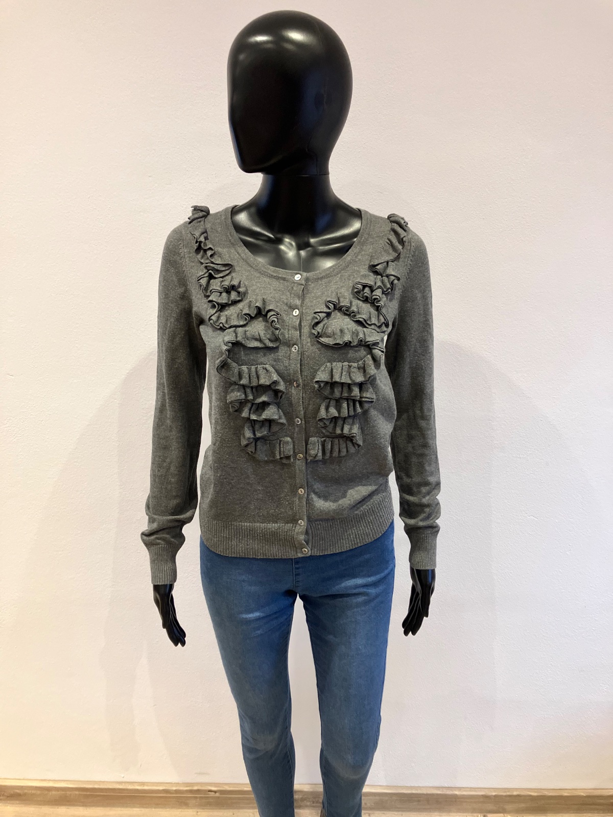 Dámsky tmavosivý sveter s fodričkami, zapínanie na gombíky, tenký, elastický, materiál 80%viskóza 20%polyester.