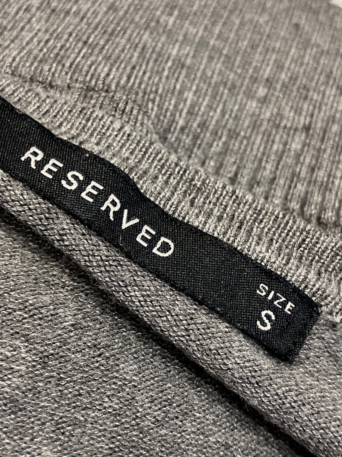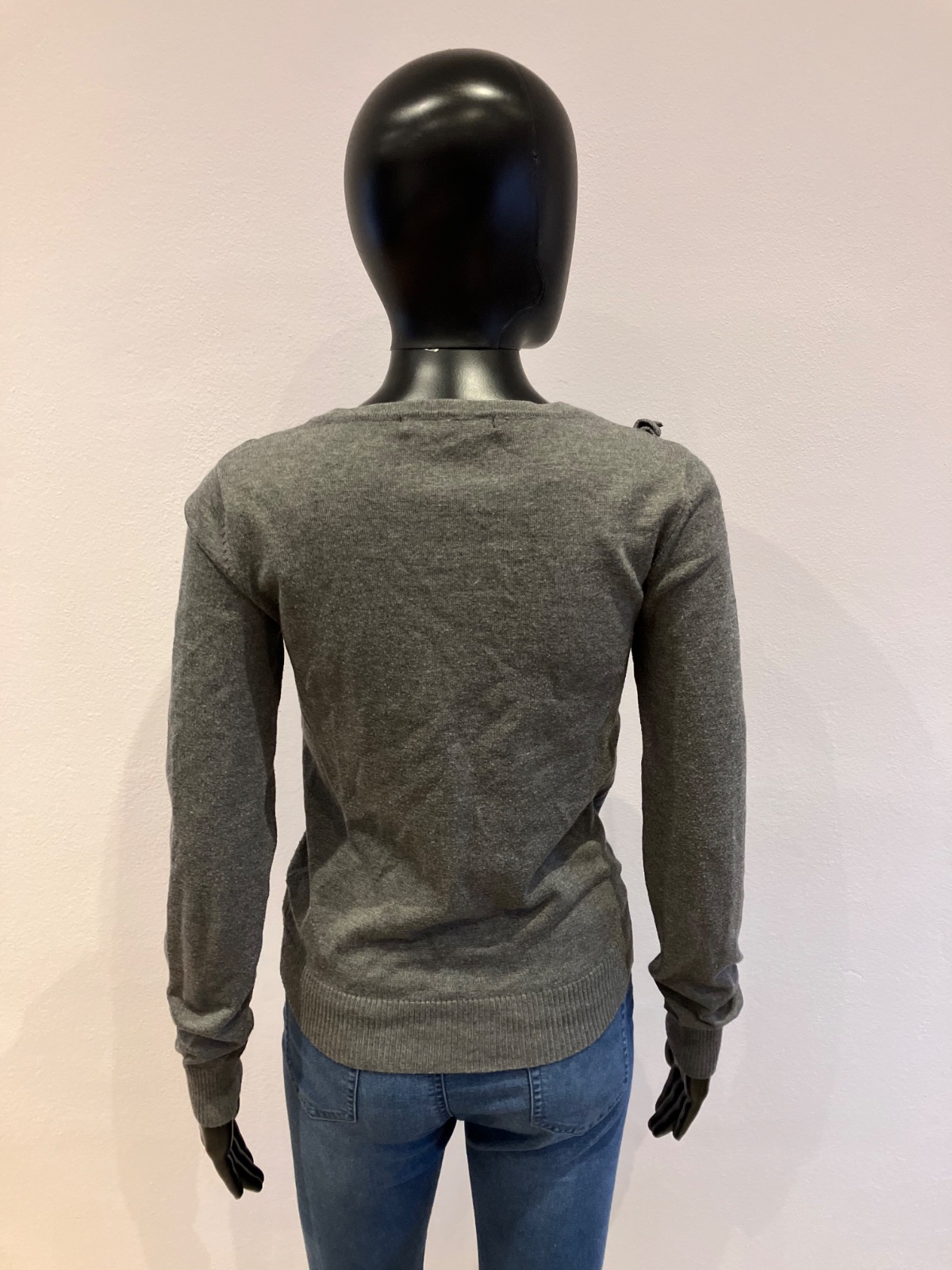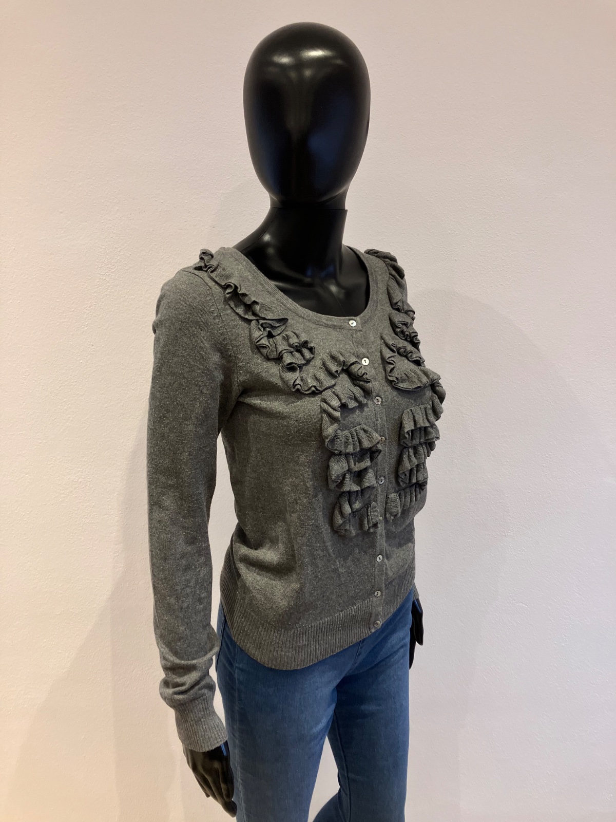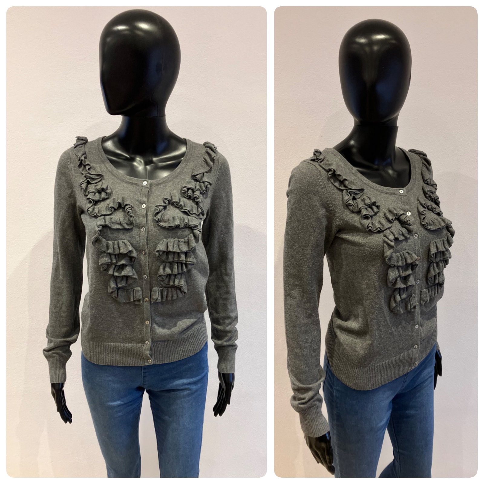 Dámsky tmavosivý sveter s fodričkami, zapínanie na gombíky, tenký, elastický, materiál 80%viskóza 20%polyester.