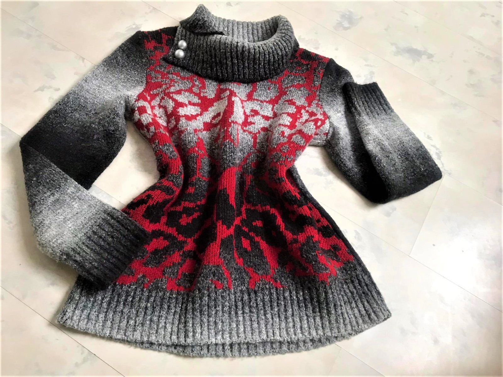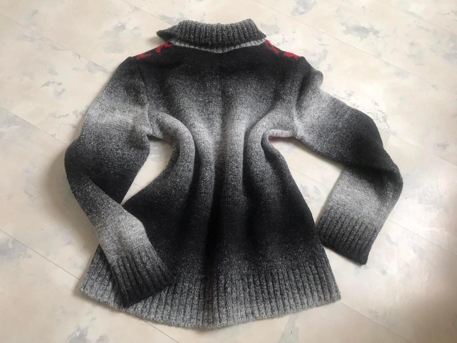 krásny a nenosený pulover,ja iba prepraný po skladovaní,veľmi teplý a mäkkučký pulóvrik,zaujímavý tieňovaný vzor - hrubší materiál,niečo podobné ako buklé,variabilný golier,miery : dlžka celkom = 63 cm,dlžka od pazuchy dole == 43 cm, rukáv = 60 cm,šírka meraná pod pazuchou = 48 cm x 2 ( poddá sa až do 52 - 53 x 2 cm )