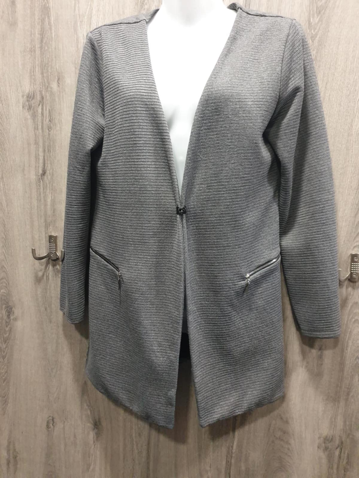 Dámsky háčkovaný sveter s trojštvrťovým rukávom. Ležérny strih, elastický,tenký. Stredno sivá farba je trblietavá. Materiál 100%acryl. Veľkosť UNI (vhodná pre S,M,L). Krajina pôvodu: Taliansko. RO...