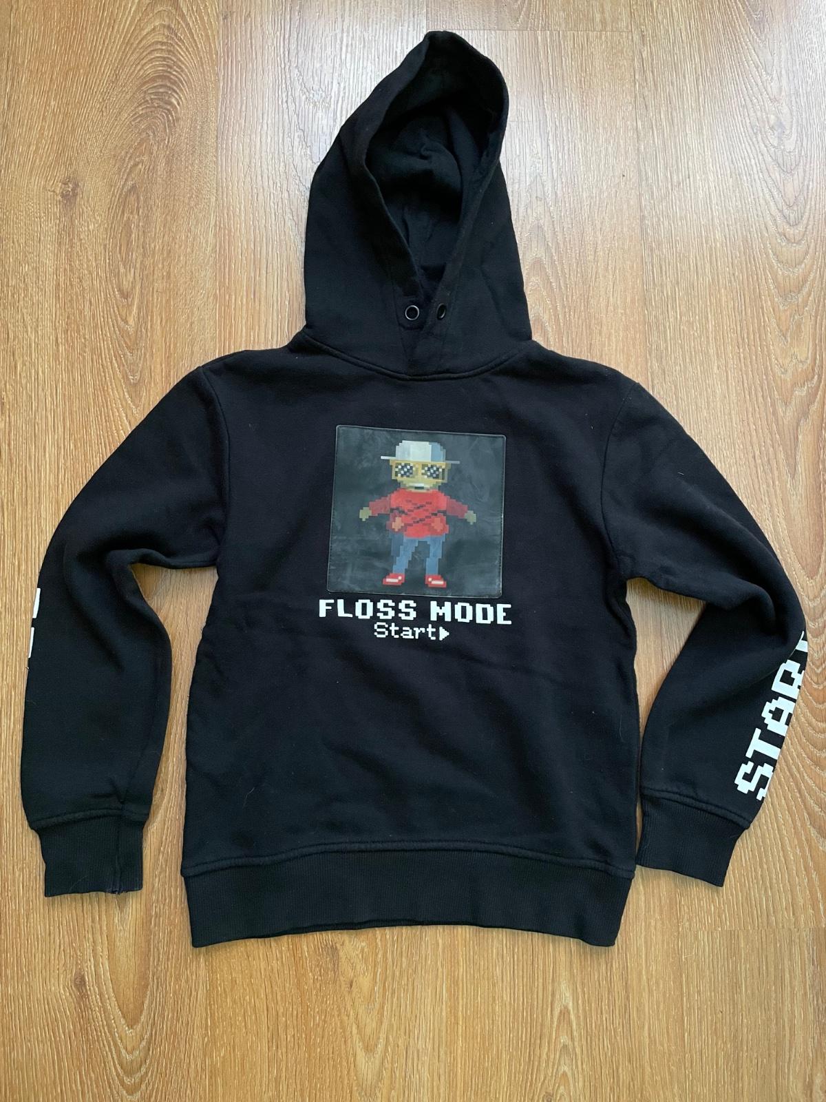 mikina je hrubšia, nosená na TV, nepoškodená, farba je už trošku svetlejšia ako za nova písaná 134, ale je menšia, taká 128/134 dĺžka 48cm, rukáv od kapucne 55cm, vn.dl. spod pazuchy 42cm