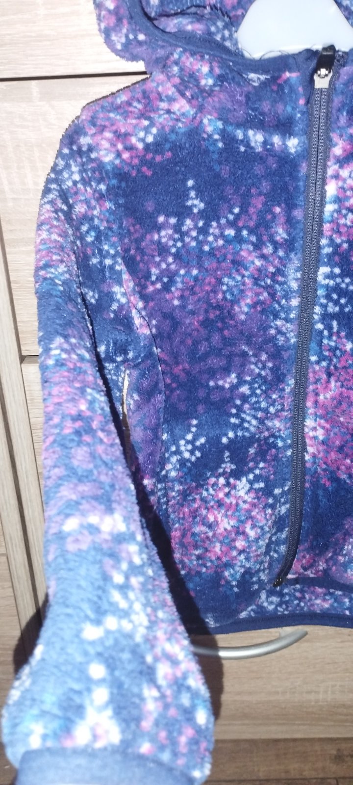 Teplučká mikina, fialová s motívom hviezdičiek, celé vnútro je zateplené bielym barančekom. Dá sa nosiť aj ako bundička pri suchomm počasí. Dĺžka 40cm, šírka 36cm, rukáv 35cm.