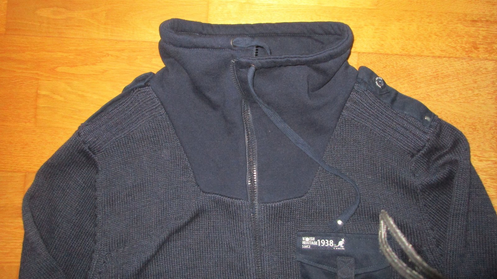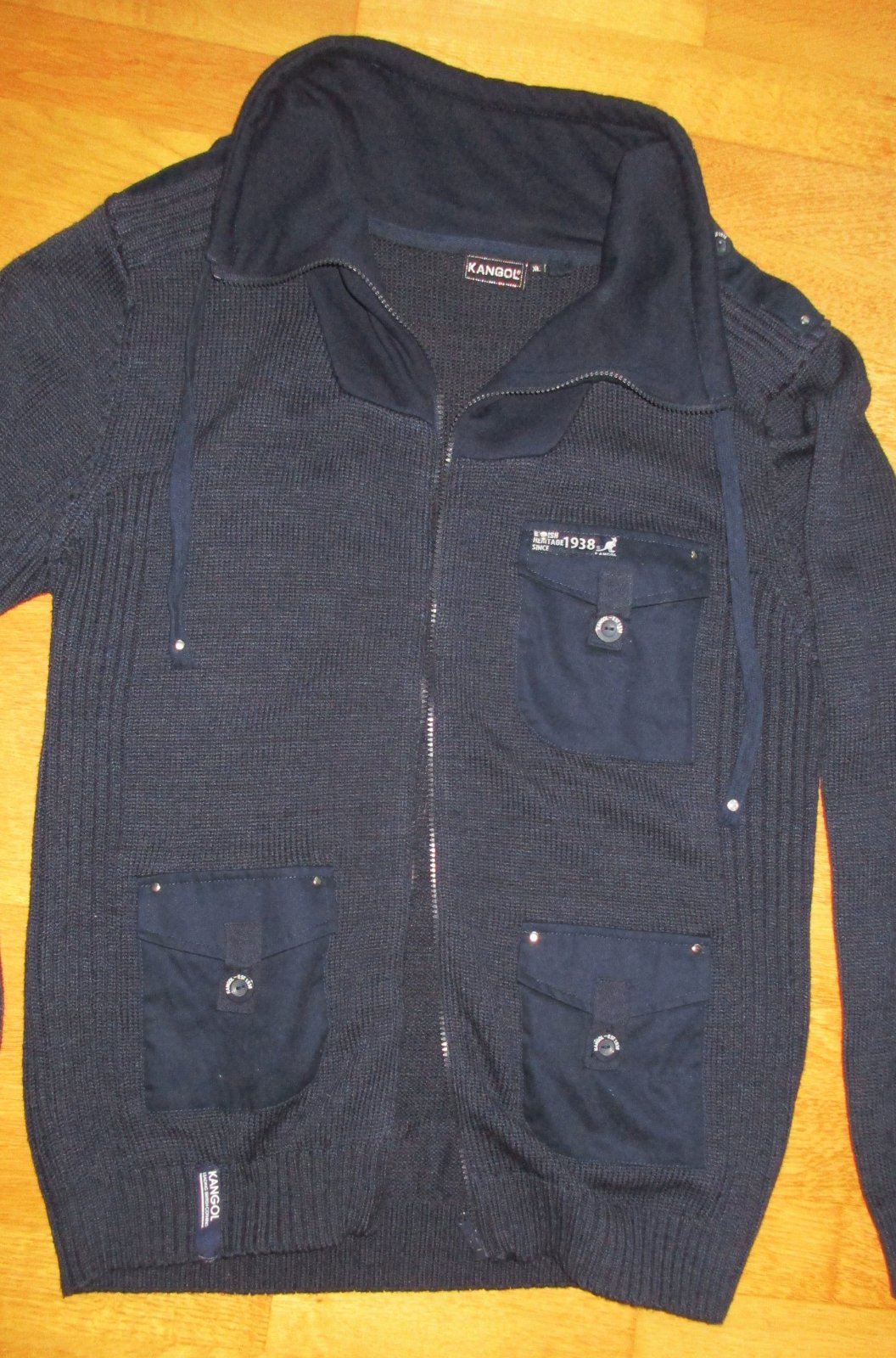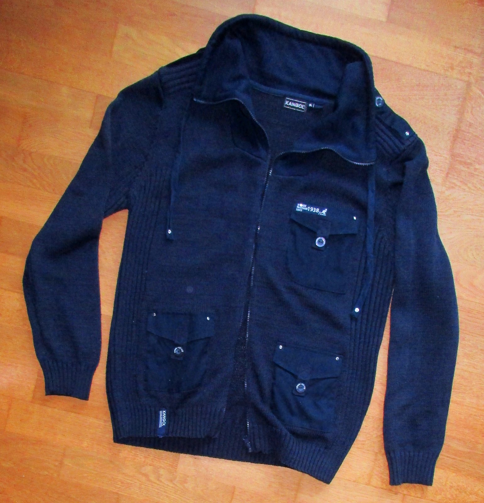 sveter nebol noseny, lebo to nie je manzelov styl, je teda vo vybornom stave. Je z pleteniny 100% polyester, stredne hruby, vrecka a vylozky na pleciach z latky a krk/dekolt hrubsia bavlnena teplakovina. Farba namornicka modra, zapinanie na zips. Lezerne elegantny styl. Vsetky 3 vrecka sa zapinaju na gombik. Merane v klude: Rukav 71 cm, prieramok cca 14 cm, dlzka od pleca 74 cm - aj pre vyssie postavy, sirka pod pazuchou cca 55 cm. Uplet sa natahuje do sirky, takze myslim, ze sadnu aj vacsej postave, prip. ako oversize.