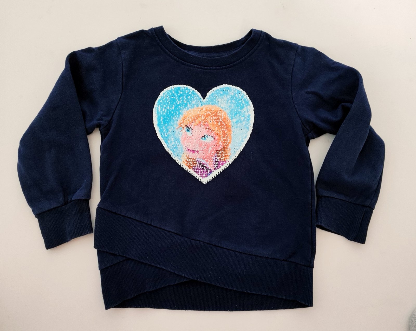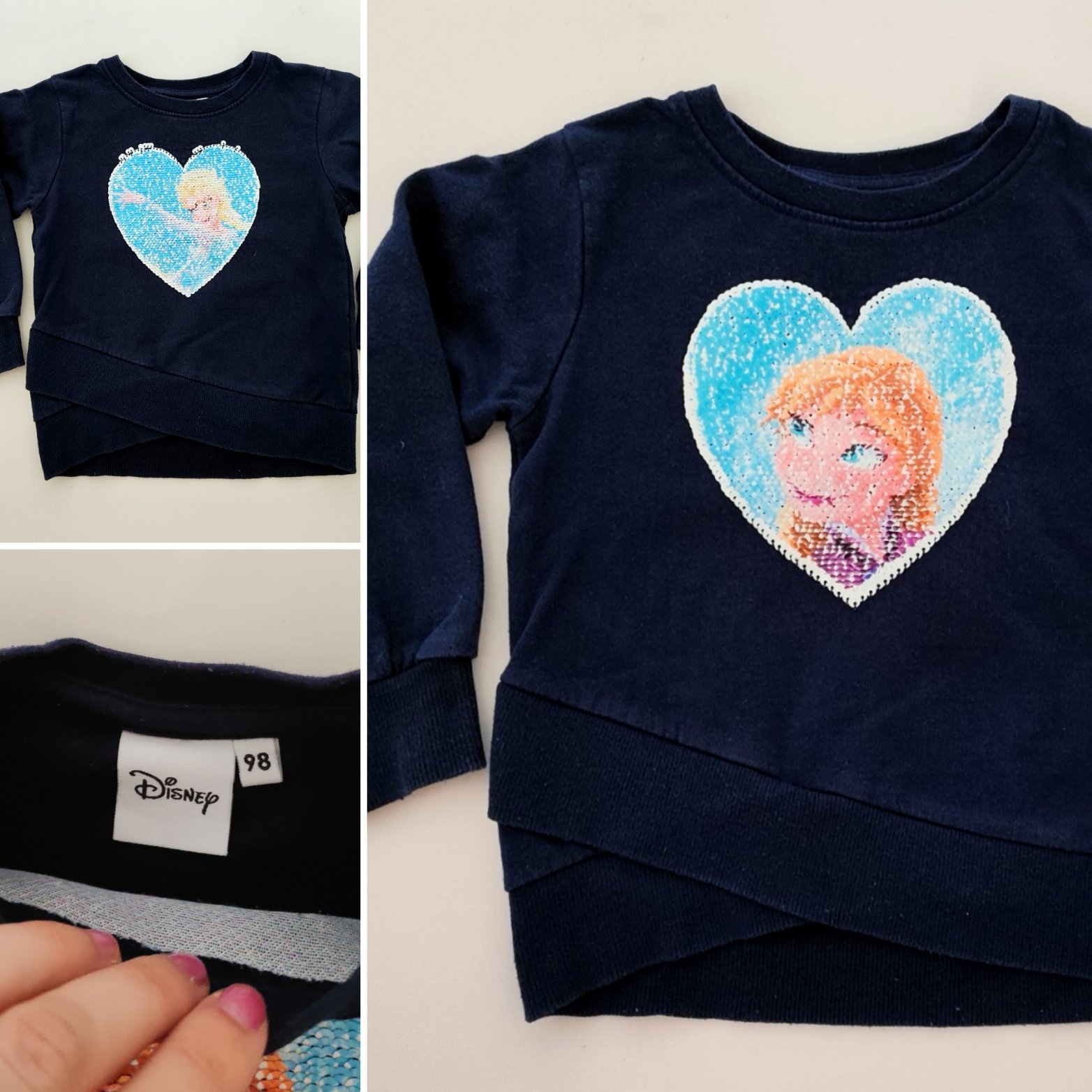 Teplá mikinka s kapuckou Frozen bez označenia veľkosti, dávam v. 98/104 - premerajte, materiál 80% bavlna, 20% elastan - teplá teplákovina, pekná tmavomodrá nevypratá farba, aplikácia bez poškodeni...