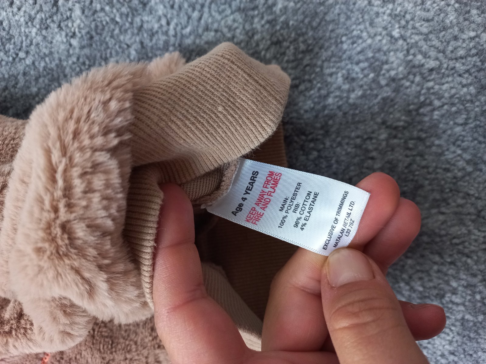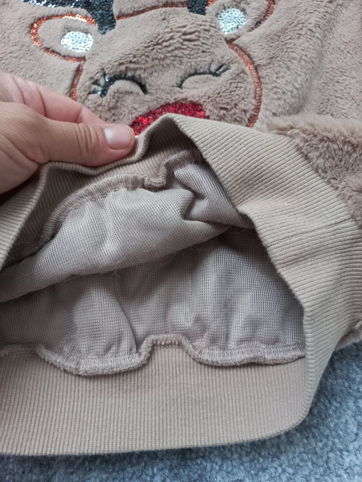 Asi 2x na sviatky oblecena hrubsia plysova mikina, pidsita hladkou latkou, znacka Matalan, velkost uvedena 4y (cca 104).