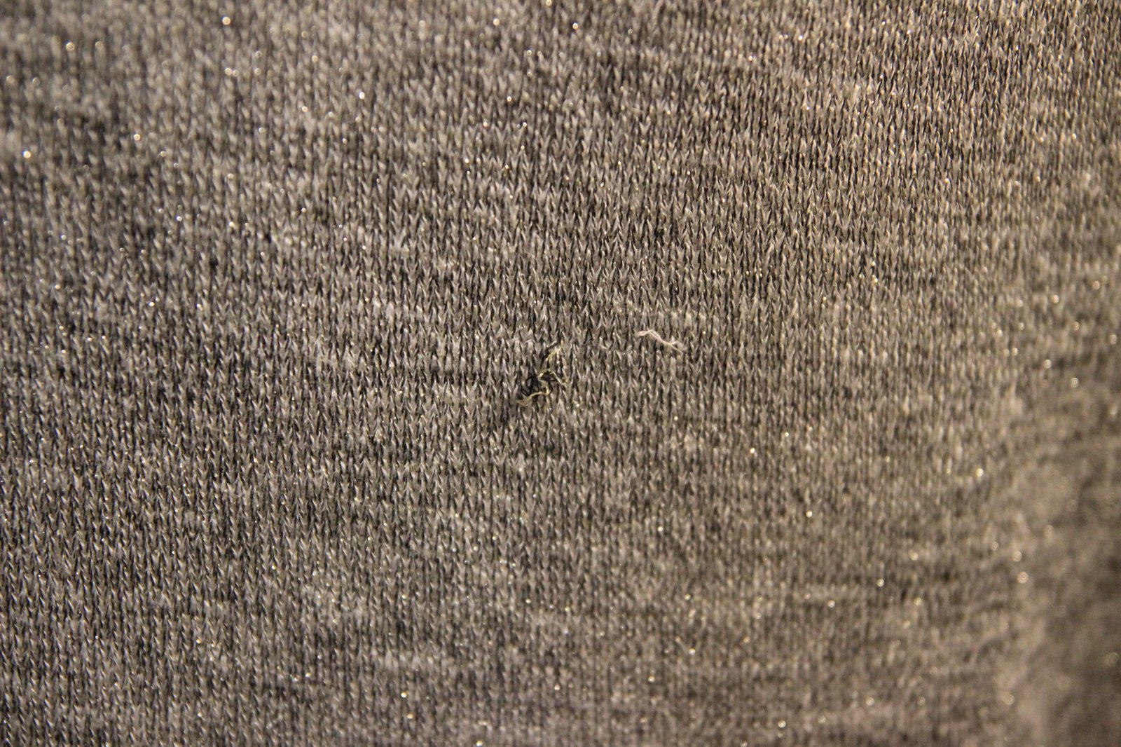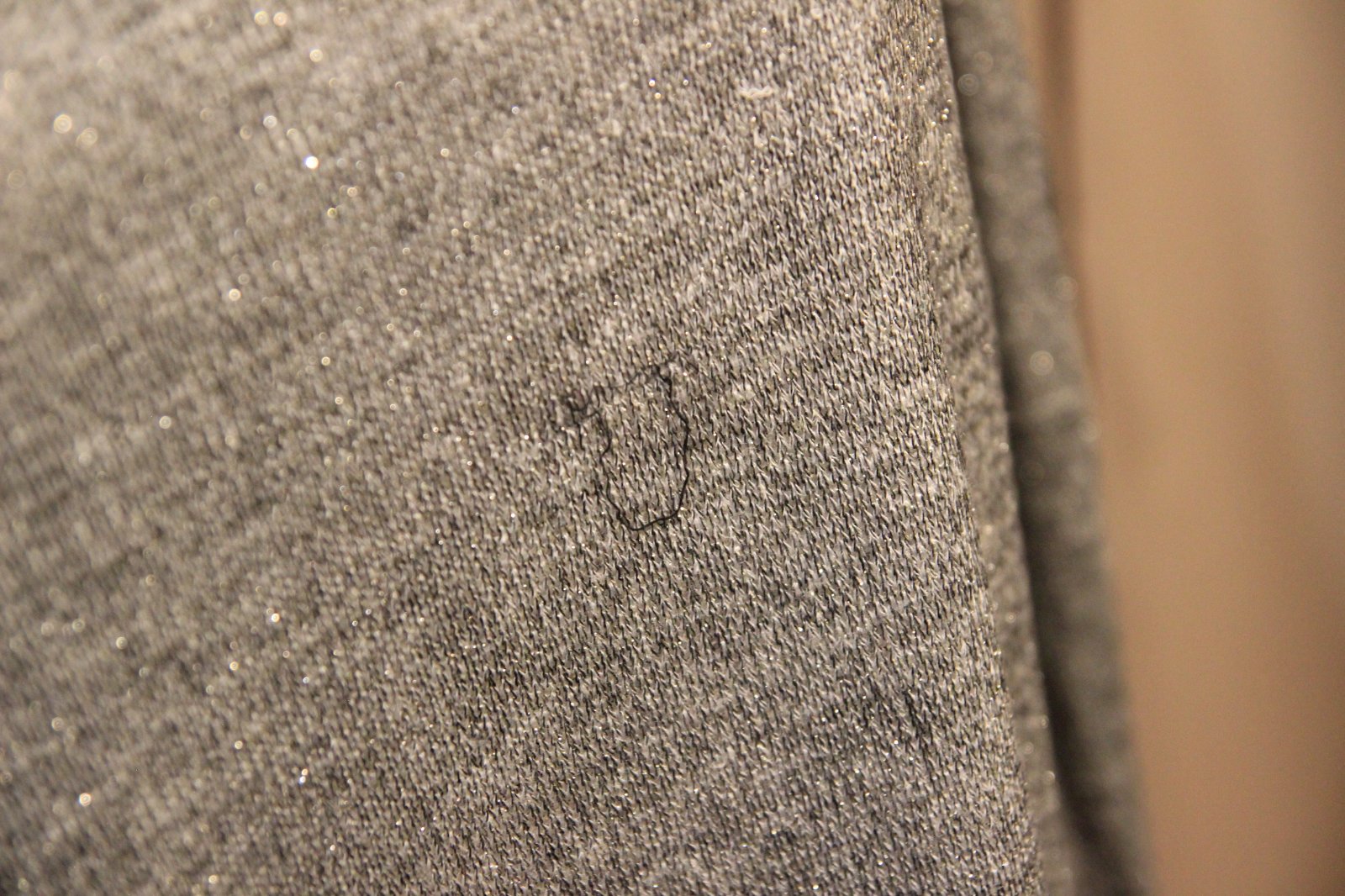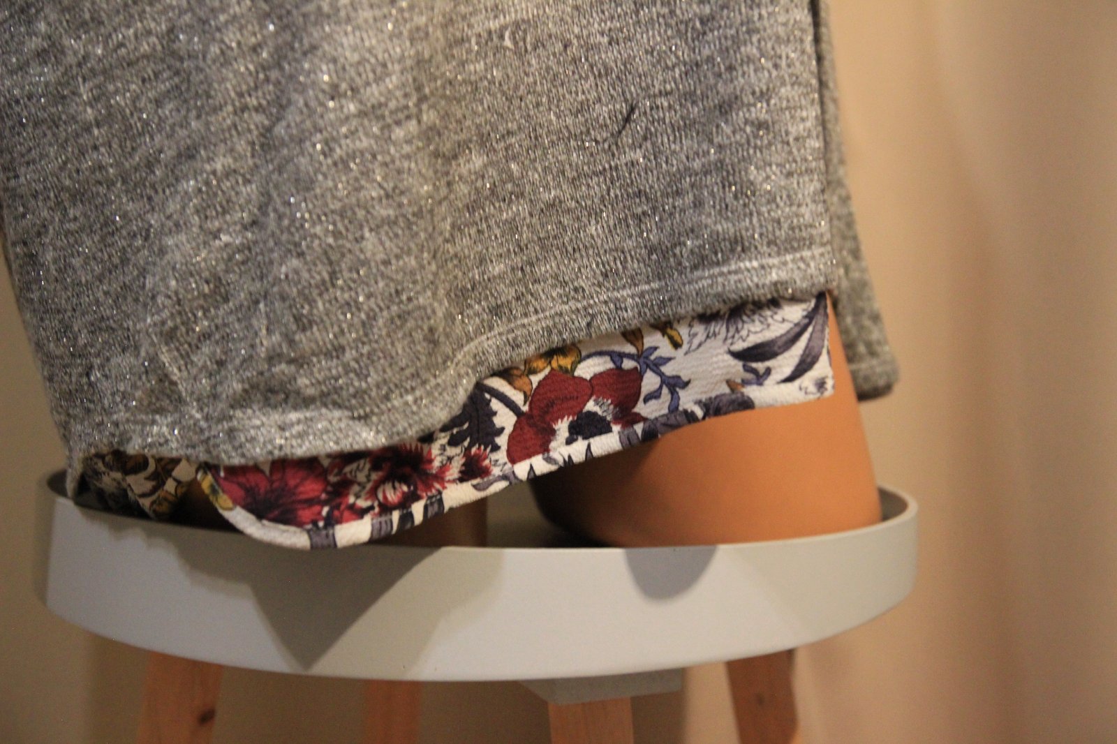 Šedo biely pletený sveter so všitou blúzkou. Svetrík je na viacerých miestach zatiahnutý - viď foto. Veľkosť XL.