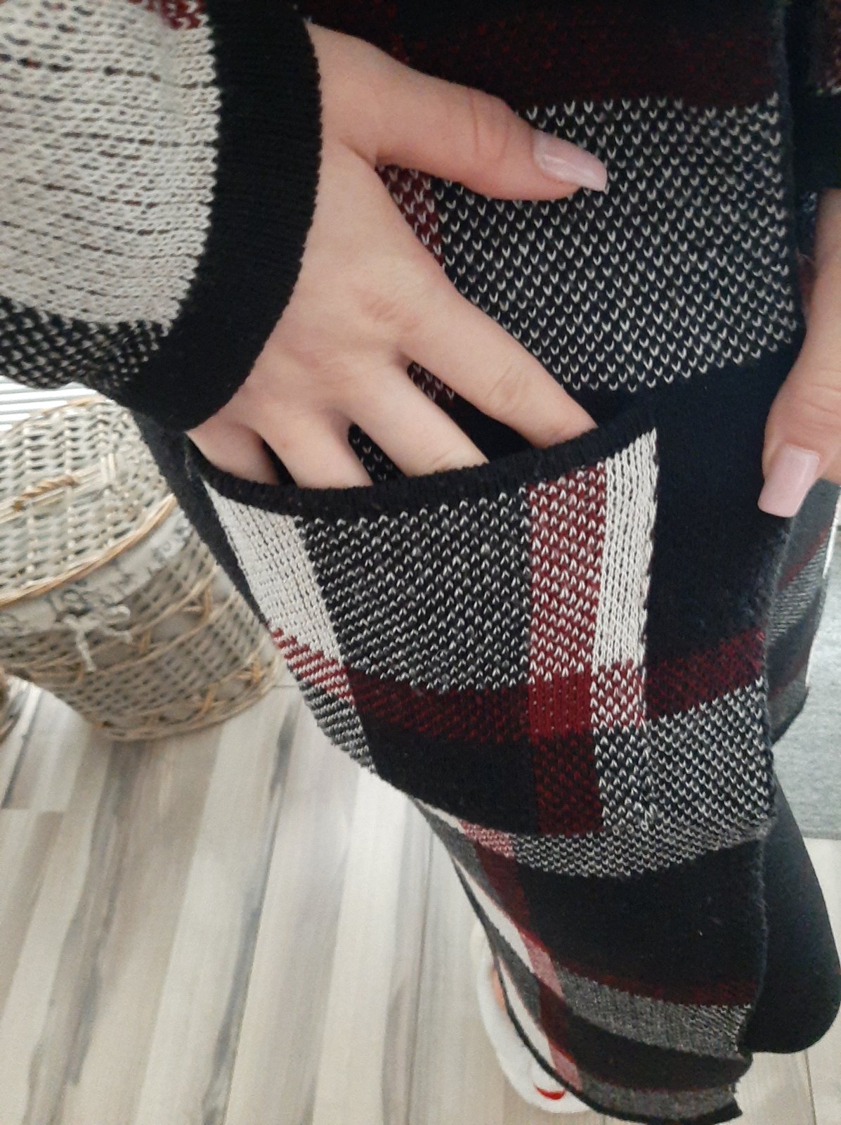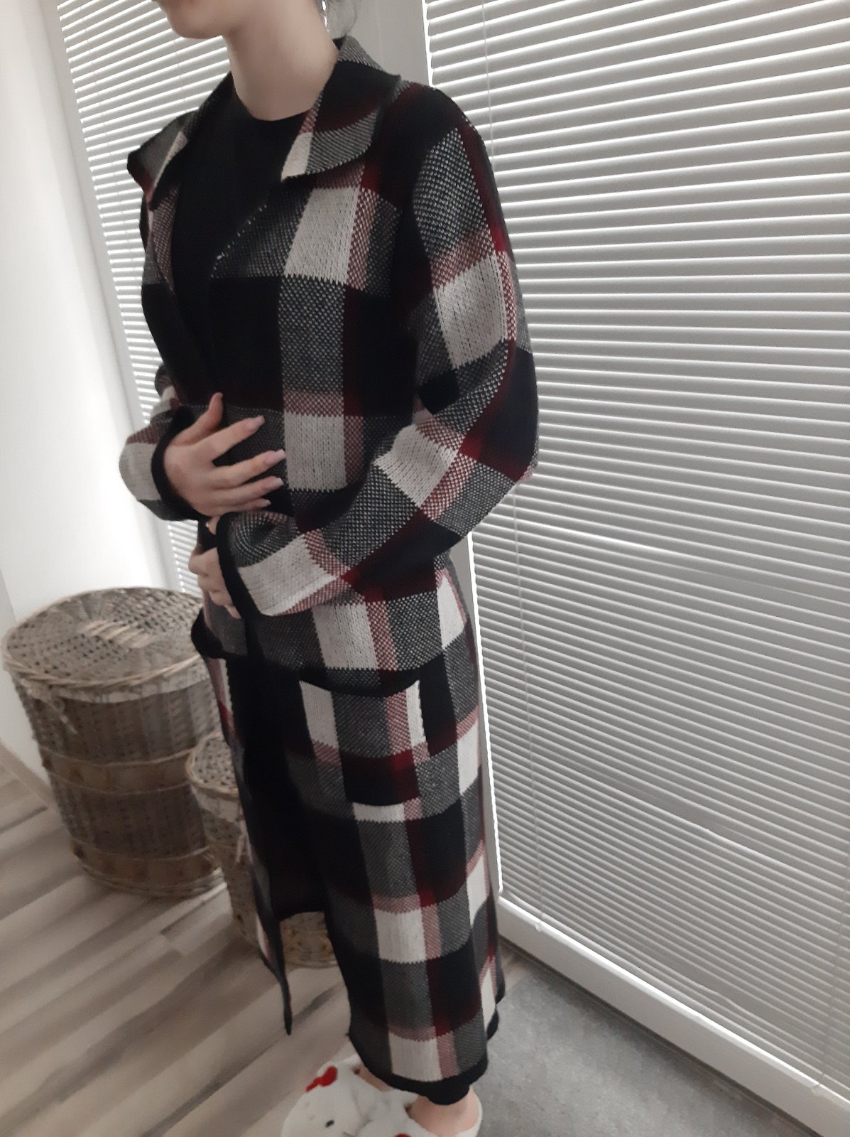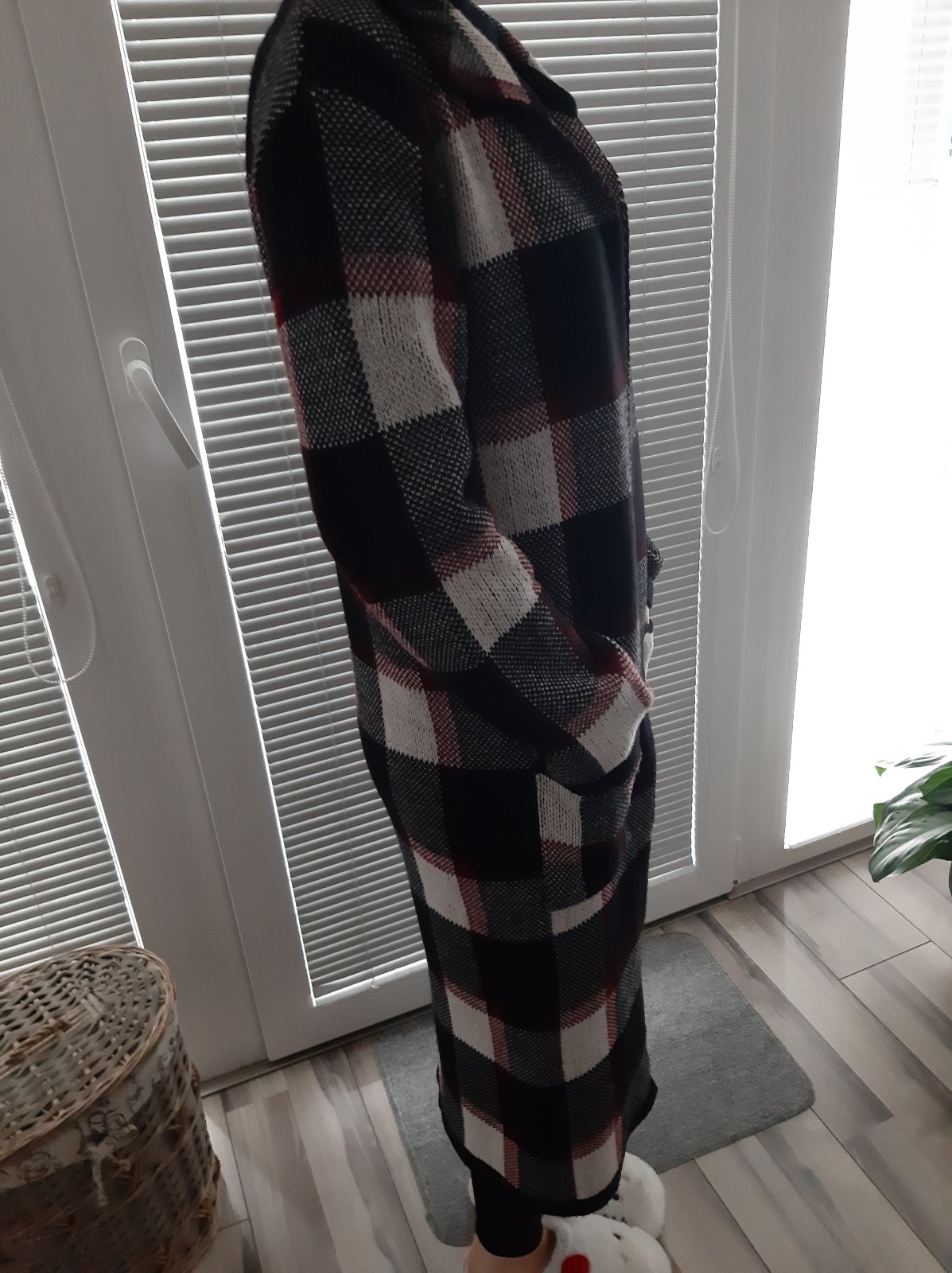 Krasny a nezvyčajny kardigan, dlhy. S vreckami, bez zapinania.