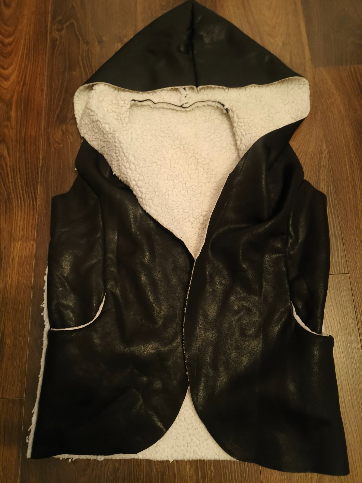 Flísová vesta na nosenie, zapínanie na boku na zips. Bez poškodenia. Flís zachovalý bez žmolkov. Farba je v skutočnosti úplne čierna (nevyblednutá), nevedela som lepšie odfotiť. Veľkosť M-L