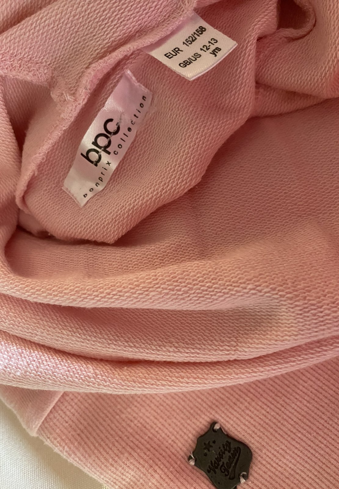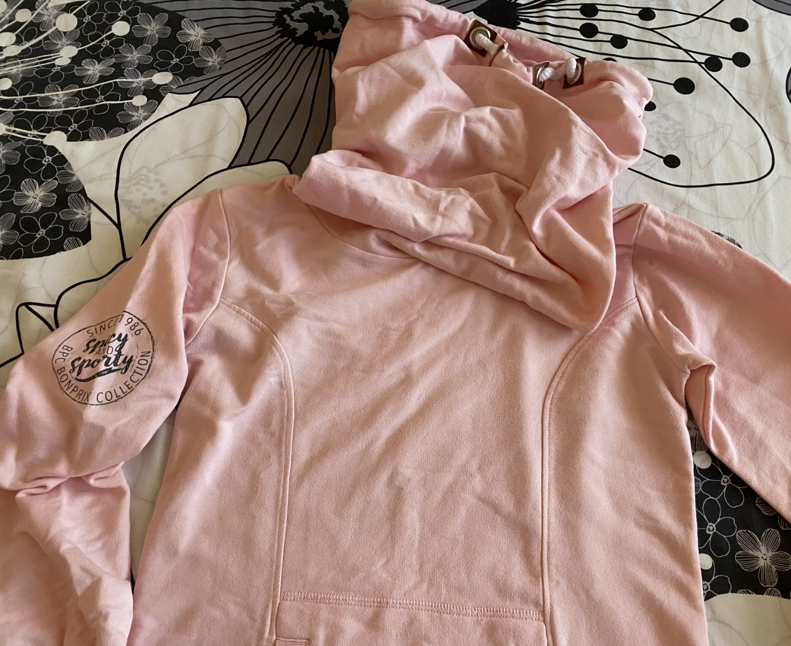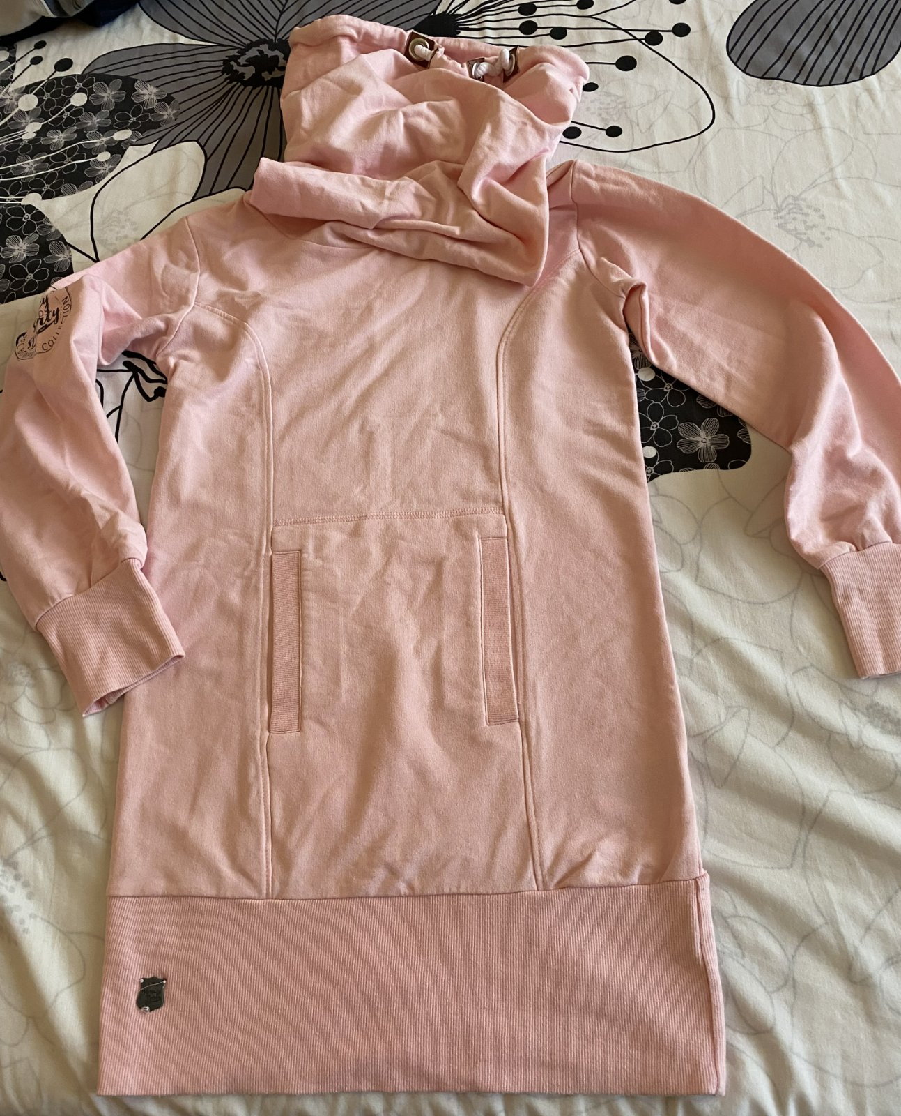 Predĺžená mikina - šaty bpc bonprix v.152/158, kvalitne prepracovaná, kopa pekných detailov - nafotené, materiál 60% bavlna, 35% polyester, 5% elastan, jemná ružová farba, rebrové patenty 2 vrstvové, klokanie vrecko, raz oblečená, v top stave. Miery merané v kľude: dĺžka od krku dolu: 74cm, šírka v podpazuší: 43cmx2, rukáv od ramena: 54cm + 7cm plece k roláku, výška roláka: 40cm, šírka roláka horná časť: 37cmx2, šírka roláka dolná časť: 29cmx2.