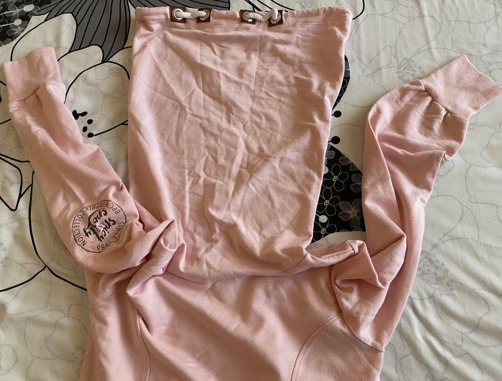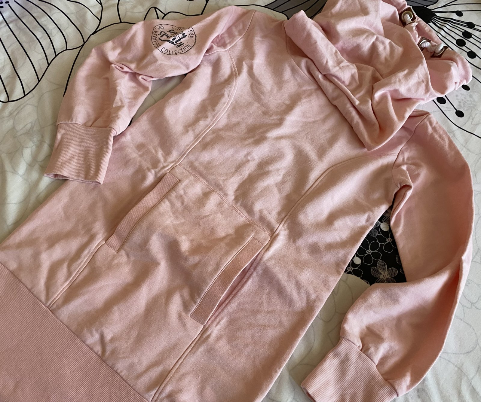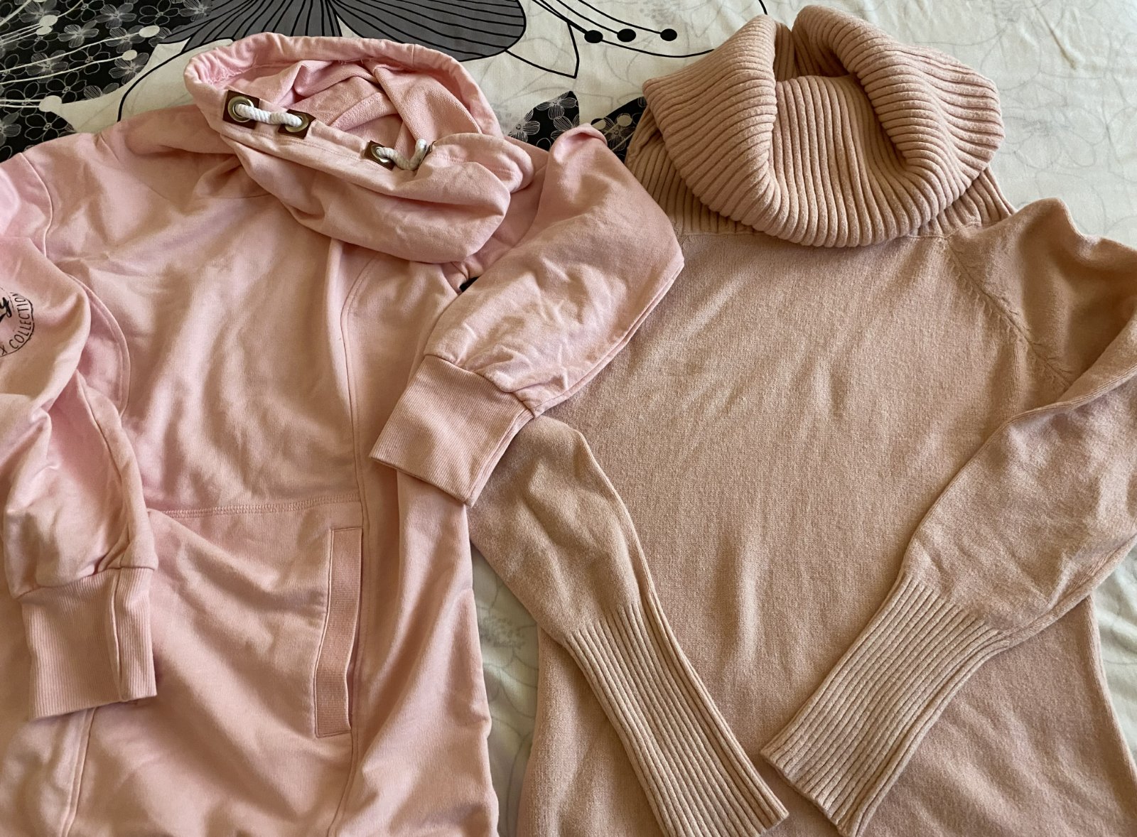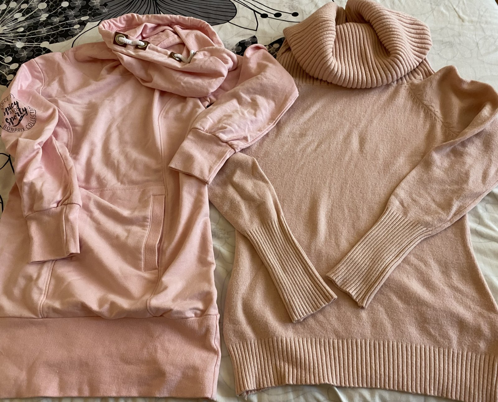 Predĺžená mikina - šaty bpc bonprix v.152/158, kvalitne prepracovaná, kopa pekných detailov - nafotené, materiál 60% bavlna, 35% polyester, 5% elastan, jemná ružová farba, rebrové patenty 2 vrstvové, klokanie vrecko, raz oblečená, v top stave. Miery merané v kľude: dĺžka od krku dolu: 74cm, šírka v podpazuší: 43cmx2, rukáv od ramena: 54cm + 7cm plece k roláku, výška roláka: 40cm, šírka roláka horná časť: 37cmx2, šírka roláka dolná časť: 29cmx2.