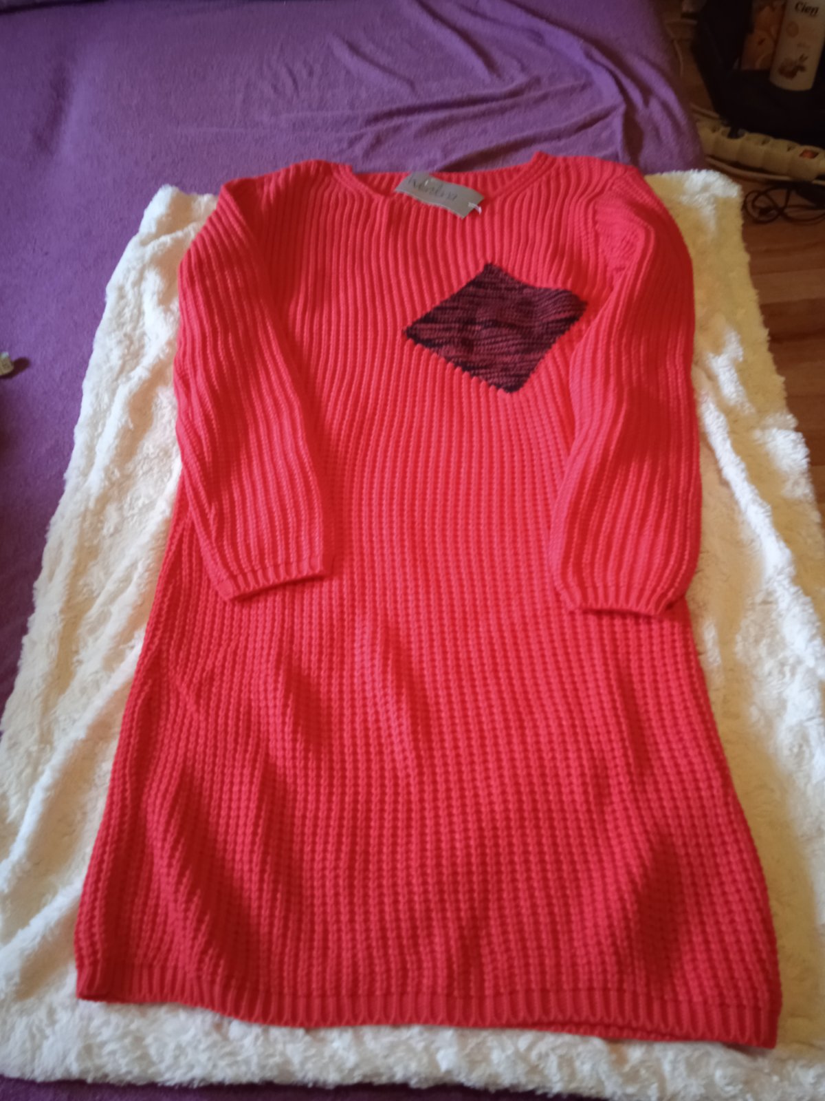 Príjemný, mäkký sveter v štýle colorblocking, v krásnej farebnej kombinácii. Rovný, lodičkový výstrih, ramená sú spustené nižšie. Nový, nenosený, veľkosť je uvedená S, ale sedí na L/XL, dĺžka 59cm,...