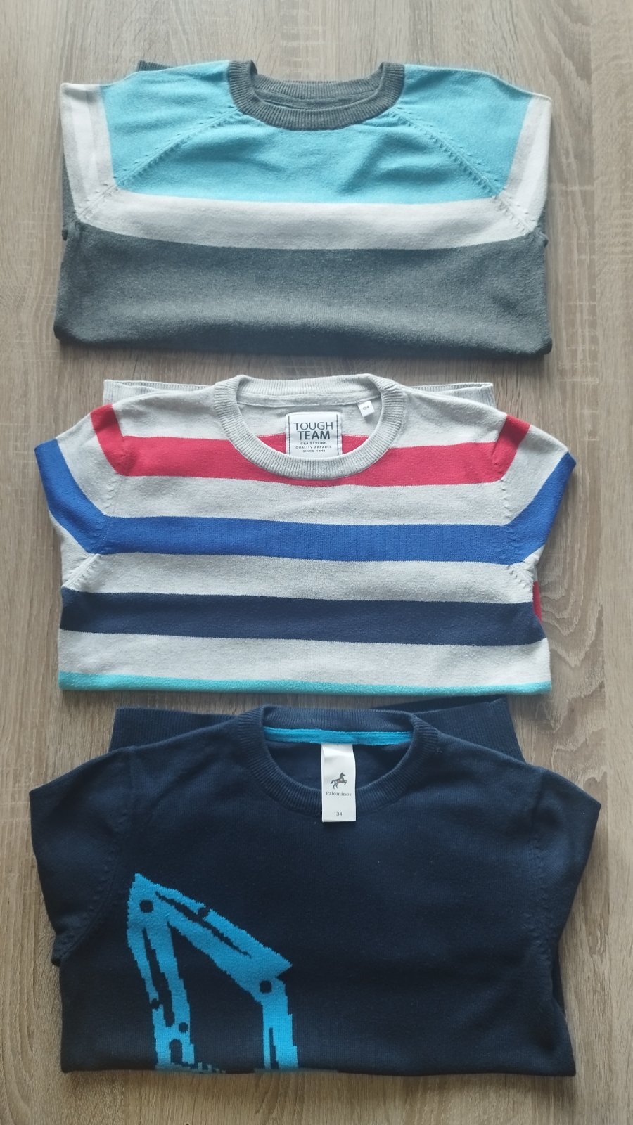 Svetre veľkosť všetky 134. Celková dĺžka 52-53cm. Rukáv od krku 56cm, vnútorný rukáv 37cm. Šírka pod pazuchami 2x40cm. Bez poškodenia. Dobrý nosený stav. Len spolu