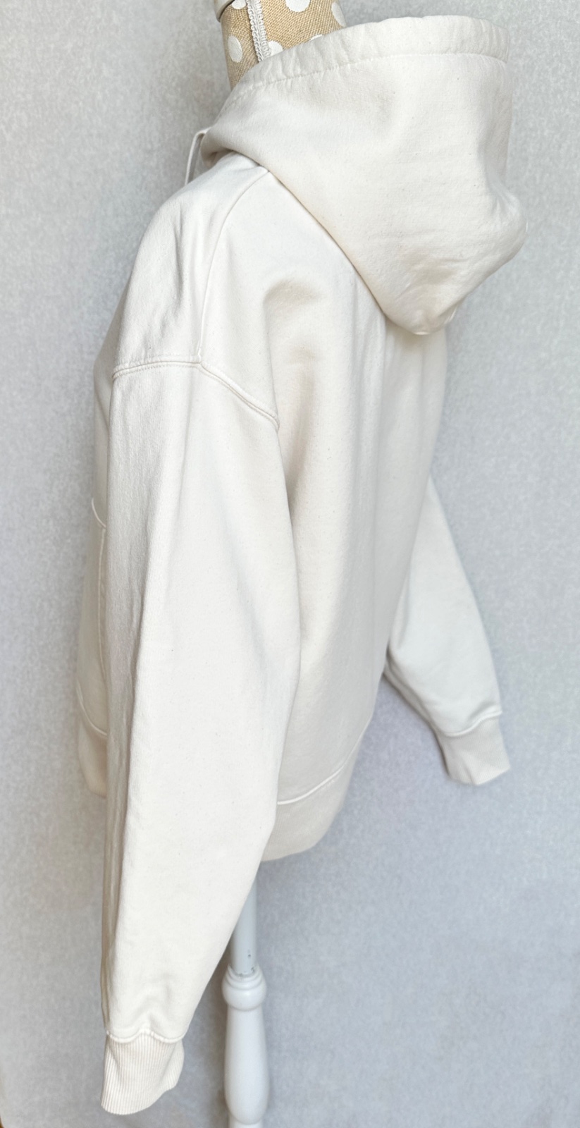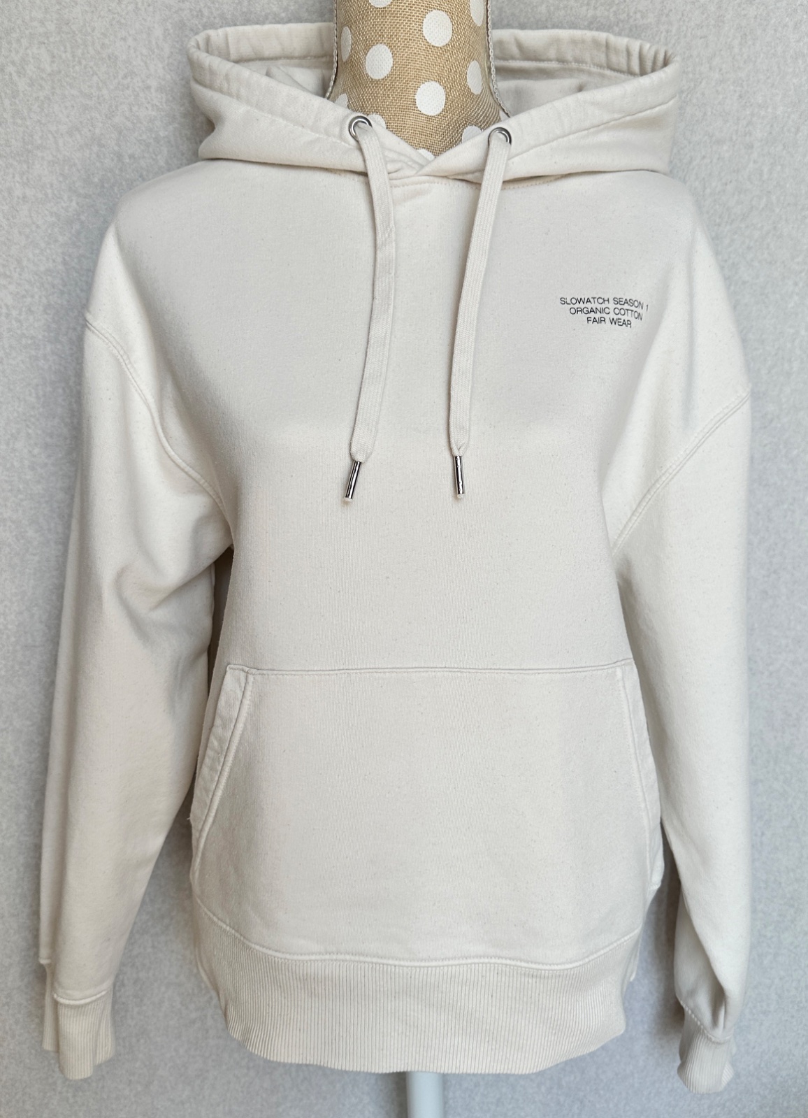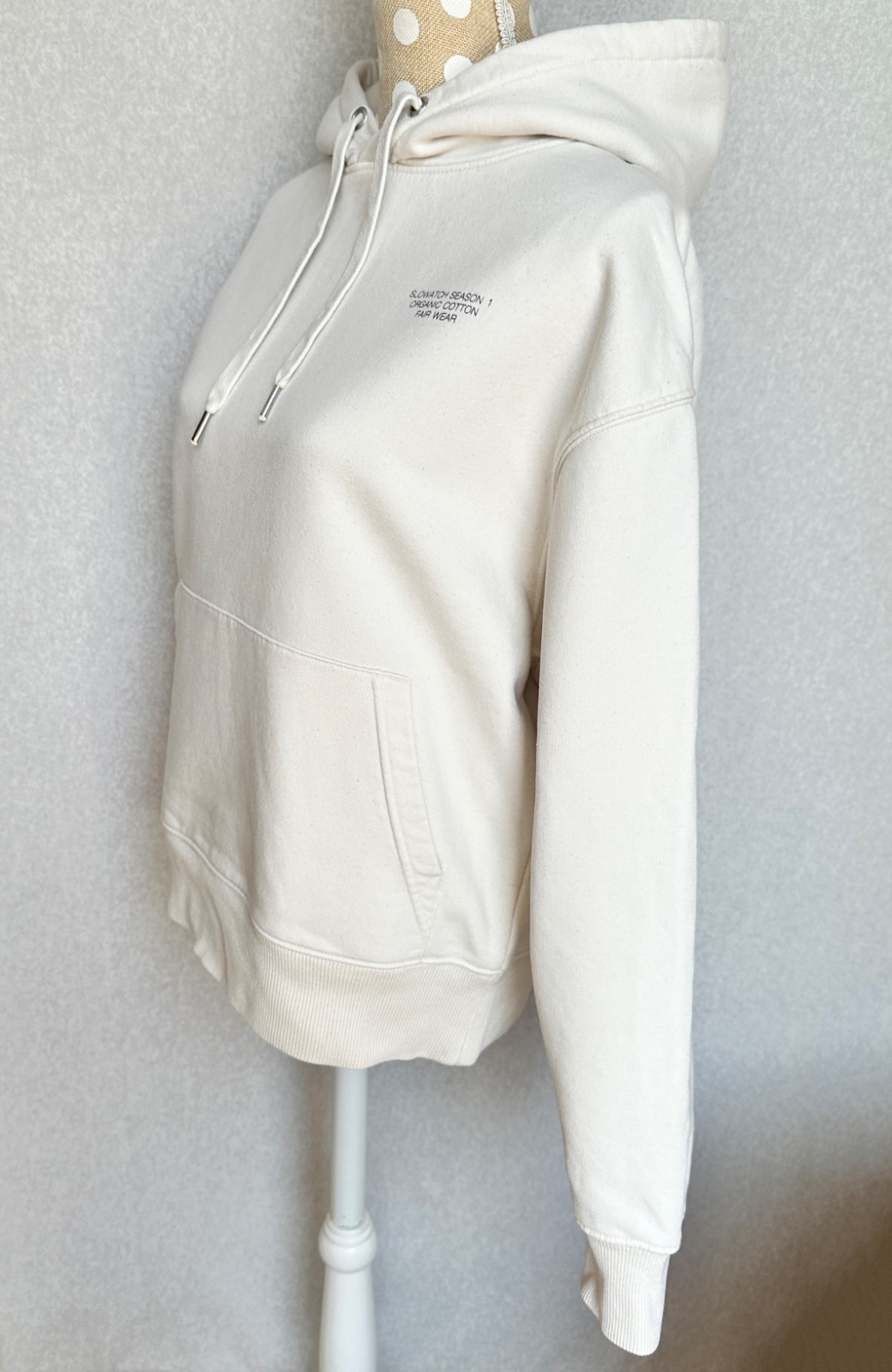 Kvalitná mikina v smotanovej bielej farbe, v super stave, bez poškodení. Uvedená veľkosť je XS, ale mierami sedí skôr na S/M. 85 % bio bavlna, 15 % polyester z recalovaných materiálov. Pranie v pračke 30°C.