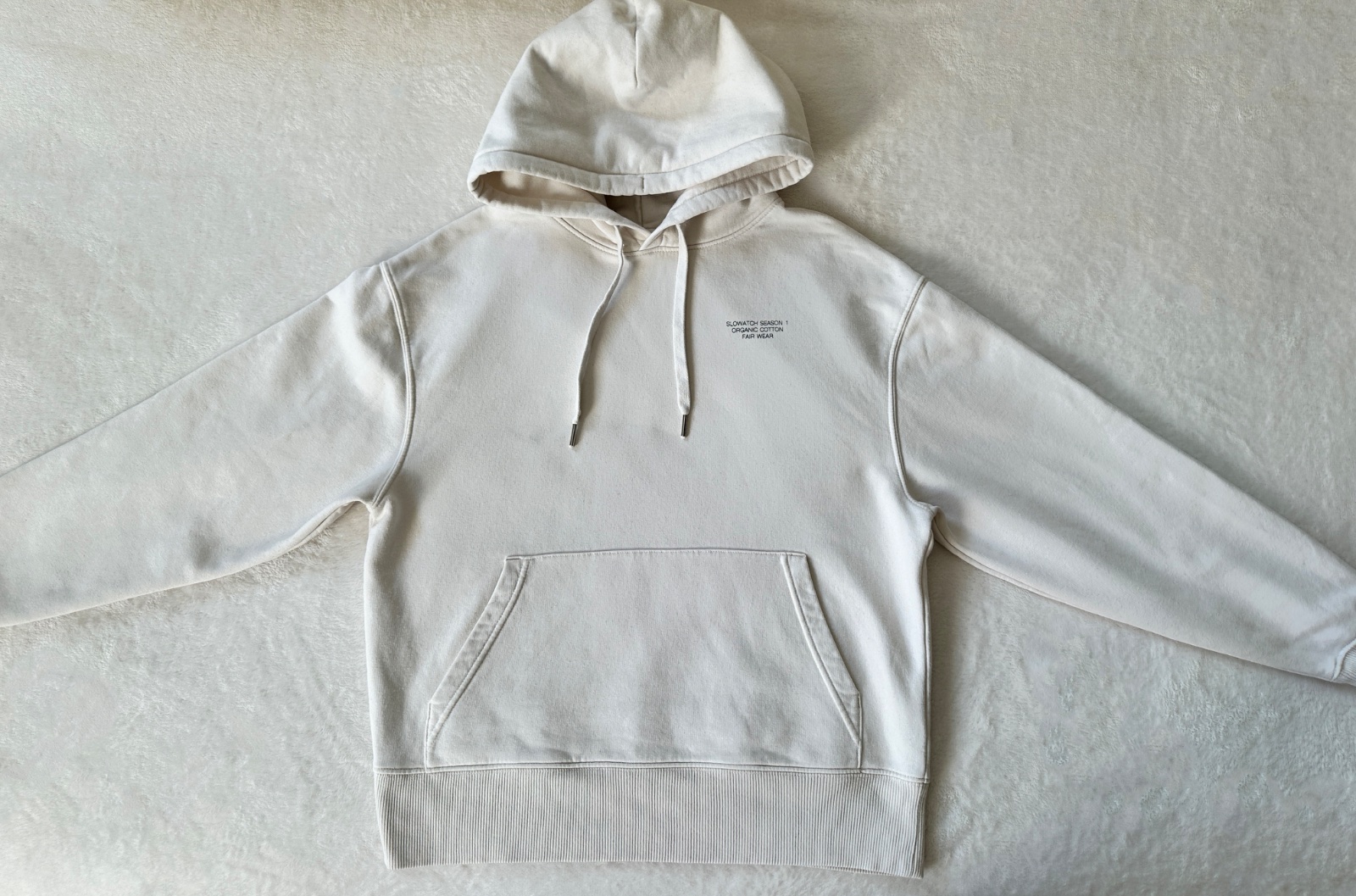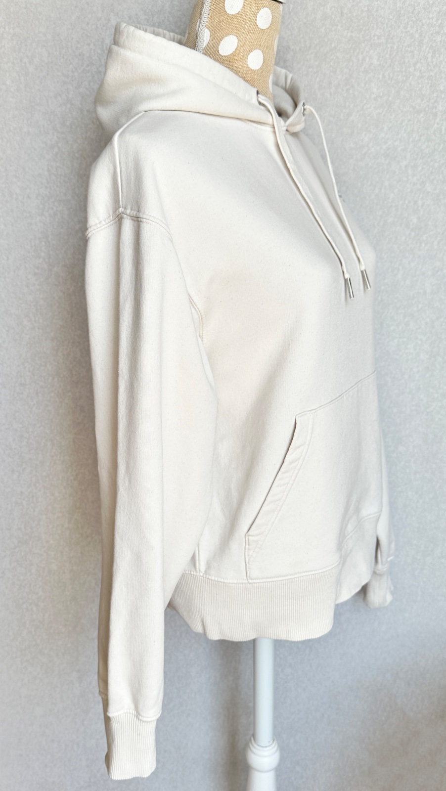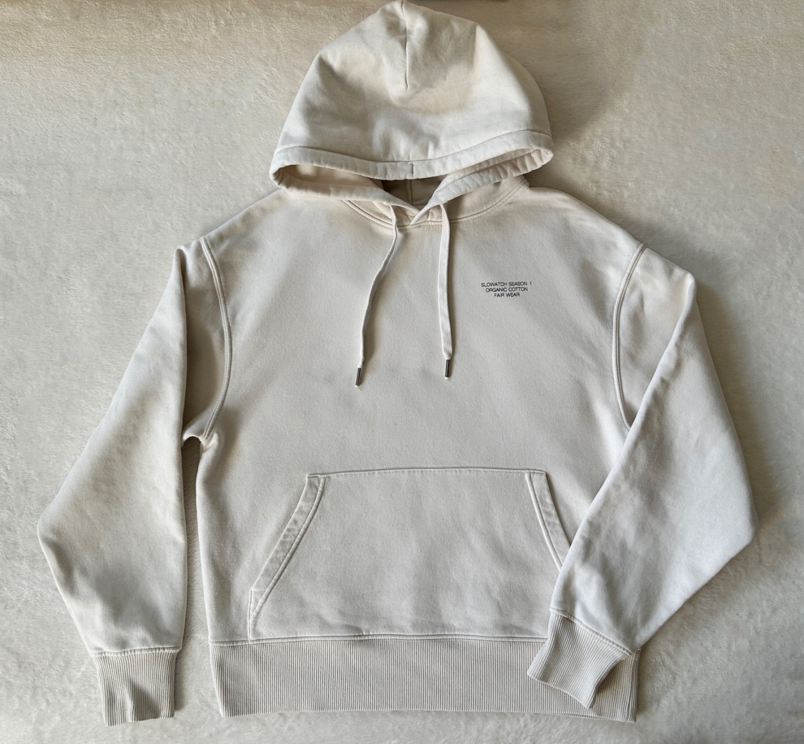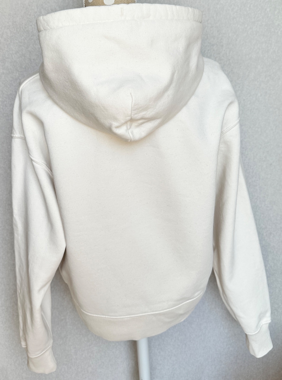 Kvalitná mikina v smotanovej bielej farbe, v super stave, bez poškodení. Uvedená veľkosť je XS, ale mierami sedí skôr na S/M. 85 % bio bavlna, 15 % polyester z recalovaných materiálov. Pranie v pračke 30°C.