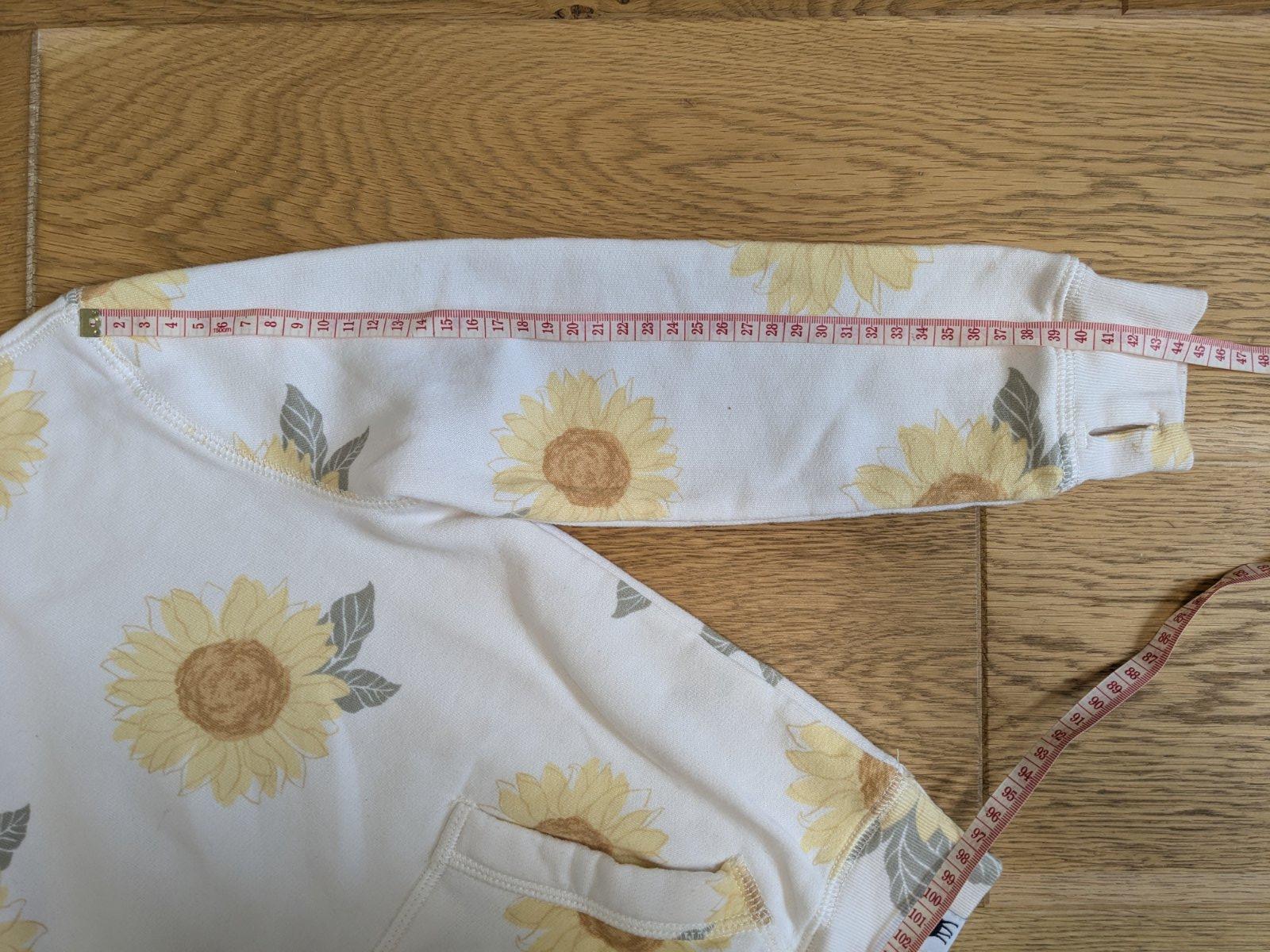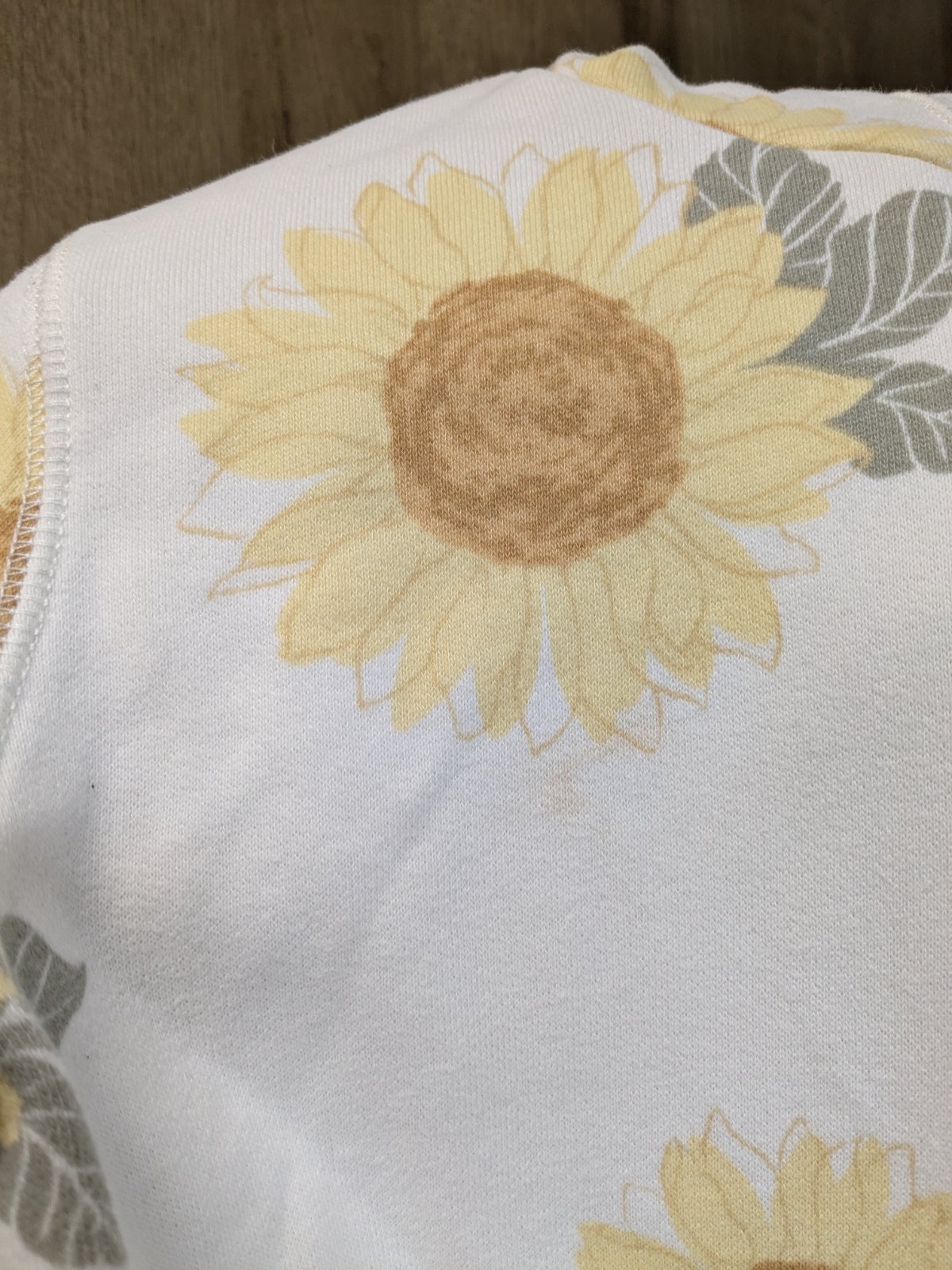Na prednej časti je pod slnečnicou malý bledohnedý fliačik, je viditeľný pri bližšom skúmaní. Na rukávoch sú v patente dierky na prevlečenie palca.