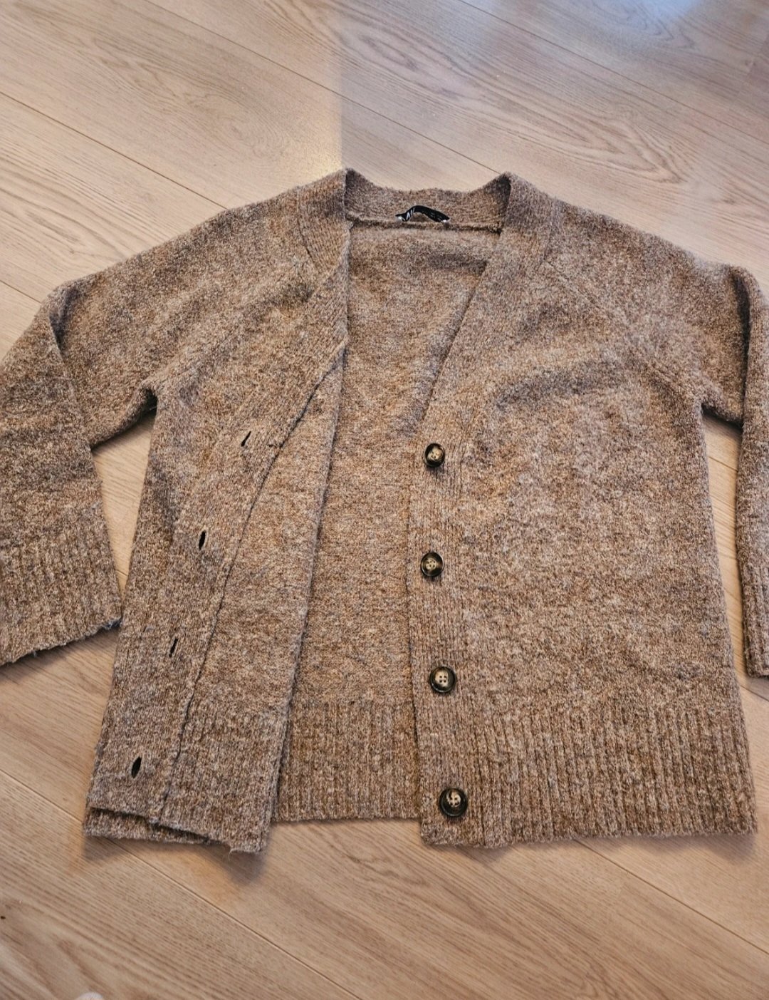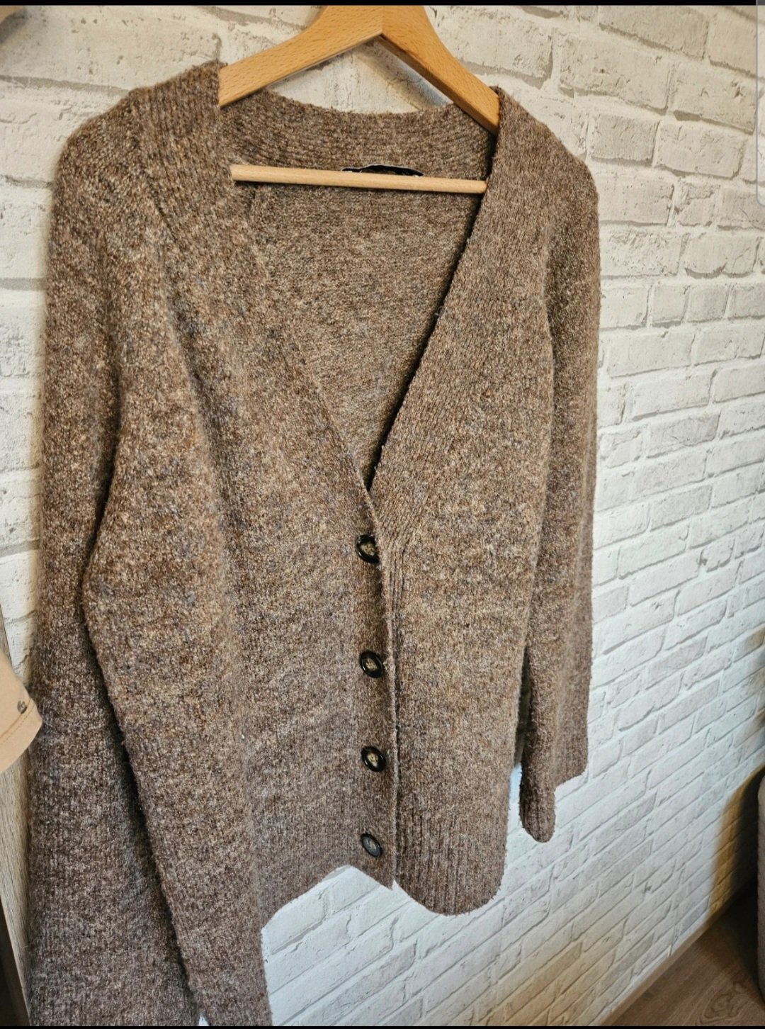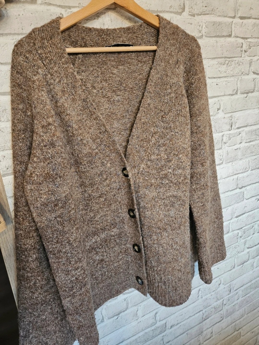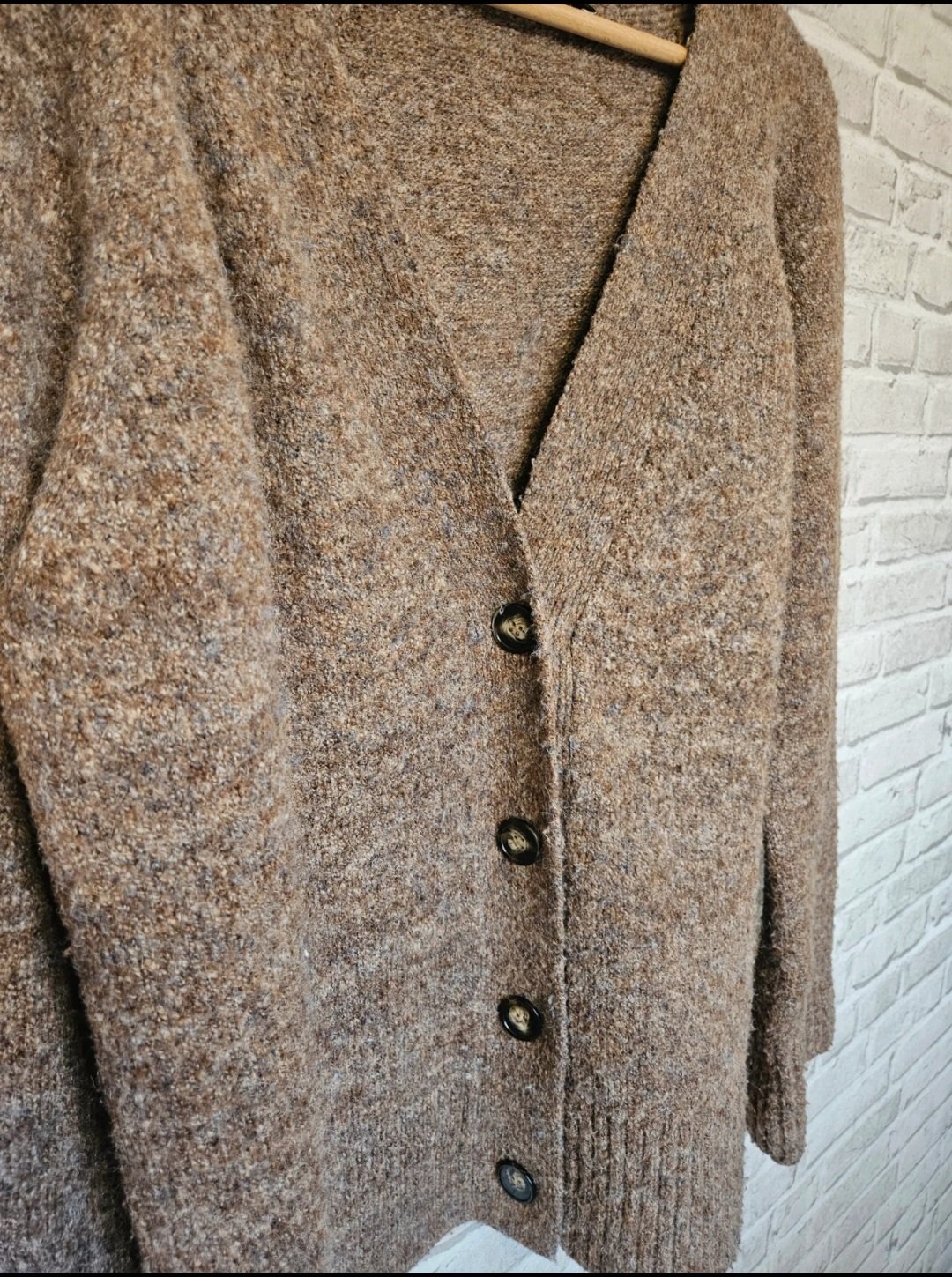Nosený kvalitný kardigan, hrubší., je nosený, má žmolky.,( zohľadnené v cene) po bokoch dve efektné vrecká