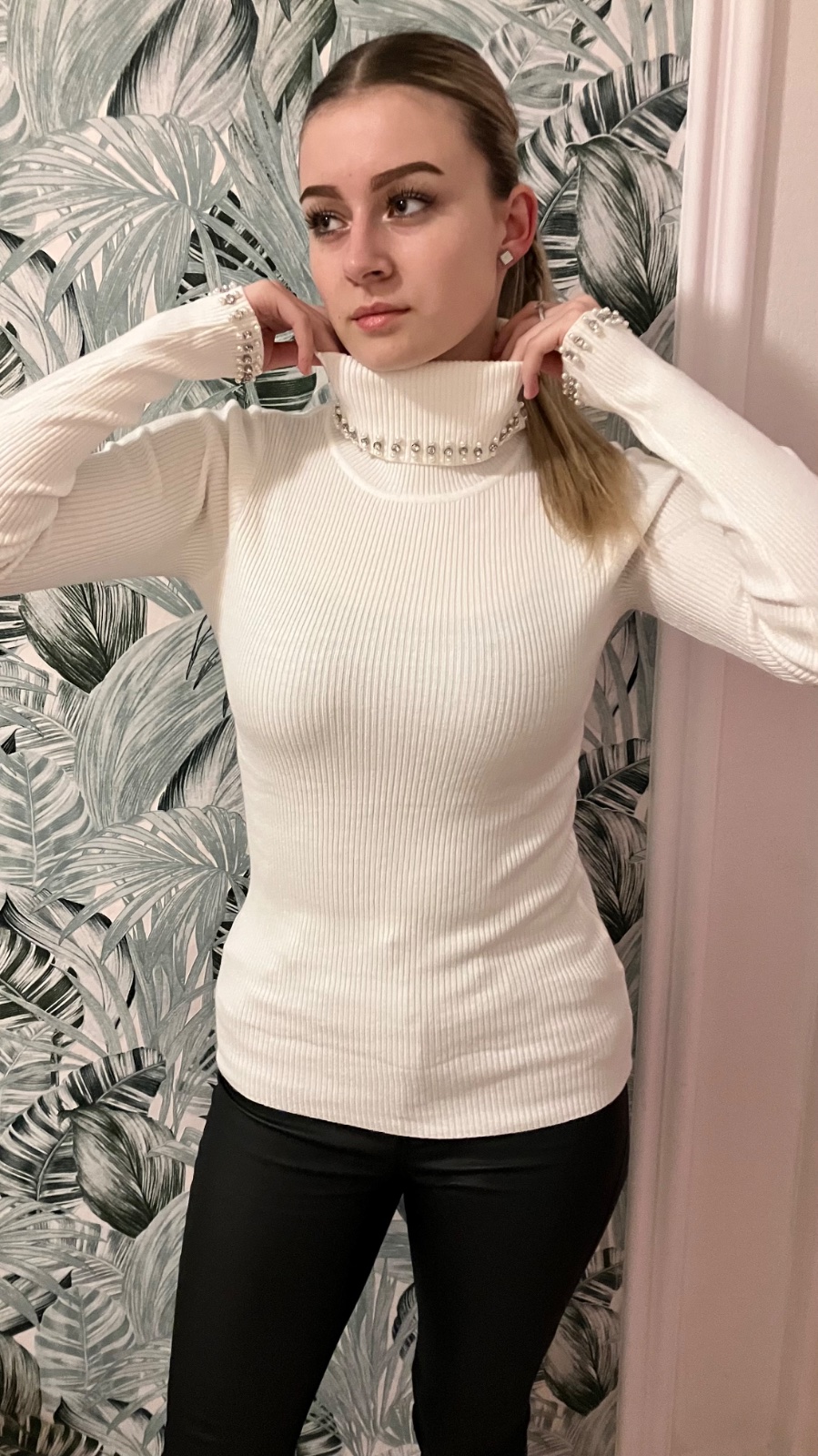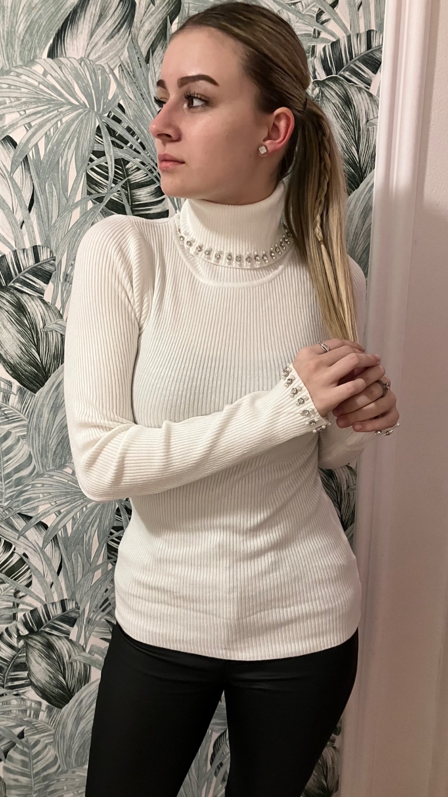 Dámske štýlové vrúbkované tričko s rolákom. Stojačik a rukáv zdobený so štrasovými kamienkami a korálkami. Vďaka elastickému materiálu sa skvele prispôsobí postave. Materiál: 50% viskóza, 28% polyester, 22% nylon. Veľkosť UNI ( vhodné pre S,M,L). Krajina pôvodu: ČĽR.