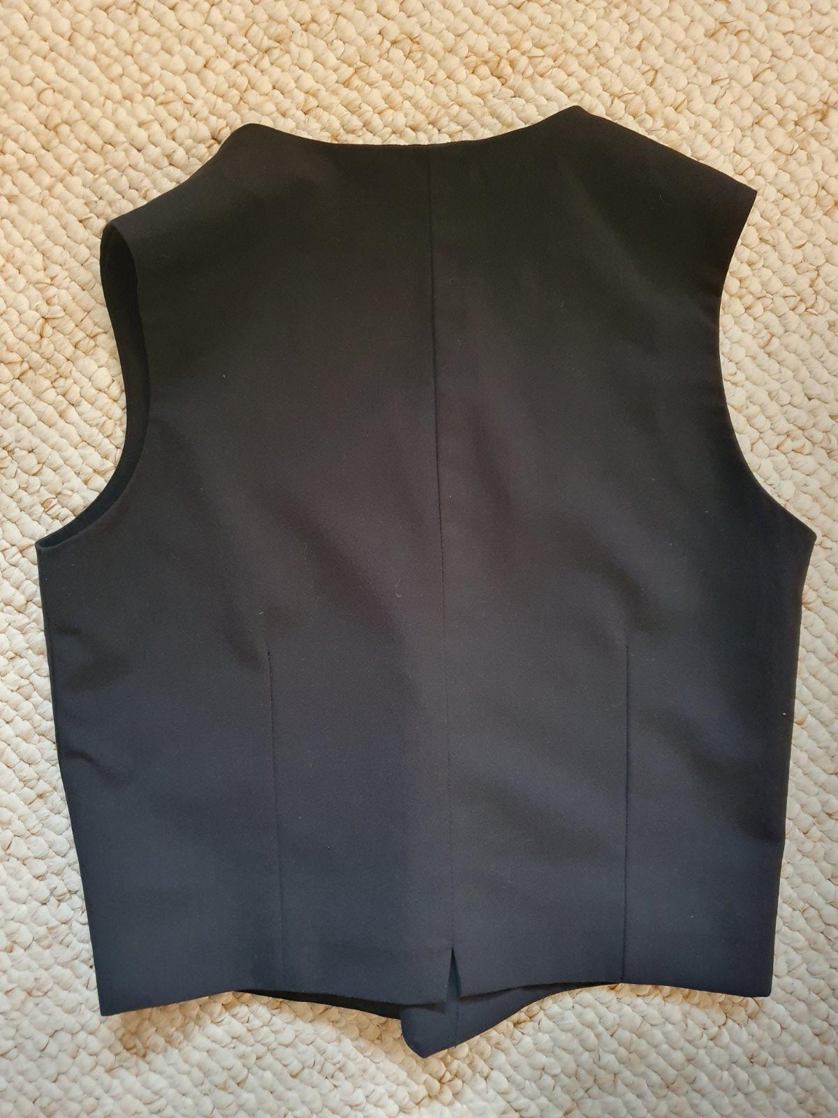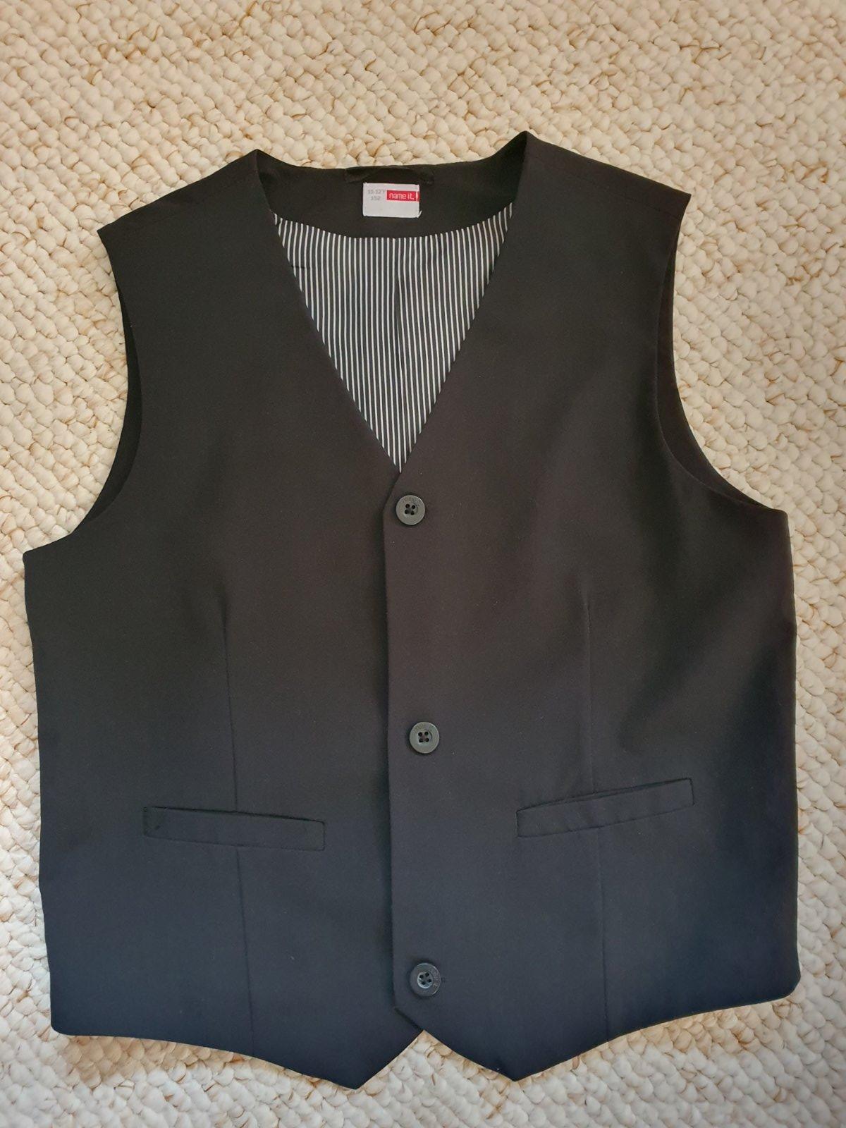 Predám krásnu chlapčenskú vestičku čiernej farby veľkosti 152, značky Name it. Je veľmi málo nosená, iba na spoločenské udalosti. Vpredu má krásne vypracované 2 vrecká, aj vzadu je vesta ušitá z vrchného materiálu, nie s podšívky, ako na niektorých vestách býva. Zadná dĺžka vesty je 45 cm, šírka v hrudnej časti 44 cm. Je ako nová.