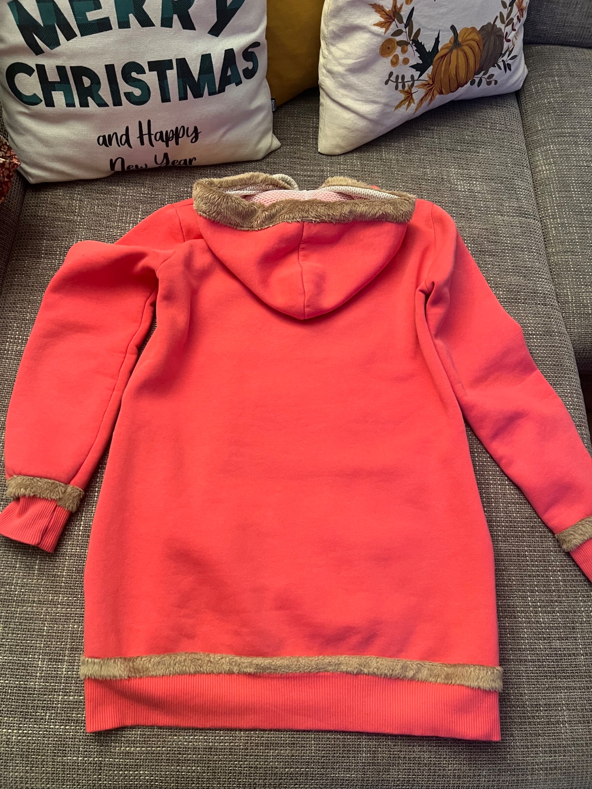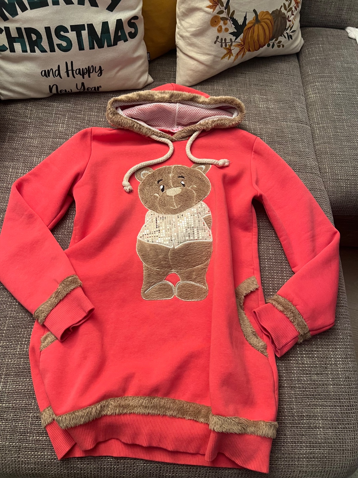 Krásna, predĺžená mikina lososovej farby.