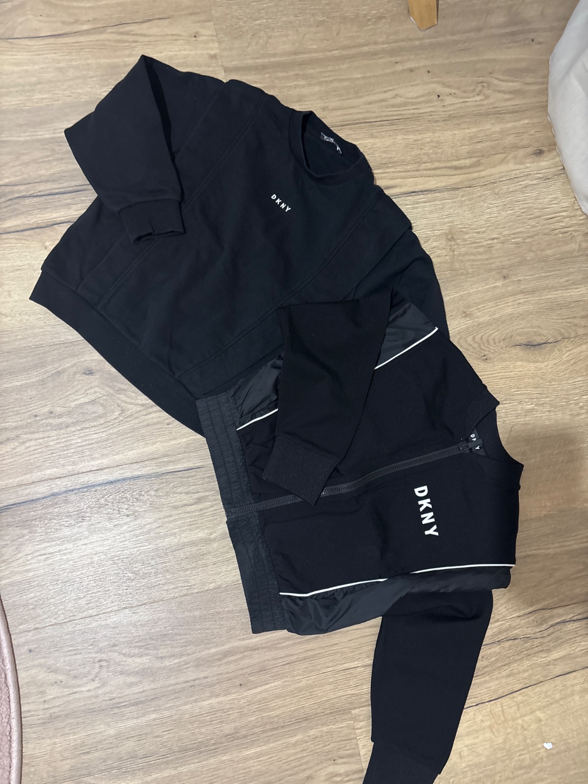 Zateplená mikina s kapucňou pre dievčatá so zapínaním na zips, čierna lesklá 3D aplikácia DKNY cez hrudník, dlhé patenty na rukávoch umožňujú regulovať potrebnú dĺžku rukávov, vo výbornom stave, uv...
