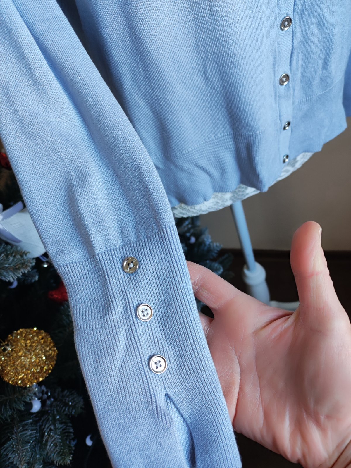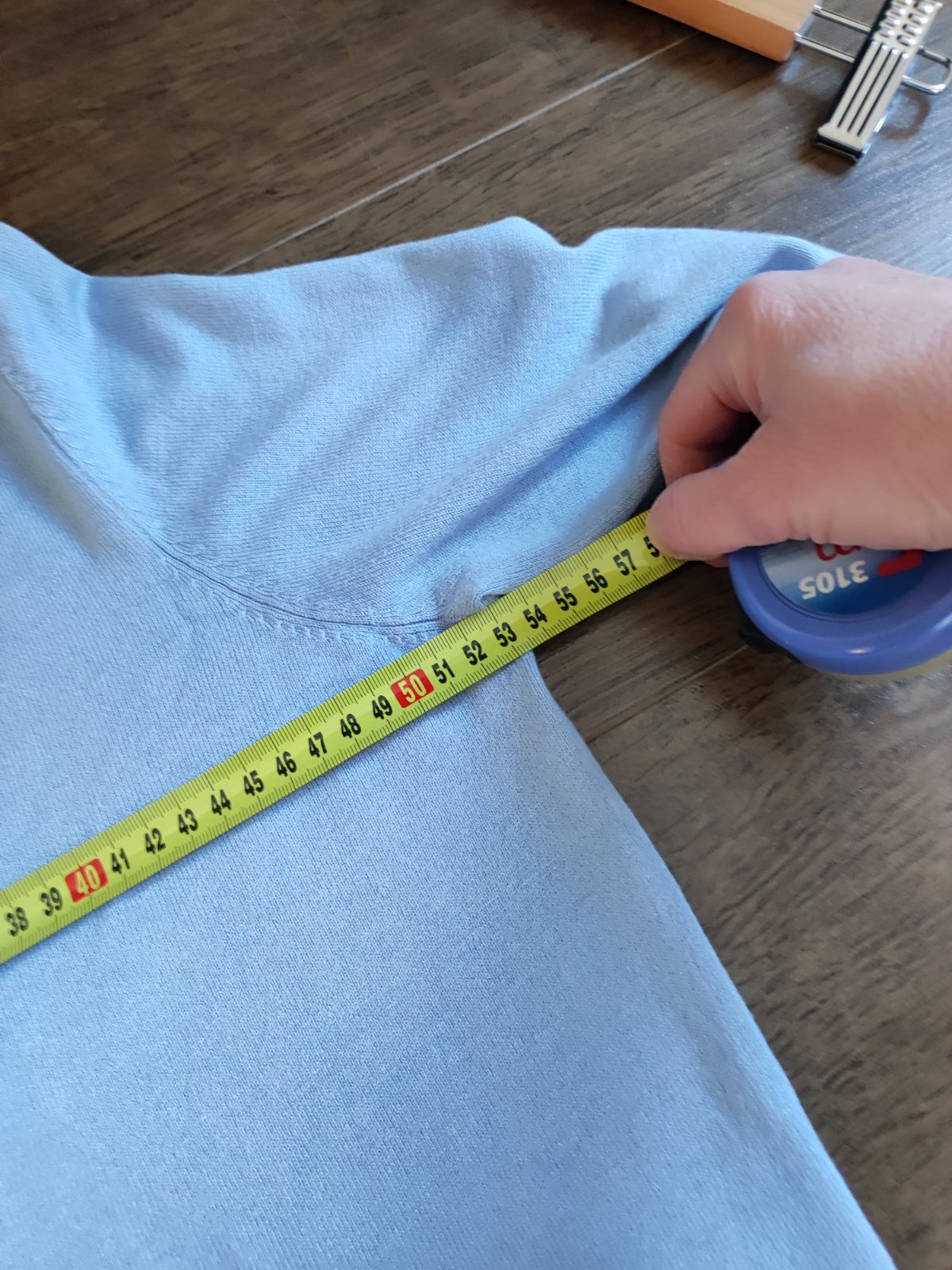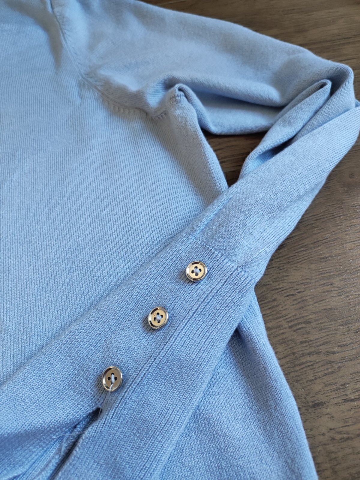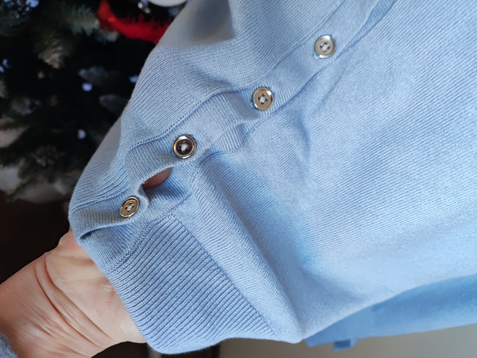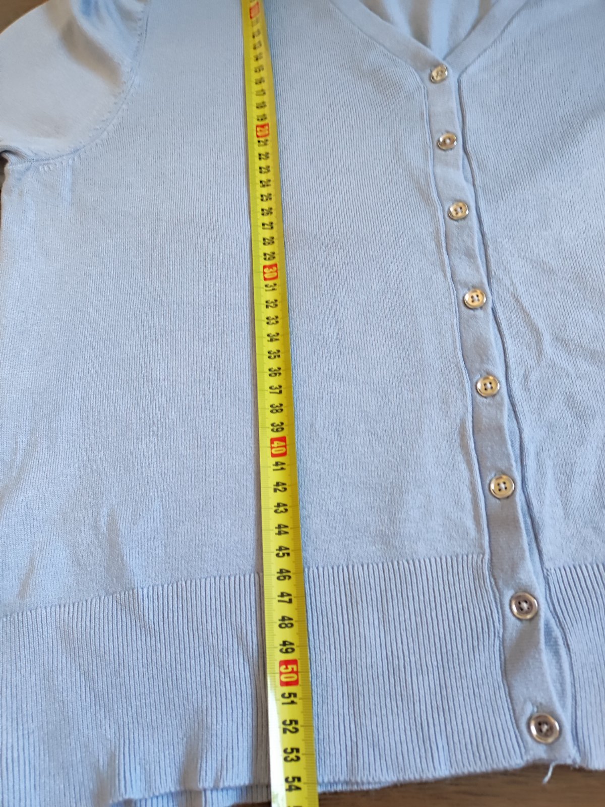 pekný belasý svetrík s okrúhlym výstrihom, vyrobený na Slovensku, 100% bavlna, veľmi ľahký, tenký, príjemný. na prednej strany sú 4 drobné fliačiky, neskúšala som vyprať dlžka 64cm šírka 51cm x2