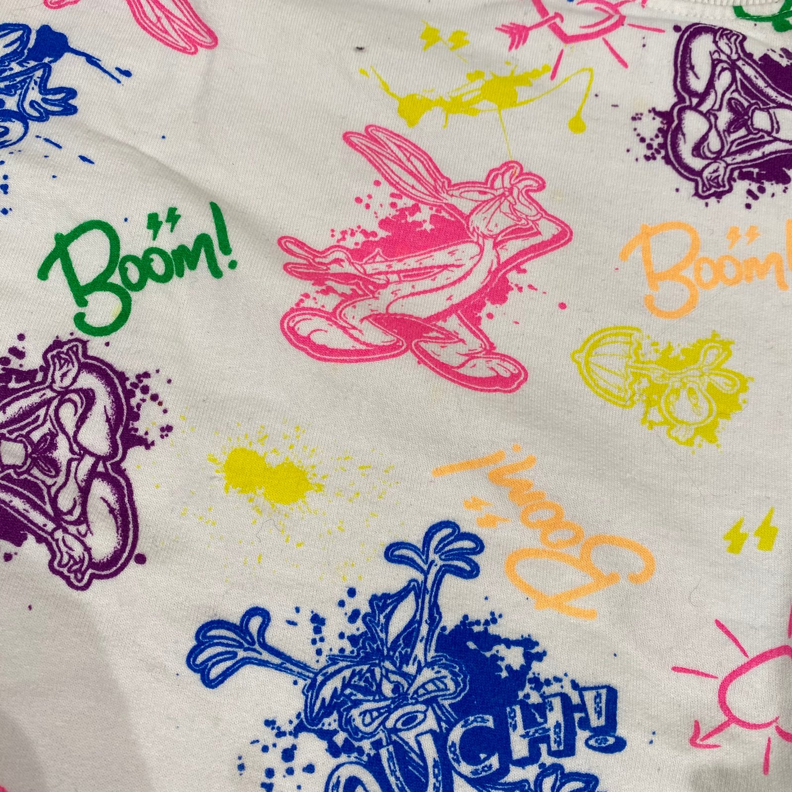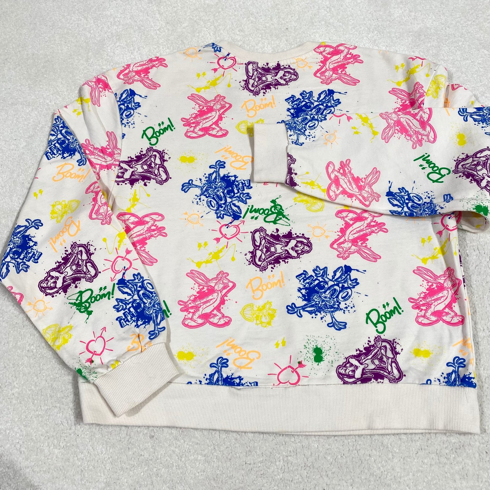 Biela mikina z neónovými obrázkami z teplákoviny, v dobrom stave. Dĺžka je 55cm, šírka je 50cm, dĺžka rukáva 54cm. Veľkosť 158/164
