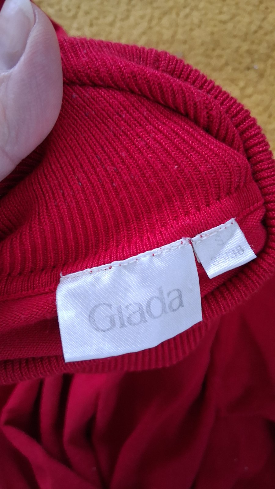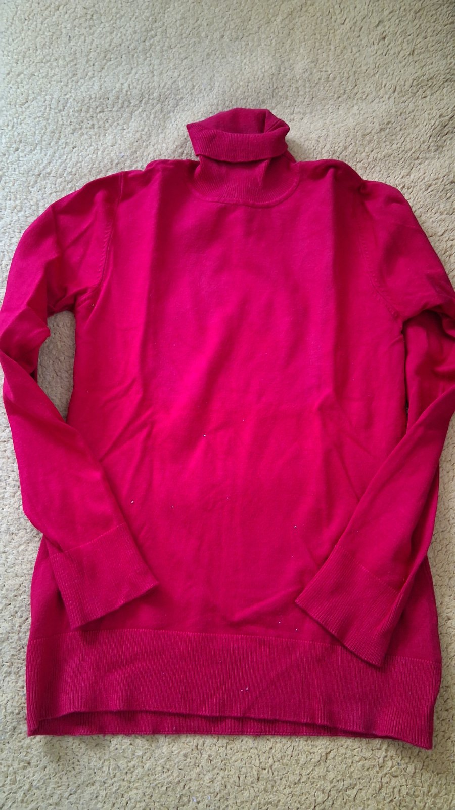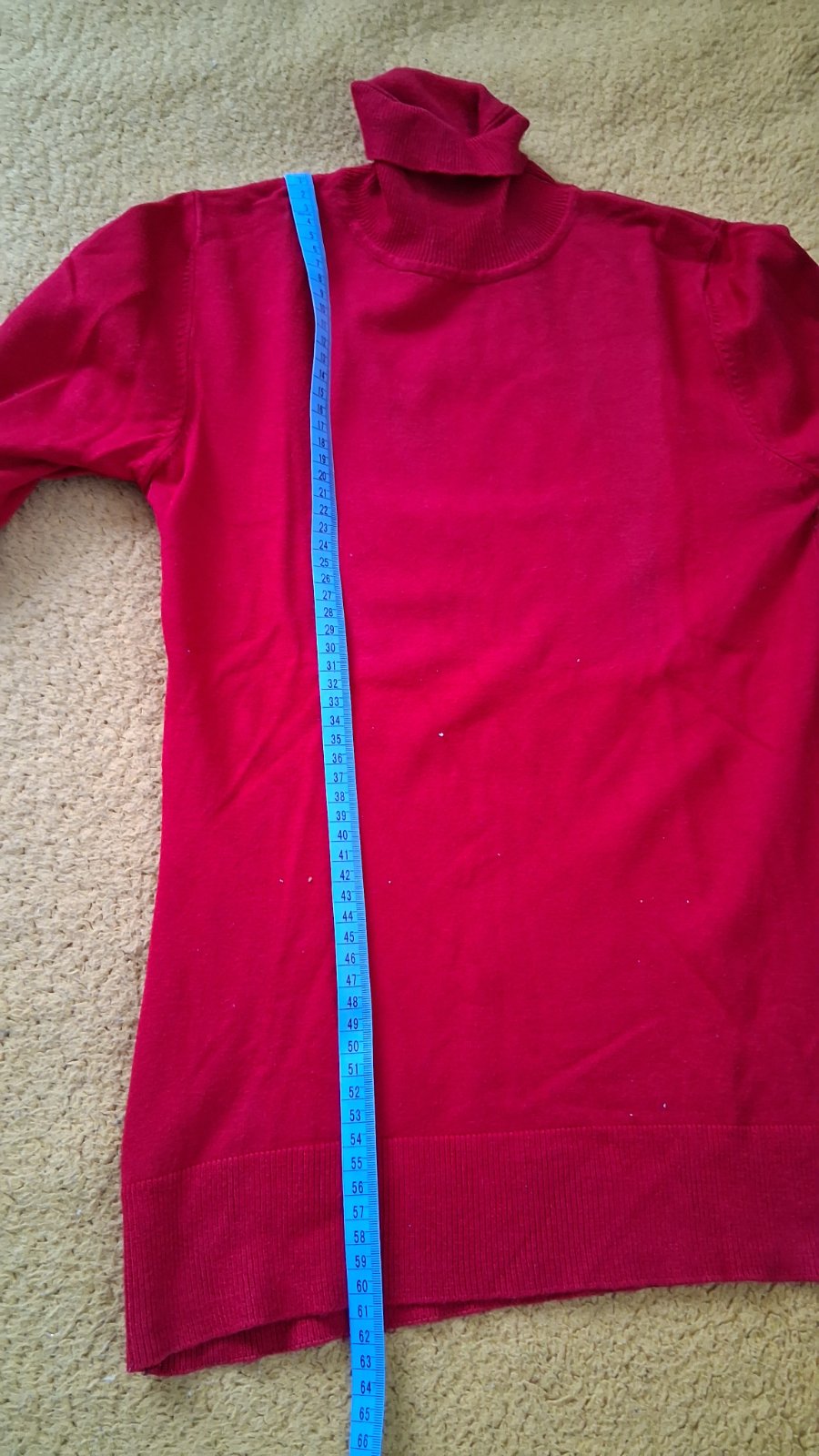 obsahuje akryl takže sú jemnučké žmolky,nijak to nevadí užívaniu,variabilný rolák,farba červeno - bordová sýta, širka merana pod pazuchou v kľude 43 cm poddá sa do 46 cm a dlzka celkom 60 cm