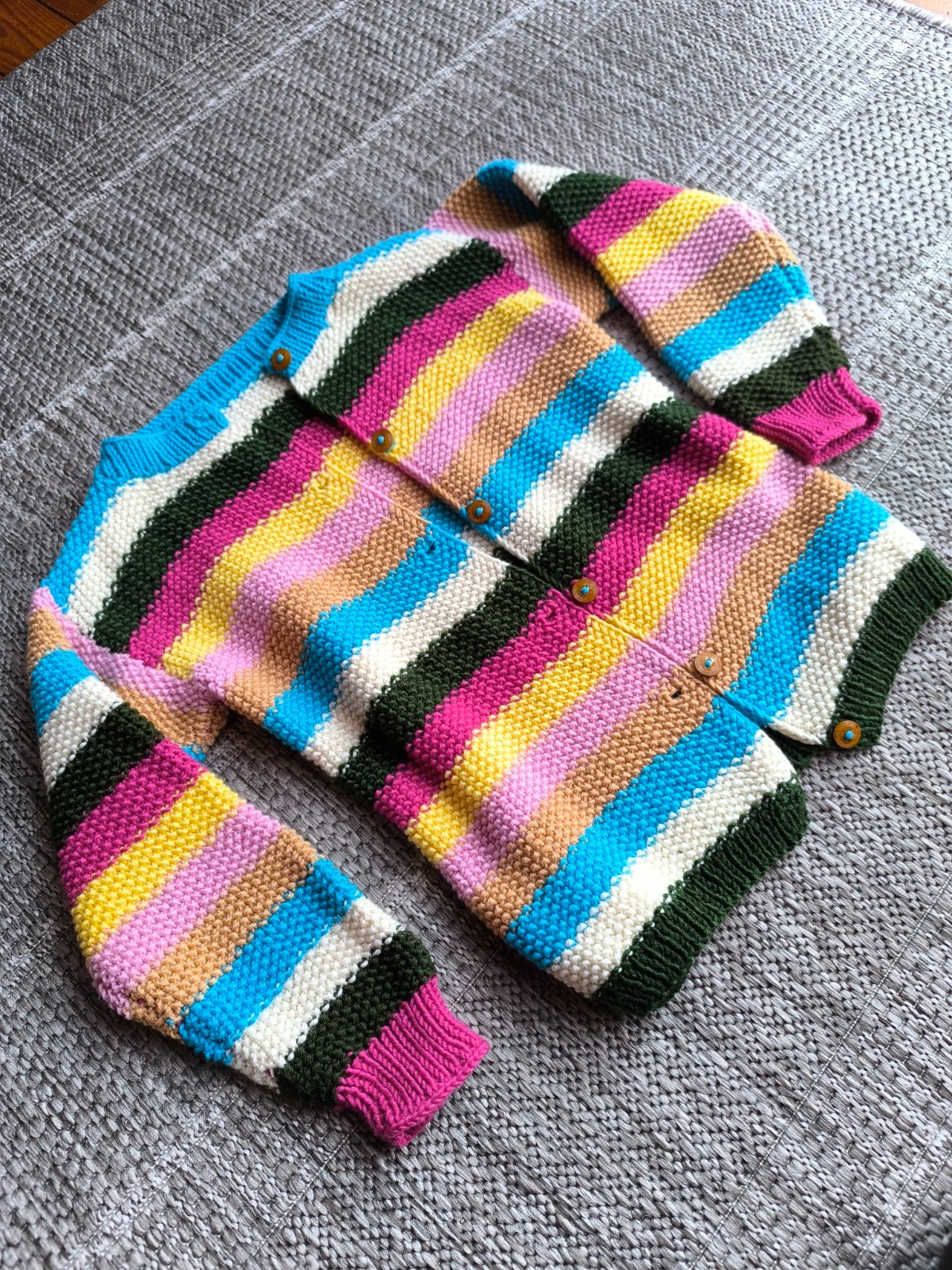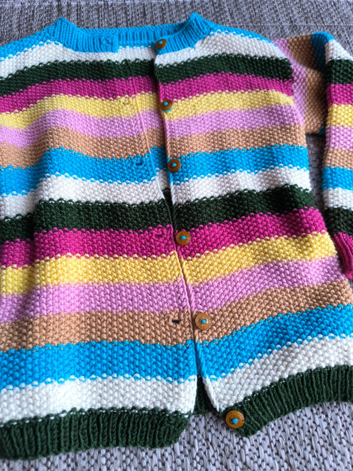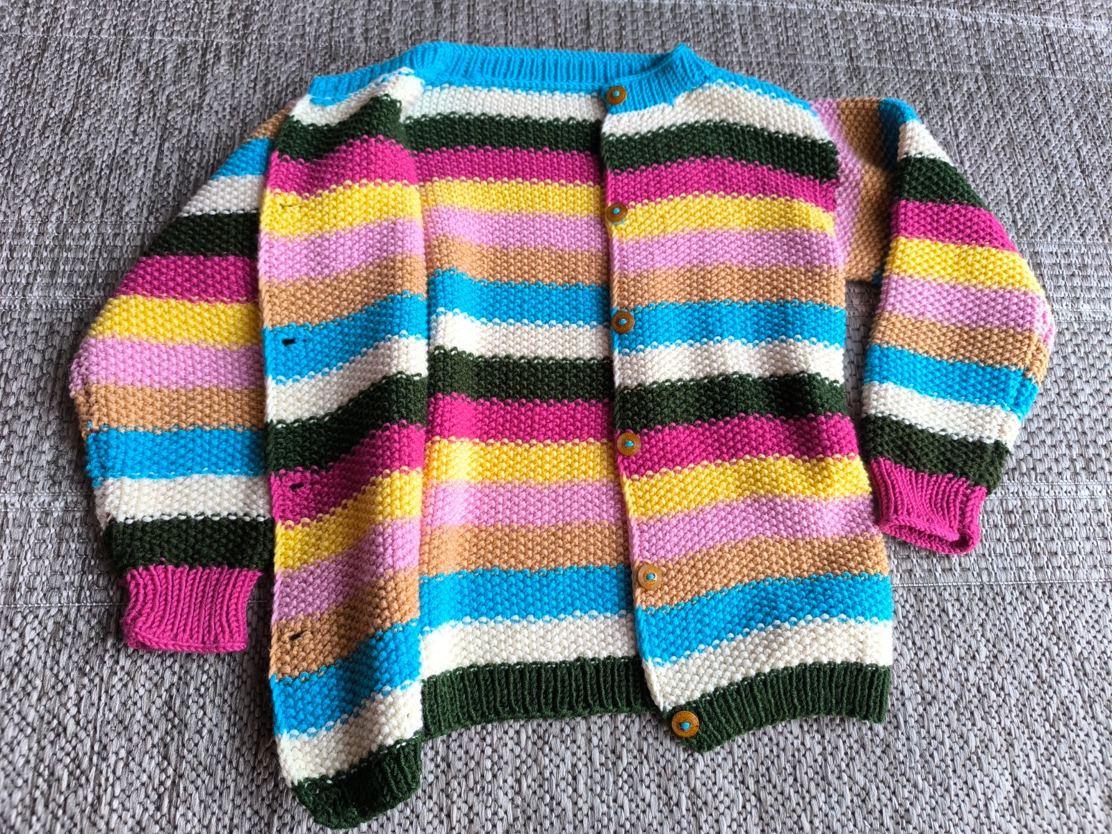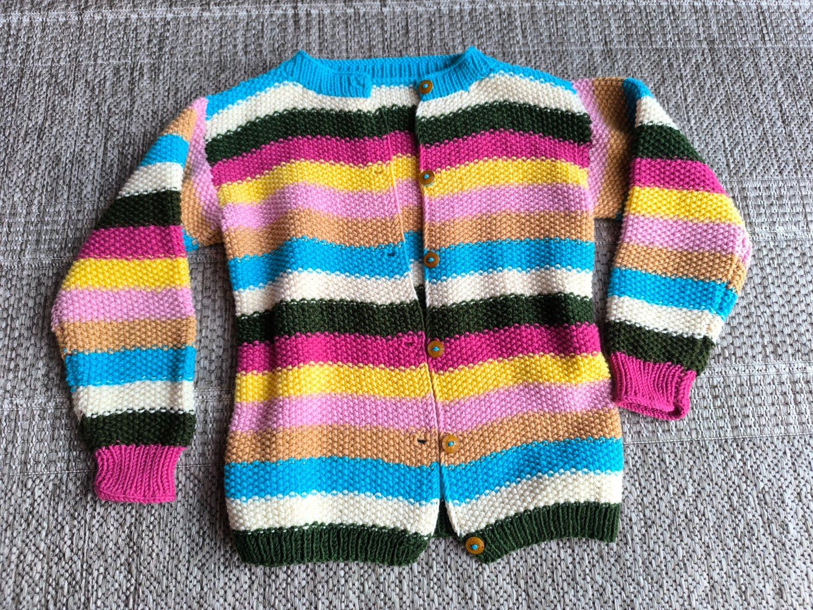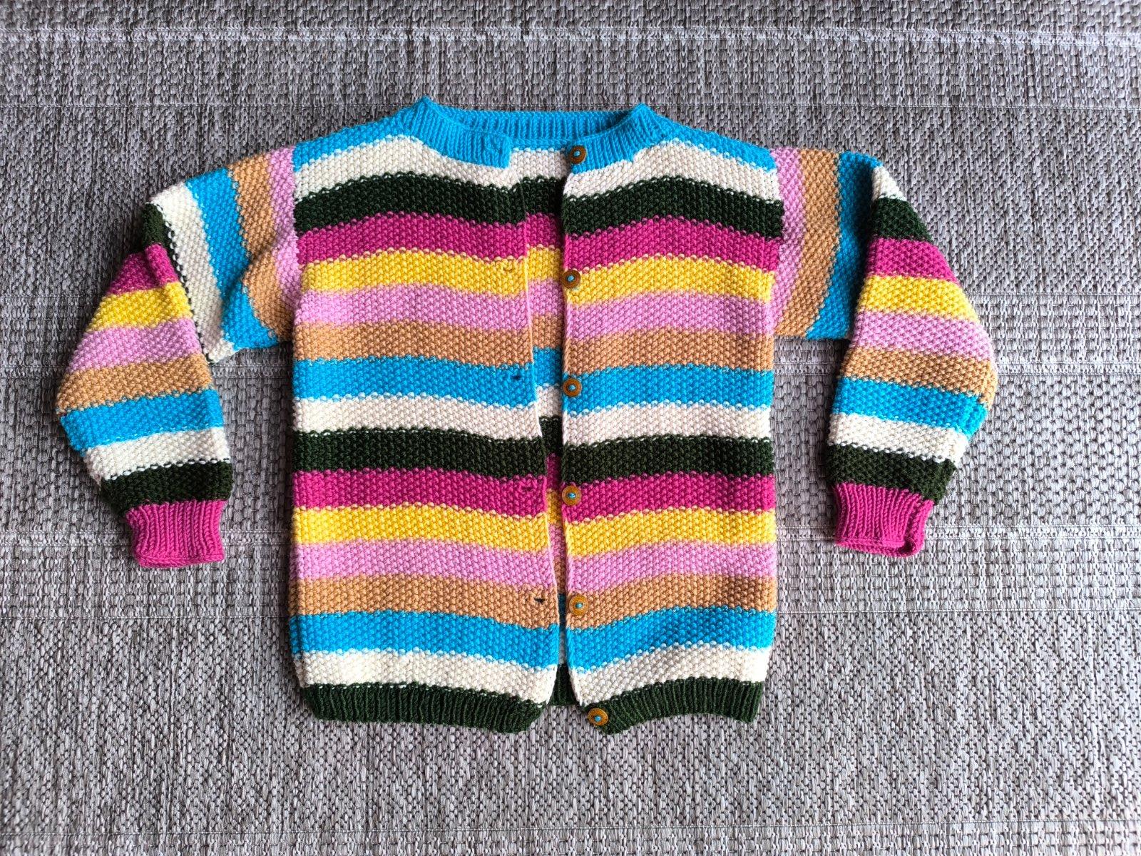 Ručne pletený, handmade, pásikavý sveter na gombíky, veľkosť tak 134-140. Dĺžka 49cm, šírka 36cm, rukáv od ramena 40cm.