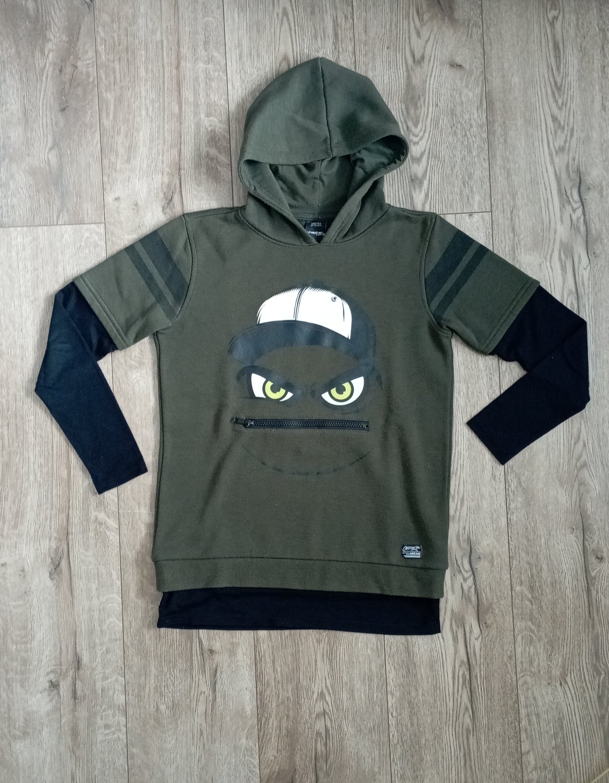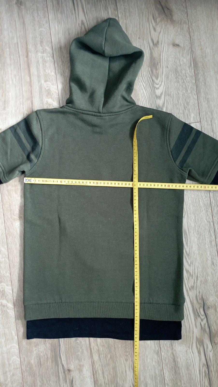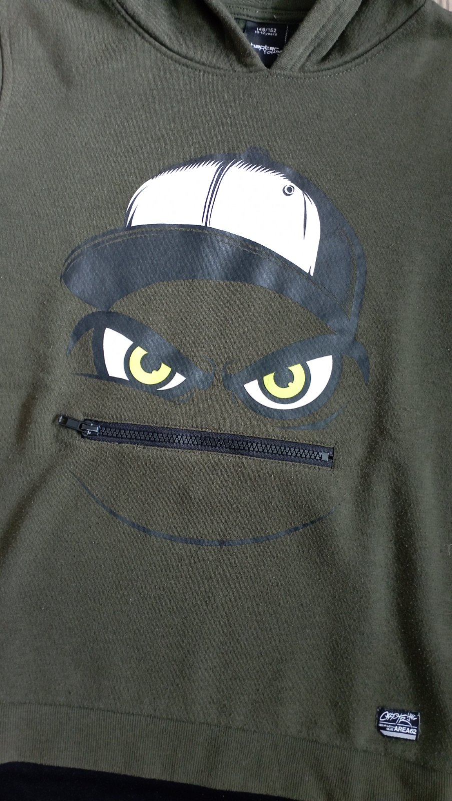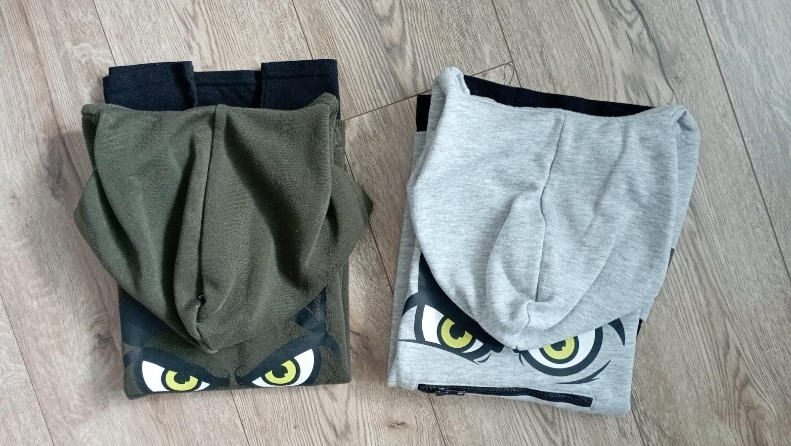 Bežné známky nosenia, už aj žmolky vidím. Syn ju nosil rád, no už mu začína byť malá. Veľkosť uvedená 146/152. Máme rovnakú svetlú sivú (viď posledná fotka).