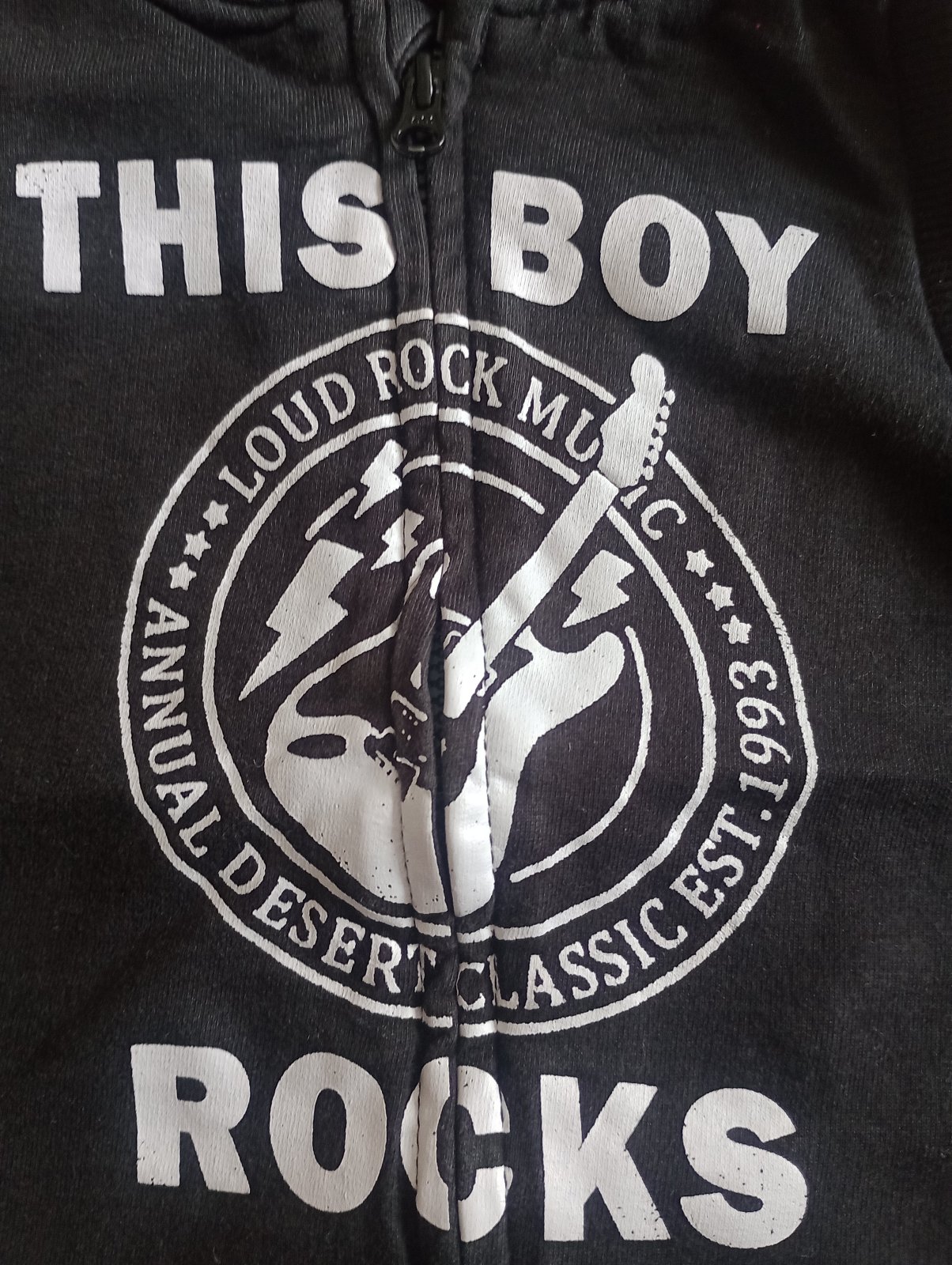 Nosená, čierna farba trošku vyblednuté, inak stále pekná pre malého rockerka.