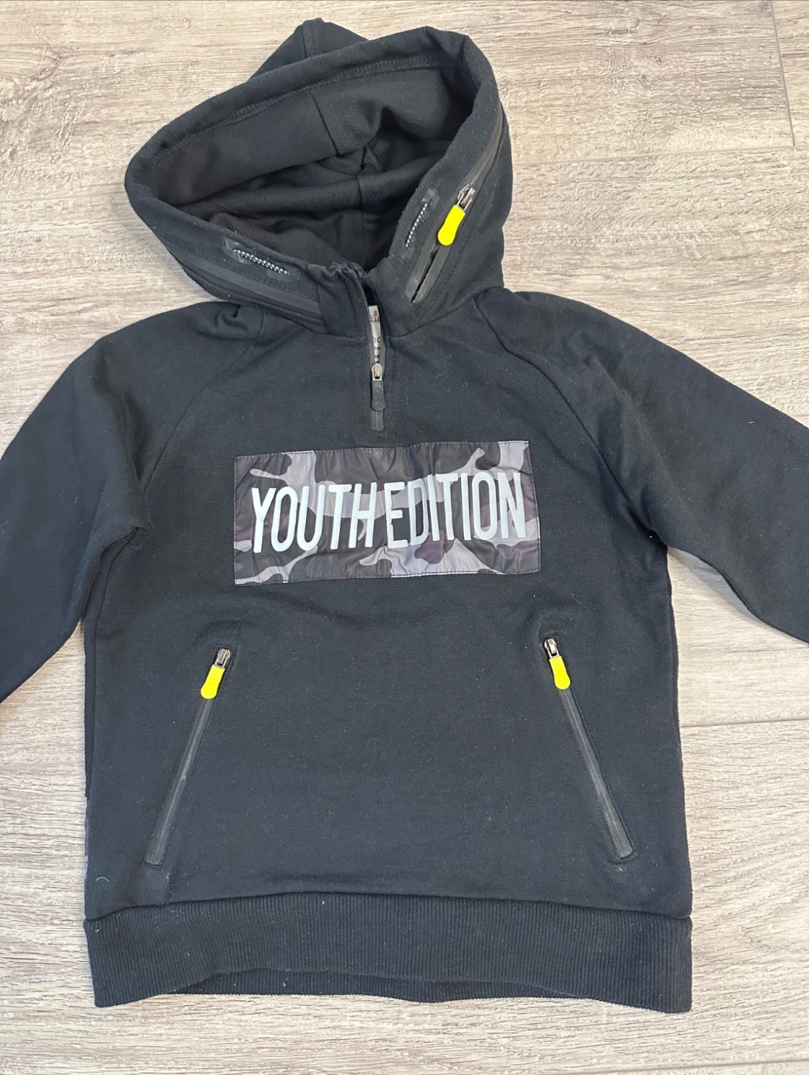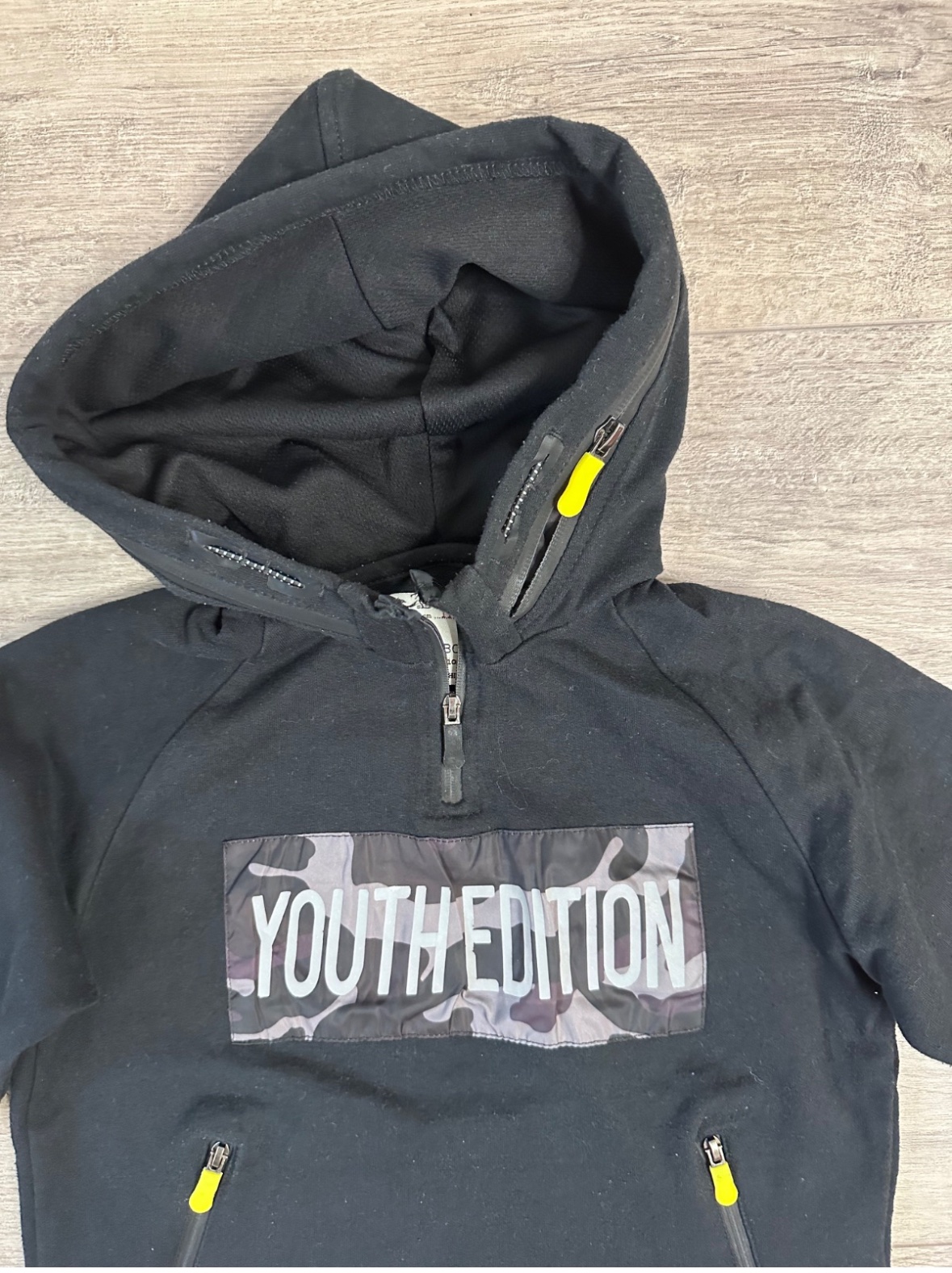 Ma dvojitú kapucňu. Po odopnuti kapucne sa zmení látková časť kapucne na šušťakovú, maskáčovú..