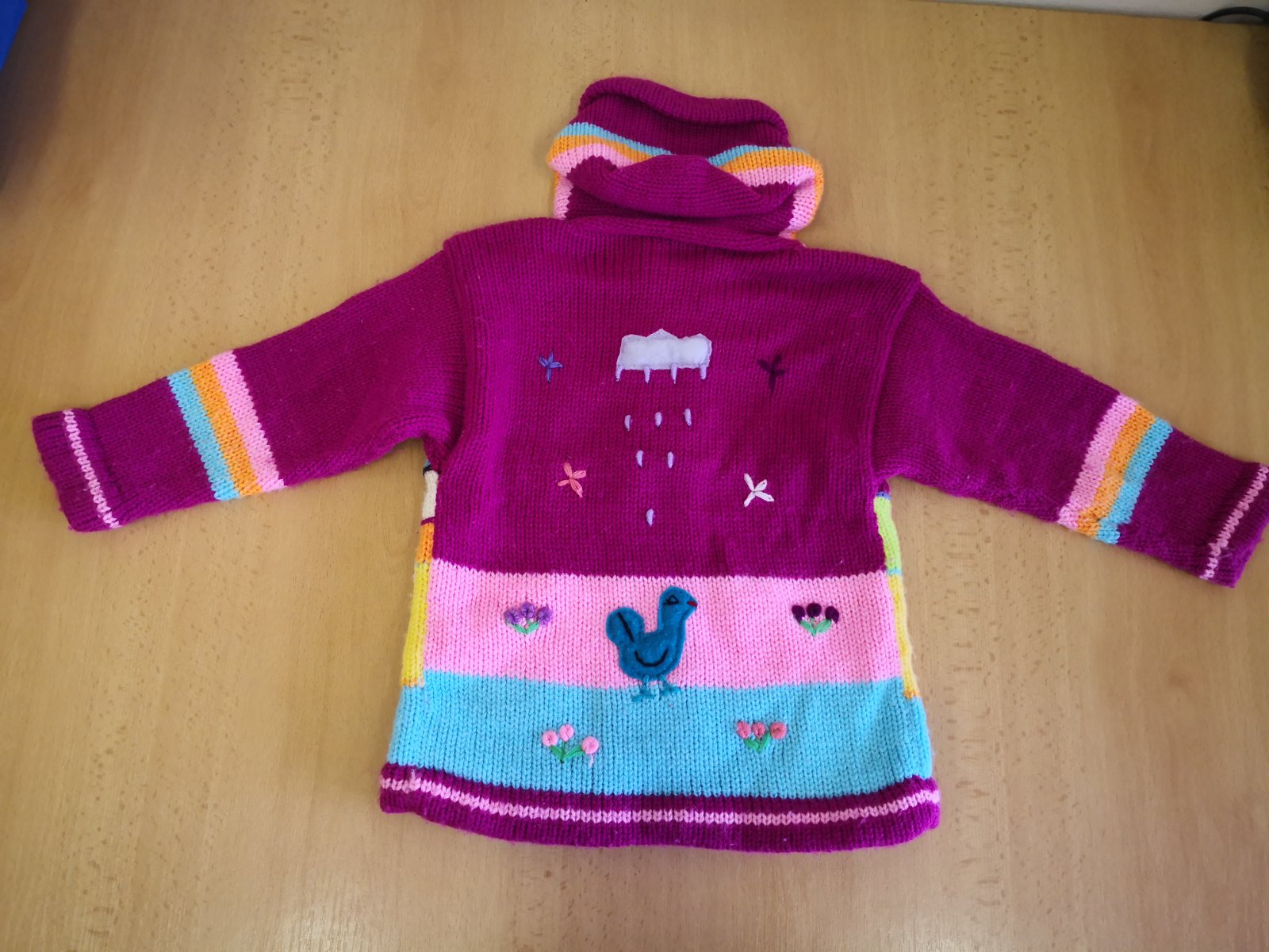 Nosený veselý svetrík, veľkostne odhadujem na cca 3-4 roky, možno dlhšie. Od pleca dole 37 cm. Pod pazuškami 31 cm. Jedinečný. Zapínanie na zips.