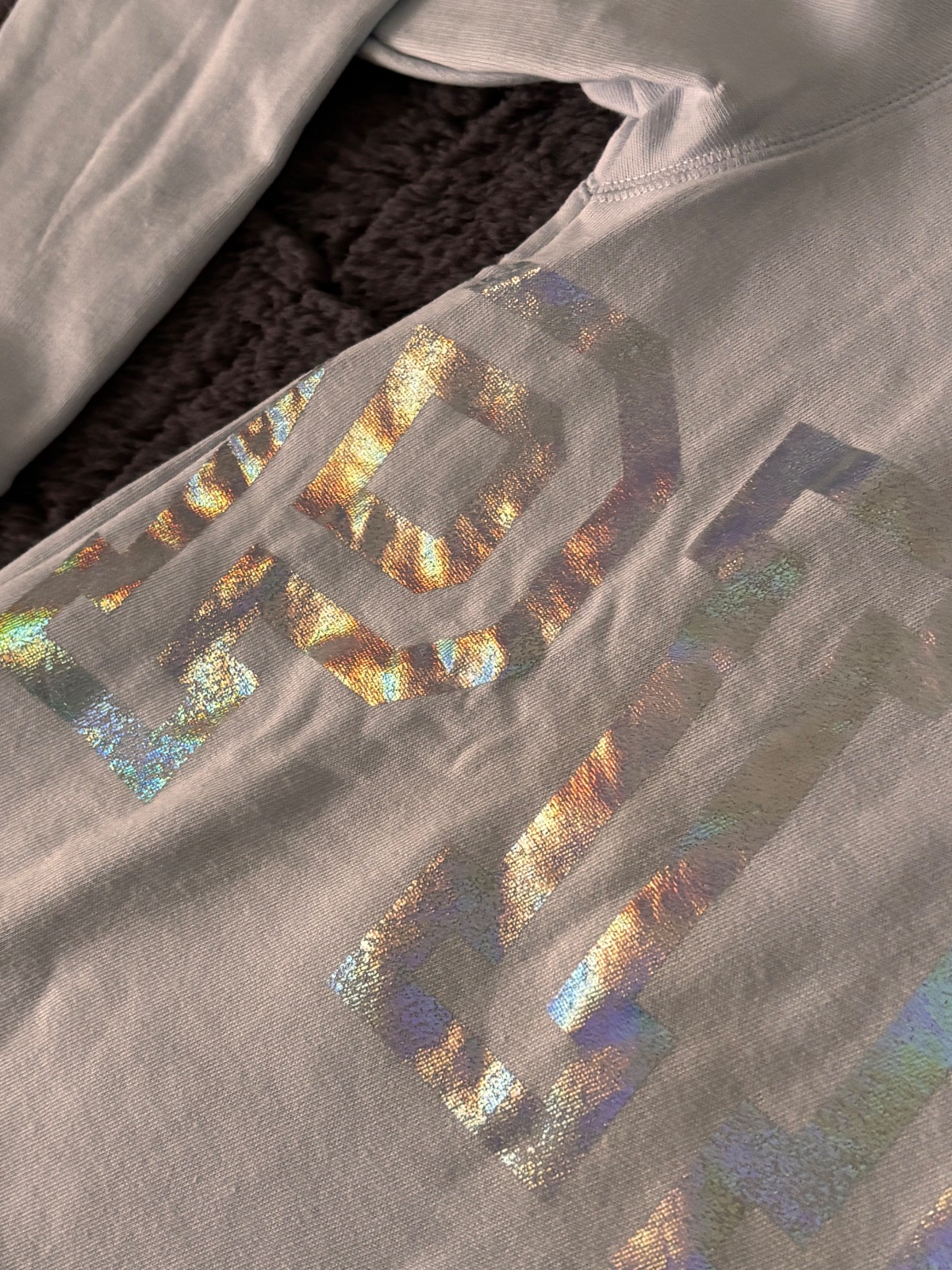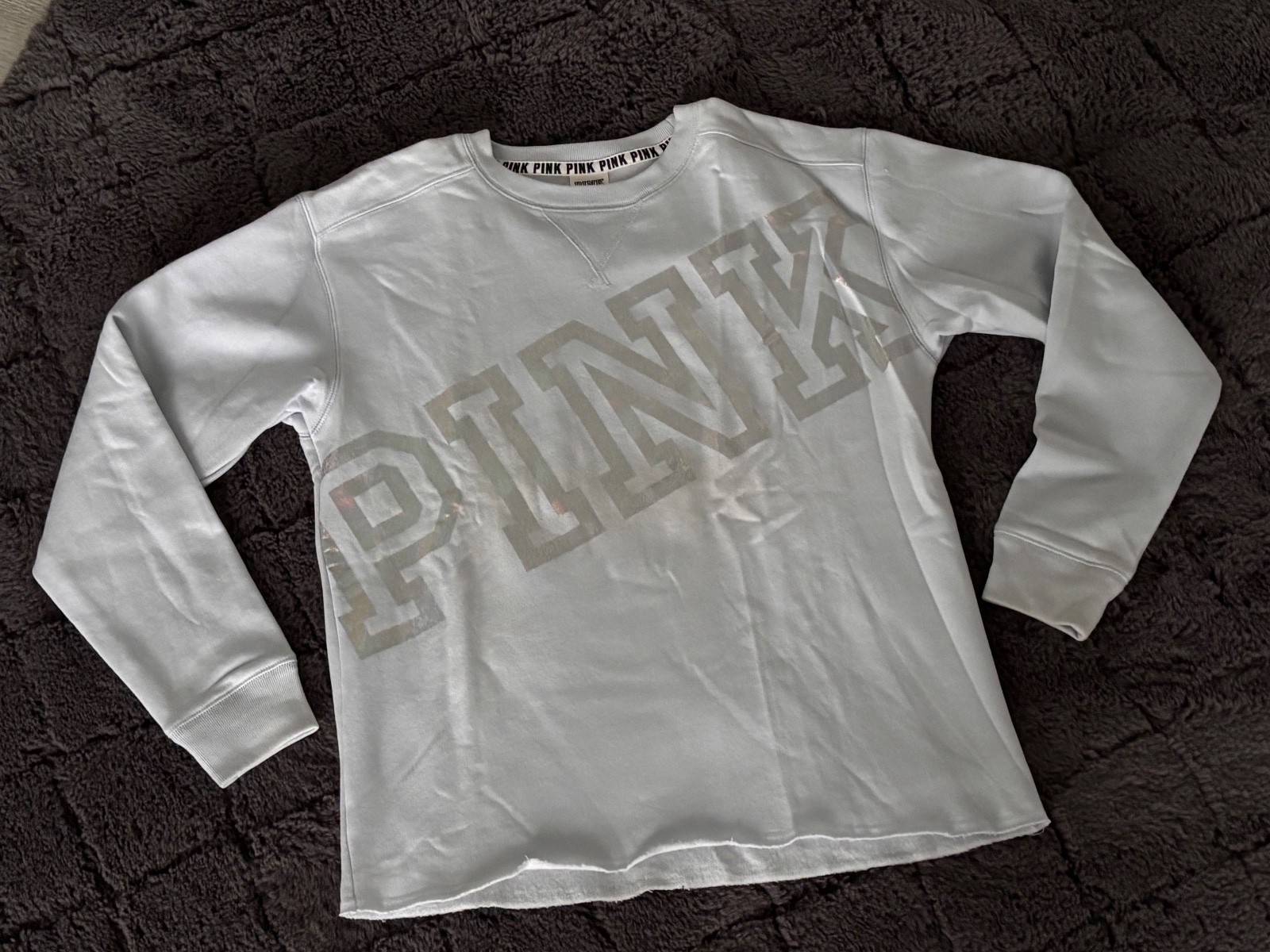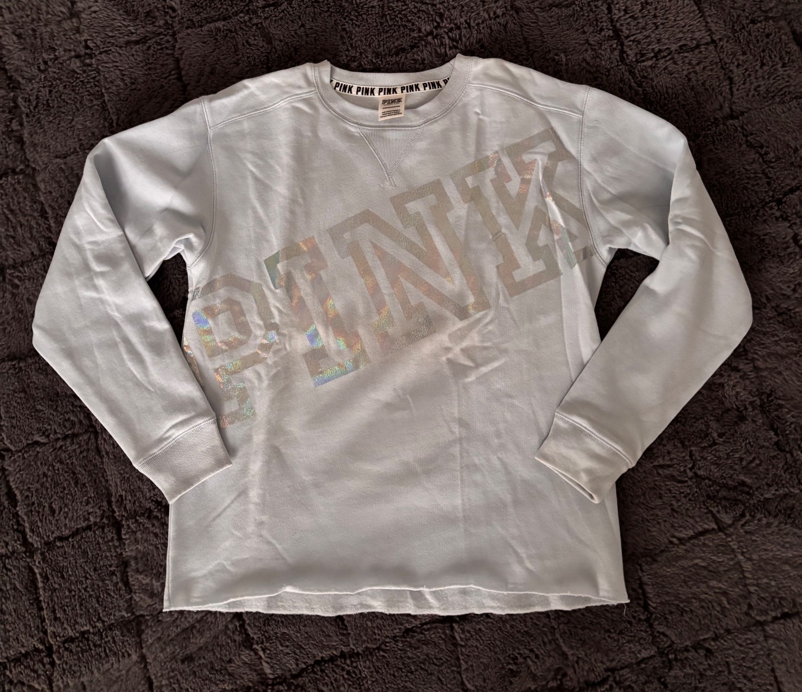 Svetlomodrá mikina Victoria’s Secret. Predny diel veľký holograficky nápis. Velkost XS oversize. Nová, len skladovaná.