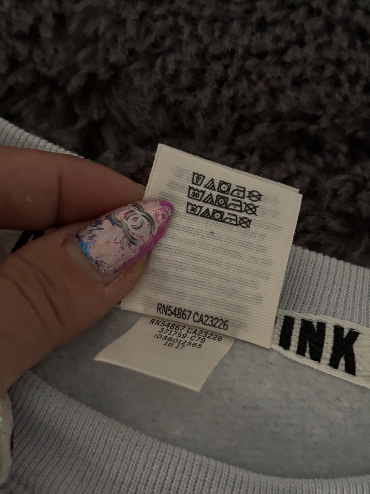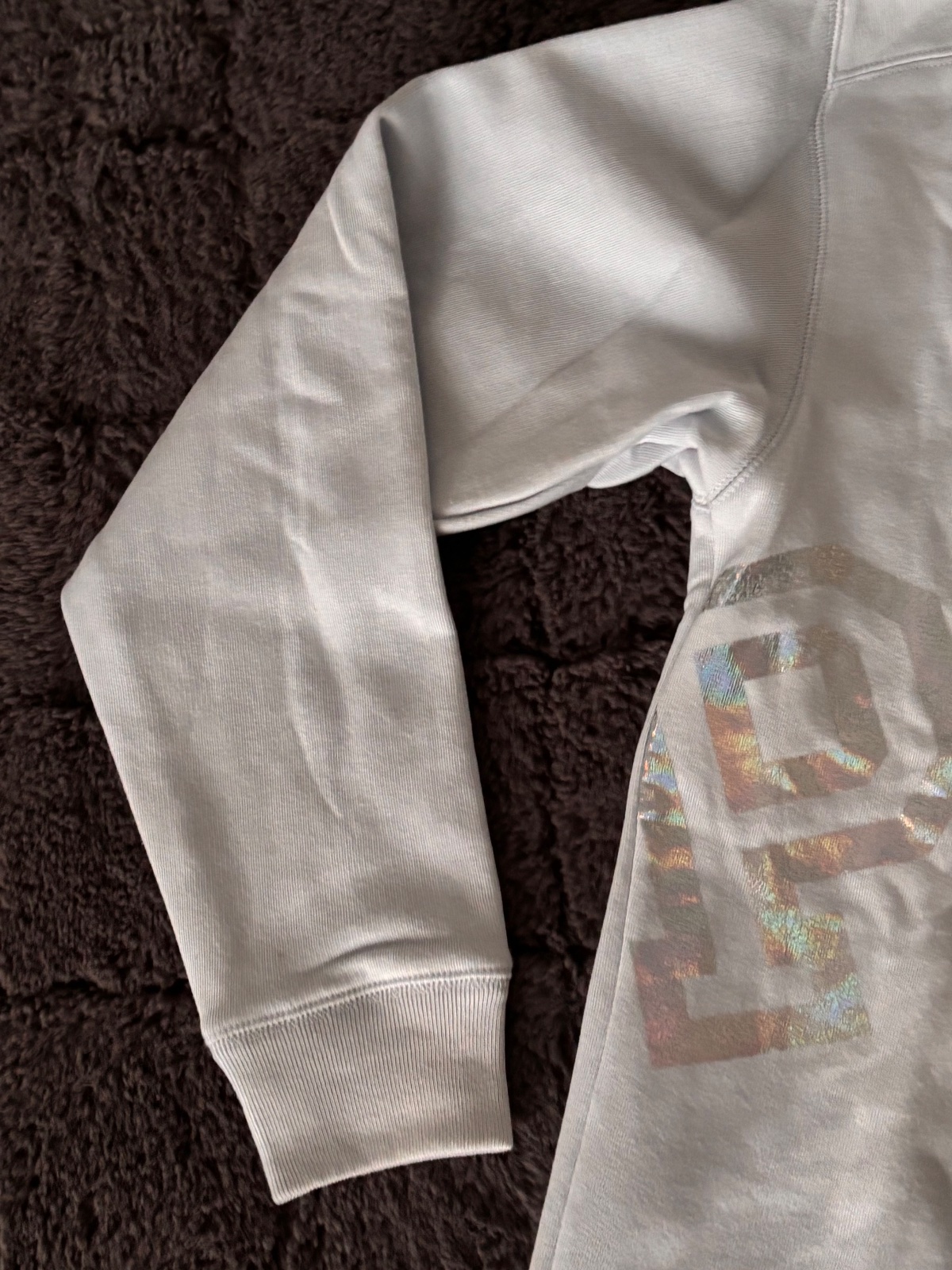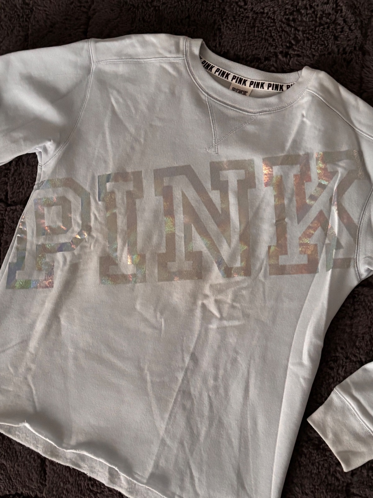 Svetlomodrá mikina Victoria’s Secret. Predny diel veľký holograficky nápis. Velkost XS oversize. Nová, len skladovaná.