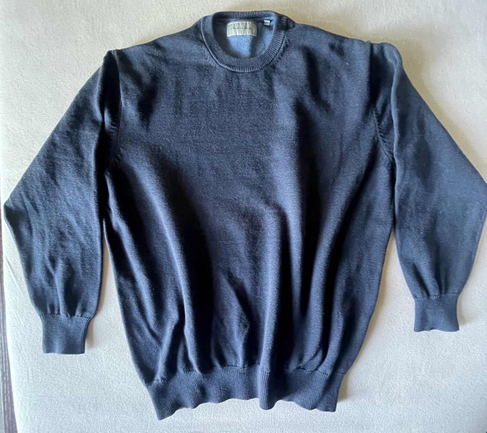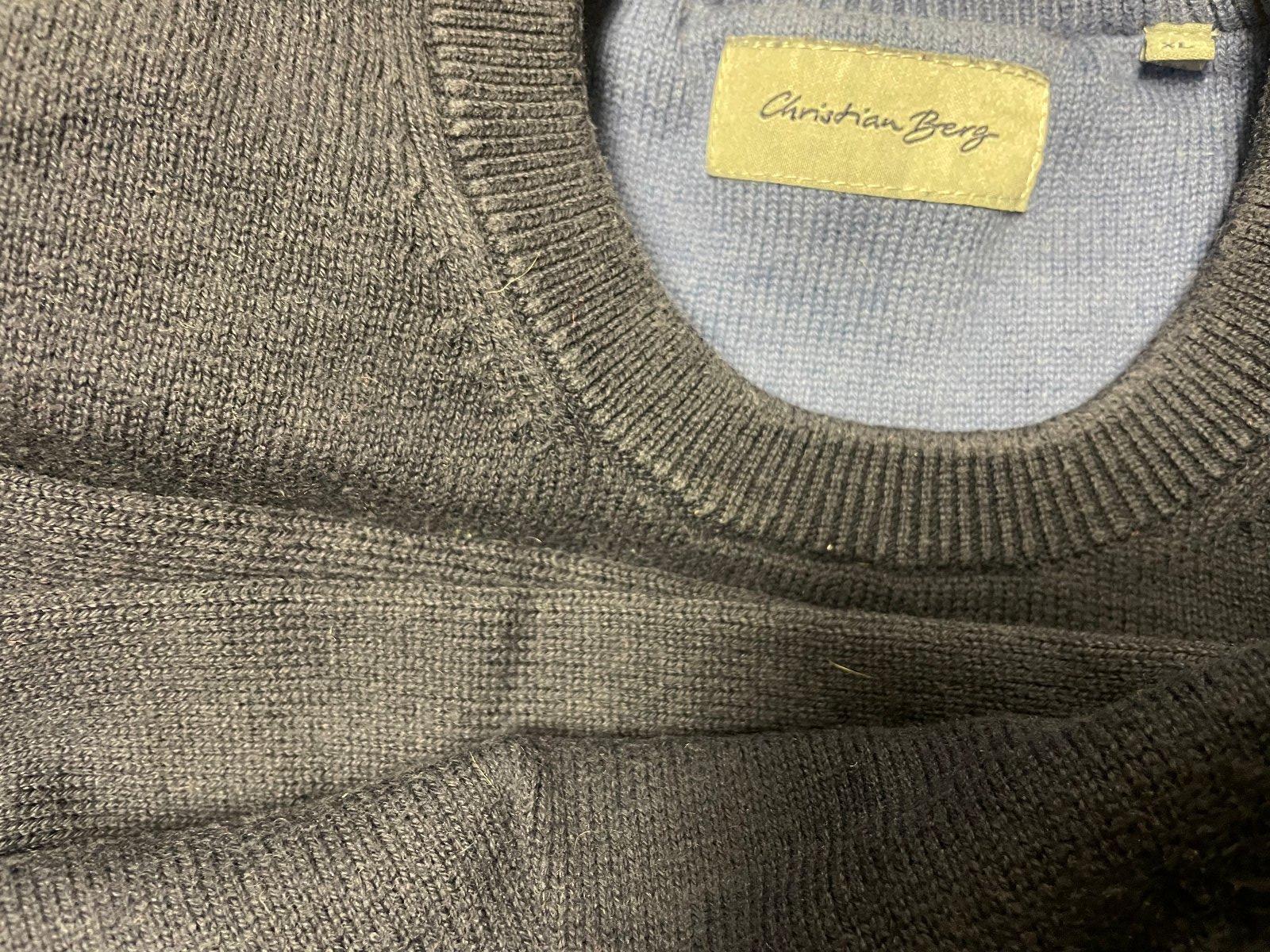 Pánsky tmavomodrý sveter Christian Berg. Veľkosť XL. Rozmery: dĺžka 65 cm, šírka v podpazuší 2x58 cm, dĺžka rukáva od podpazušia 43 cm a od ramena 53 cm.